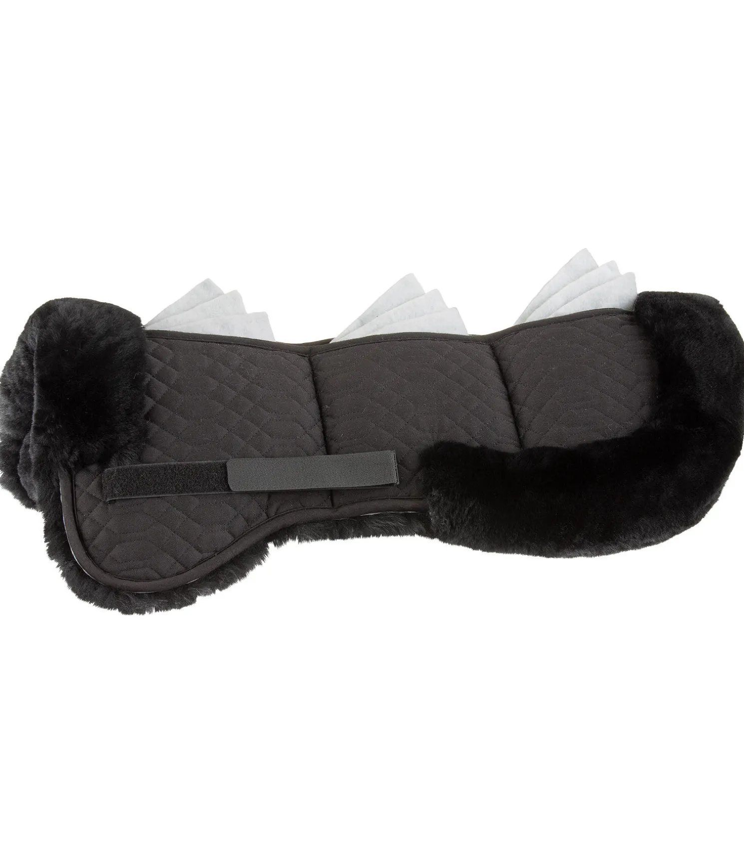 Amortisseur pour équilibrer la selle grâce à plusieurs pads. 6 poches avec fermeture à glissière. Chaque poche contient 3 pads en feutre pouvant être utilisés indépendamment. Bordé et entièrement doublé de fourrure d’agneau à tannage médical. Le long de la colonne vertébrale, la fourrure d’agneau est plus courte pour permettre un mouvement optimal des vertèbres. Passant de contre-sanglons avec patte auto-agrippante. Longueur de dos 65 cm. Fourrure 100 % agneau mérinos, tissu matelassé : 70 % polyester, 30 % coton, rembourrage 100 % polyester. Lavable à 30 degrés programme d’entretien de la laine. Laver uniquement avec une lessive spéciale fourrure d’agneau. Ne pas mettre au sèche-linge.