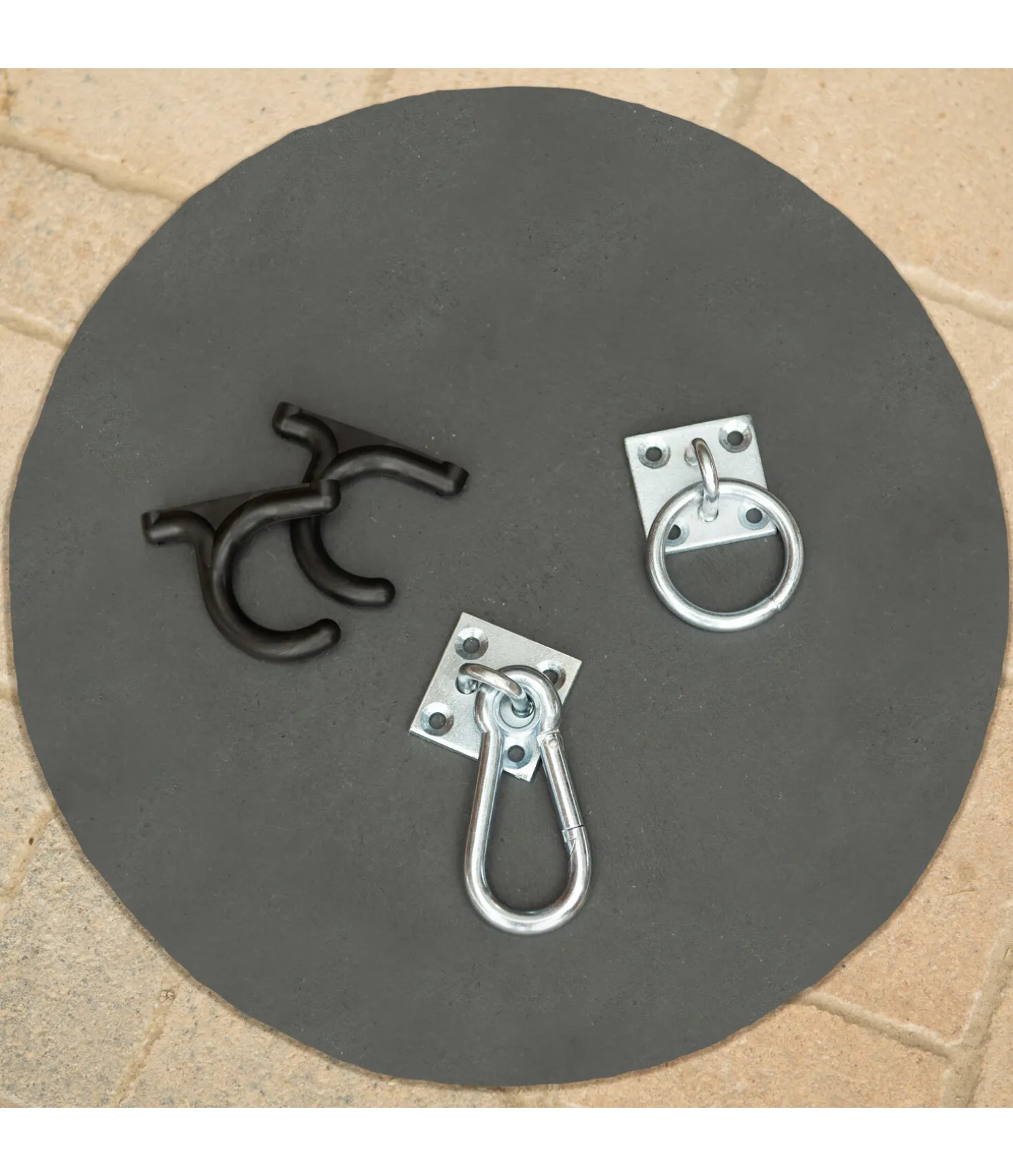 Zingué, qualité excellente, plaque avec 4 trous de fixation.