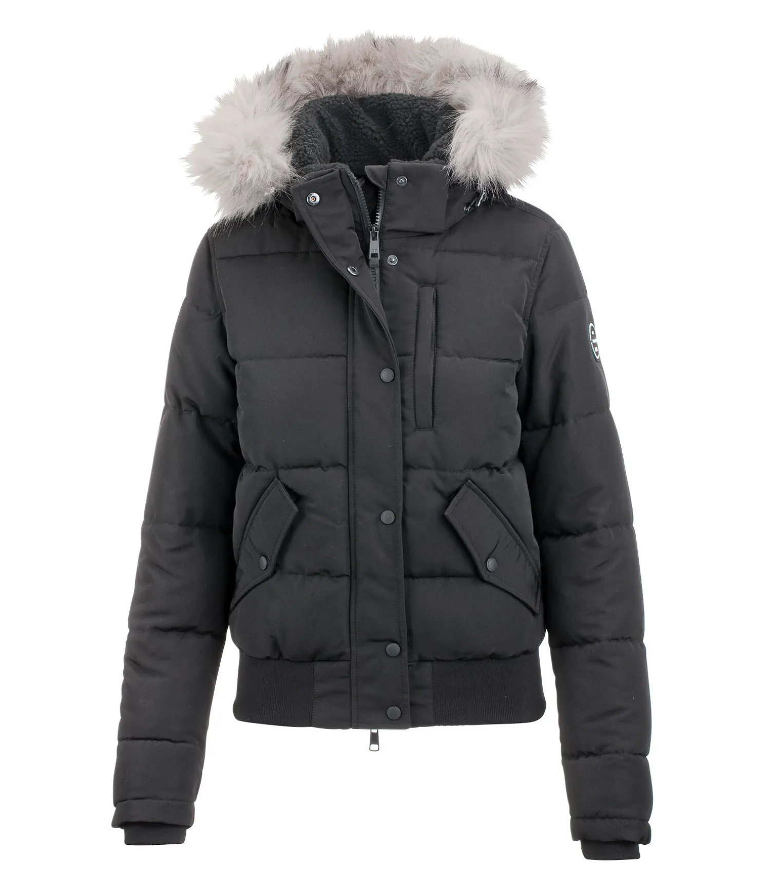 Blouson d’équitation matelassé sportswear, déperlant et coupe-vent. Capuche amovible et réglable avec bordure en fourrure synthétique amovible. Garnissage chaud imitation duvet. Doublure en sherpa à l’intérieur du col et de la capuche. Fermeture à glissière double sens dissimulée avec protège-menton. Deux poches latérales avec boutons- pression et une poche zippée sur la poitrine. Finition en bord-côte en bas des manches et à la taille. Motifs gaufrés discrets à l’intérieur. Poches doublées en polaire. 100 % Polyester.