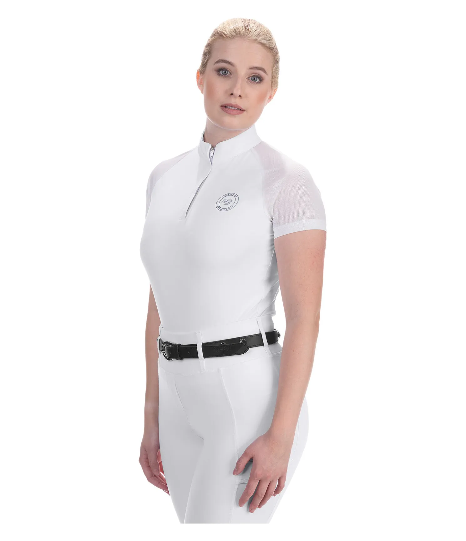 Body de concours extensible avec empiècements et manches en mesh. Col montant avec fermeture à glissière dissimulée. La fermeture par boutons-pression à l’avant évite les frottements et empêche que le vêtement glisse. 83 % polyester, 17 % élasthanne.