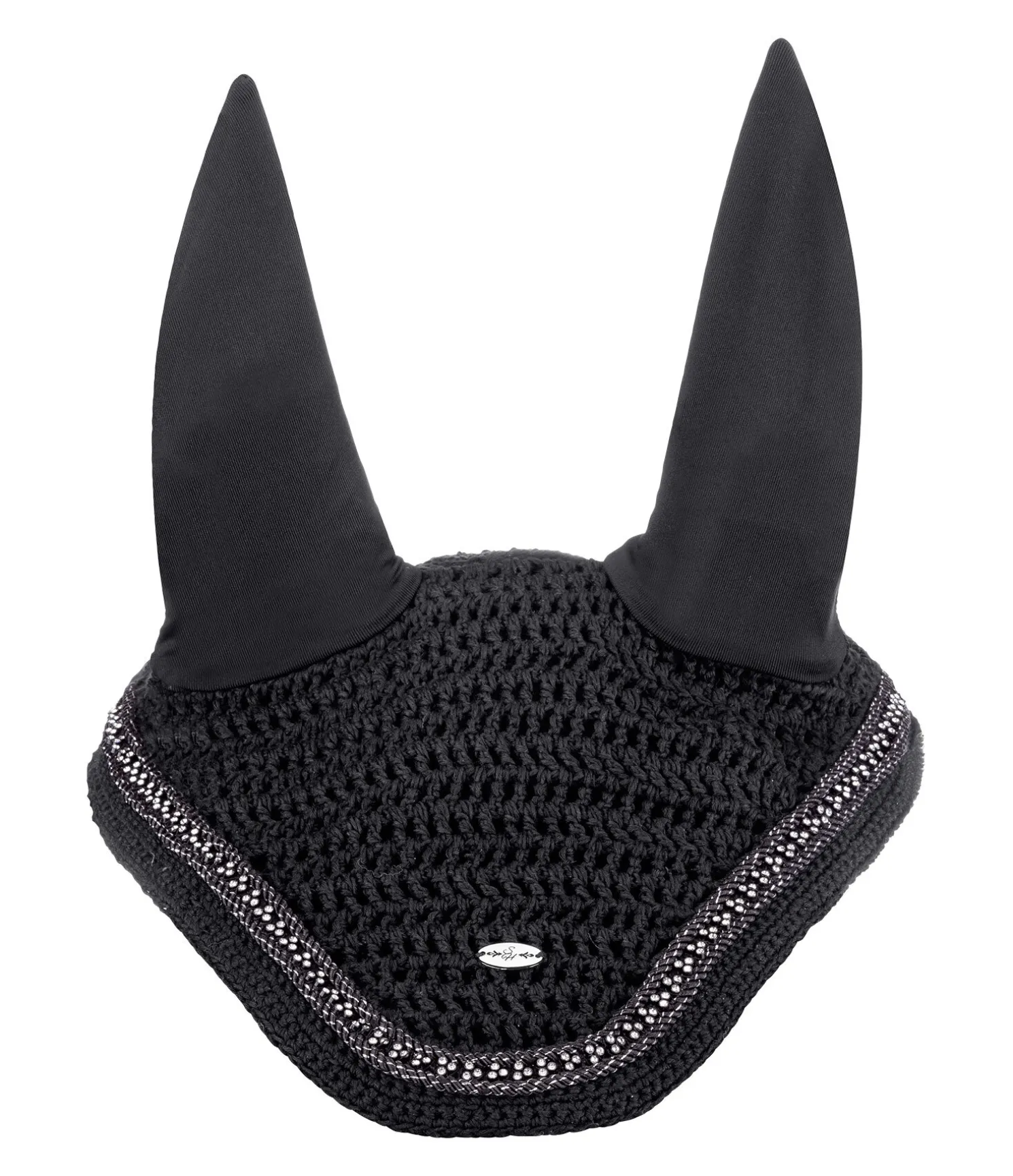 Bonnet anti-mouches en large maille crochetée orné de petits strass et d’un double cordon décoratif brillant. Matière extensible aux oreilles pour un confort optimal et plaque logo filigrane argentée. Bonnet 100 % polyester, oreilles 88 % polyester, 12 % élasthanne.