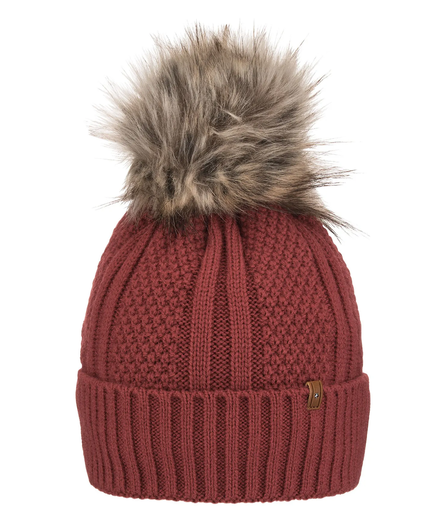 Bonnet à revers en maille avec pompon en fourrure synthétique. Doublure intérieure en polaire chaude. 100 % polyacrylique, doublure 100 % polyester.