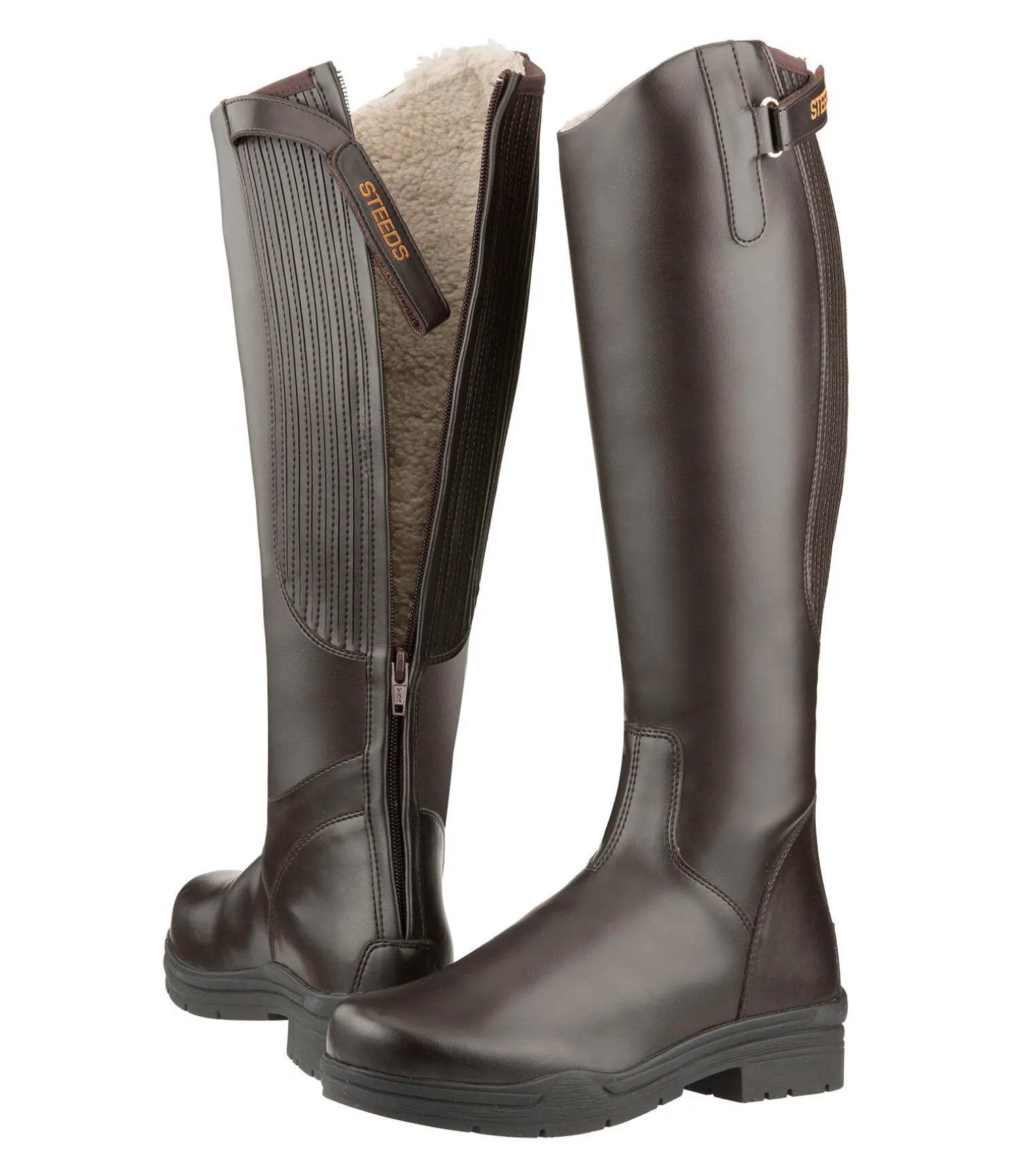 Bottes d’équitation d’hiver robustes. Matière SYLKA souple (matière synthétique très résistante et facile à nettoyer). Doublure intérieure en polaire Teddy chaude (100 % polyester). Inserts élastiques dissimulés de chaque côté de la fermeture à glissière à l’arrière pour adapter parfaitement la botte au contour du mollet. Semelle crantée robuste avec talon cavalier en caoutchouc antidérapant.