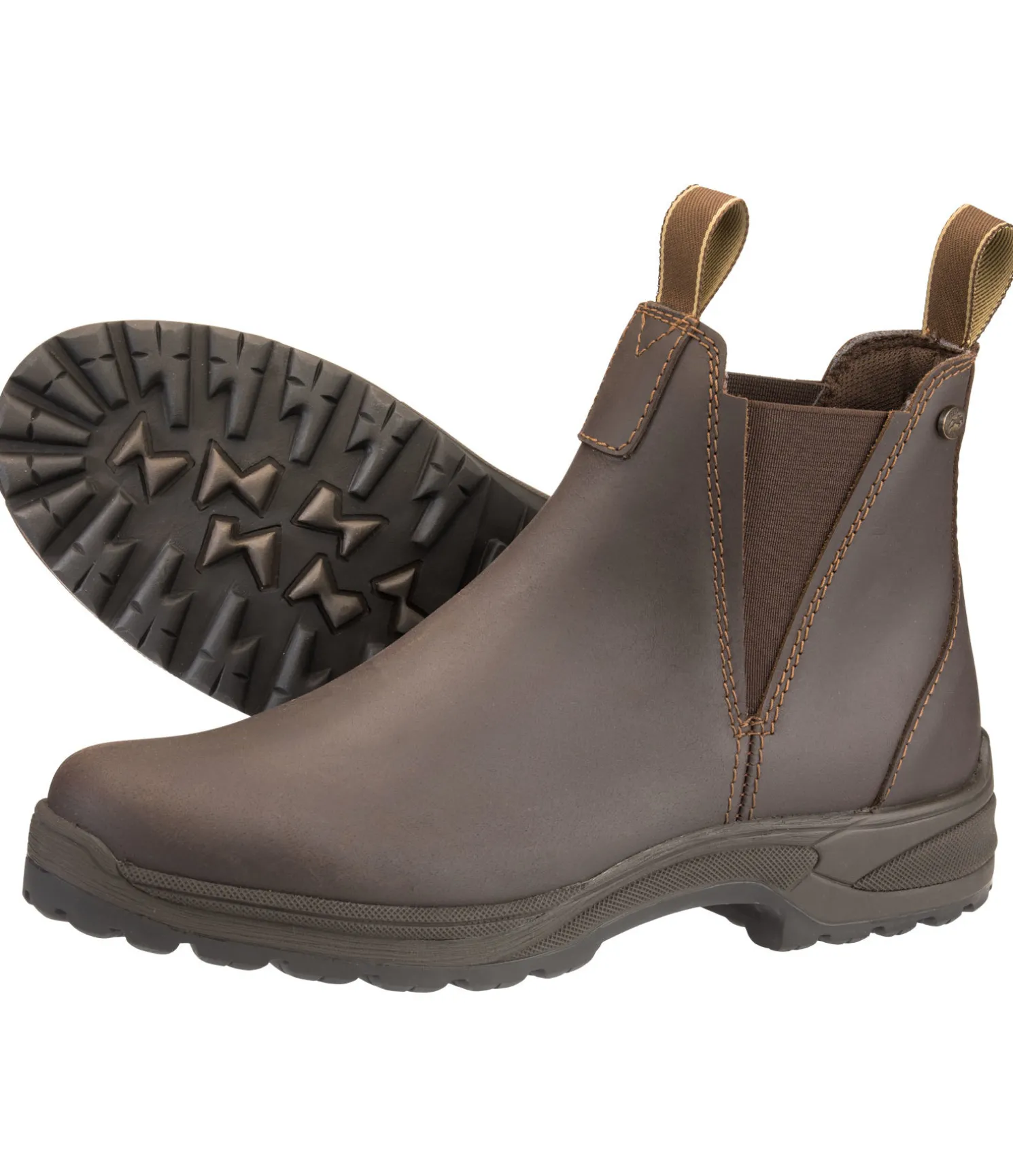 Bottines élégantes et robustes. Cuir gras haut de gamme. Coque en acier certifié EN 12568 pour protéger les orteils. Inserts élastiques en V pour un enfilage et retrait rapides. Confort optimal et maintien sûr assurés. Doublure intérieure en matière respirante (100 % polyester). Semelle crantée en caoutchouc robuste et talon cavalier pour une adhérence parfaite sur les sols glissants et dans les étriers. Semelle intérieure amortissante et amovible. Fabriquées au Portugal.