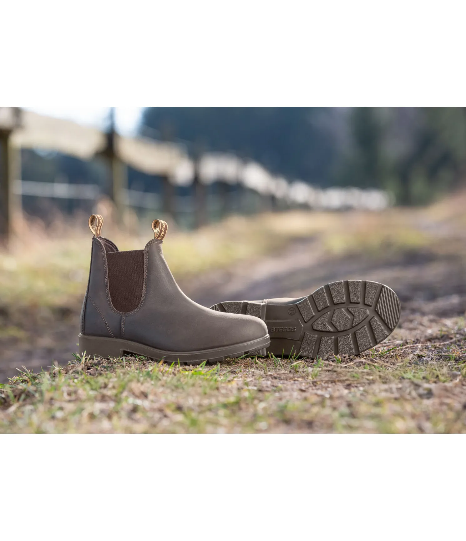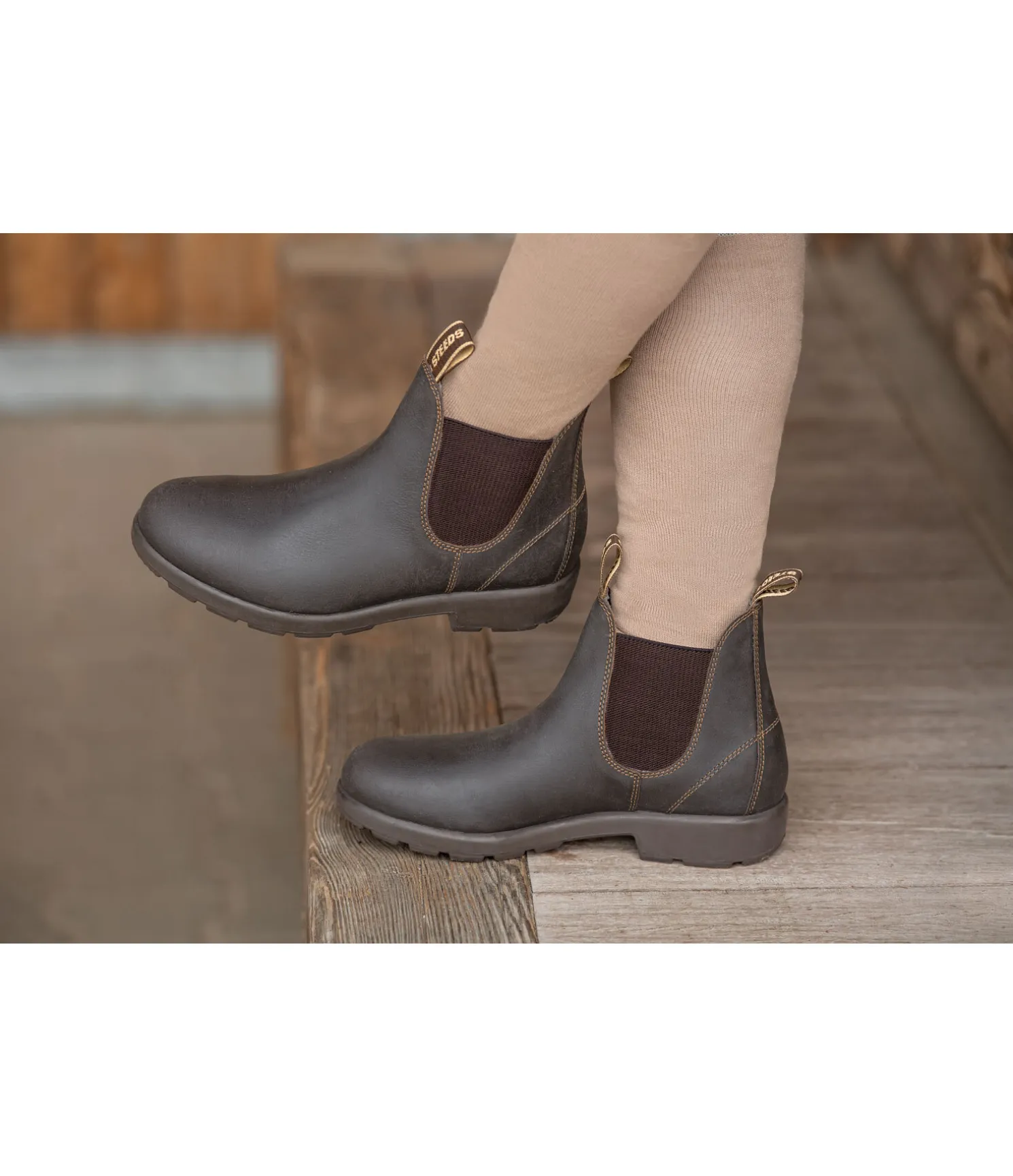 Bottines en cuir gras convenant à toutes les utilisations, que ce soit pour la promenade à cheval, le travail à l’écurie ou pour flâner. Les empiècements élastiques latéraux ainsi que les tirants avant et arrière permettent d’enfiler et de retirer les chaussures facilement. La semelle crantée en caoutchouc antidérapant avec talon cavalier offre une adhérence optimale. Doublure intérieure en tissu textile respirant (100 % polyester).