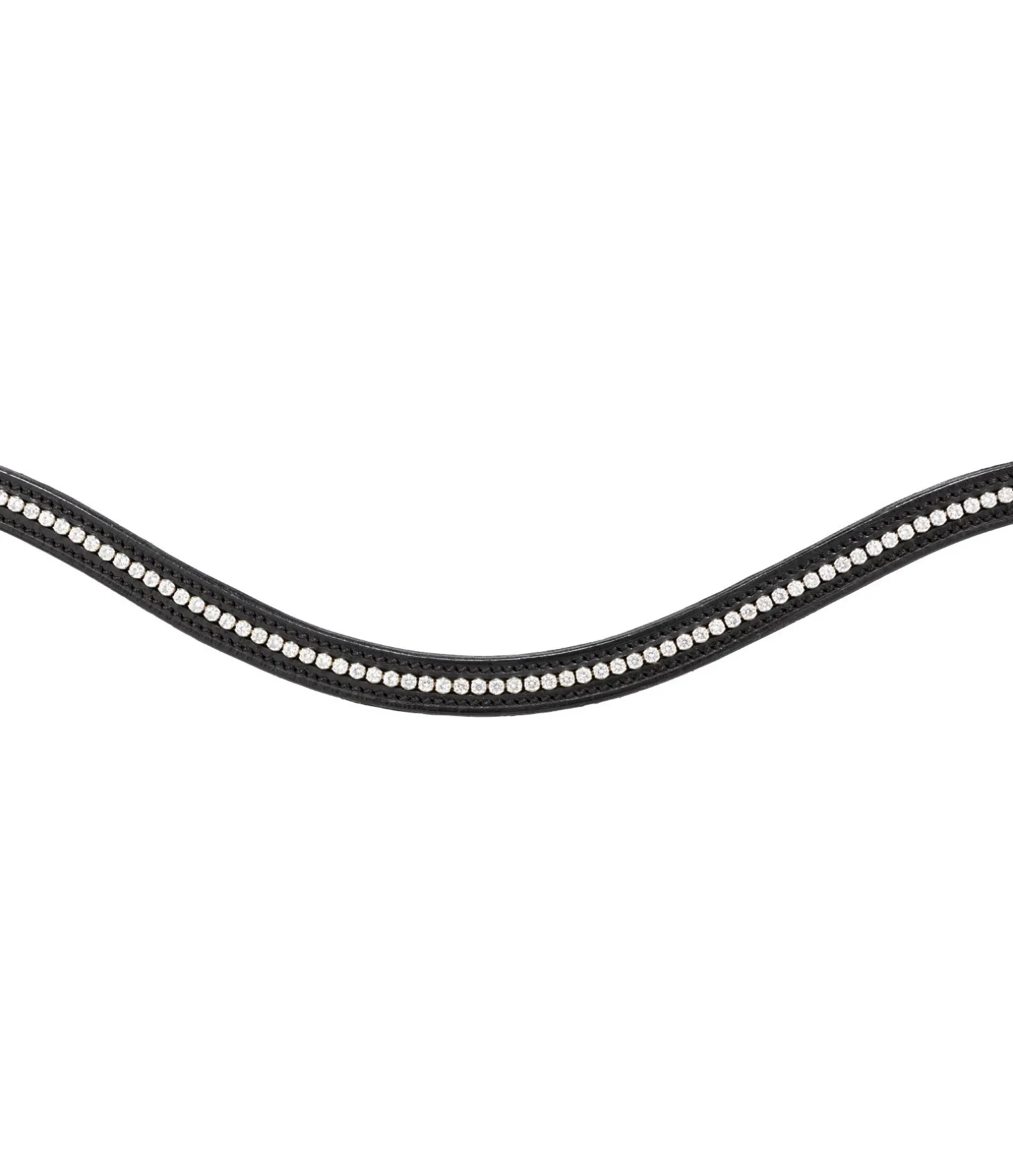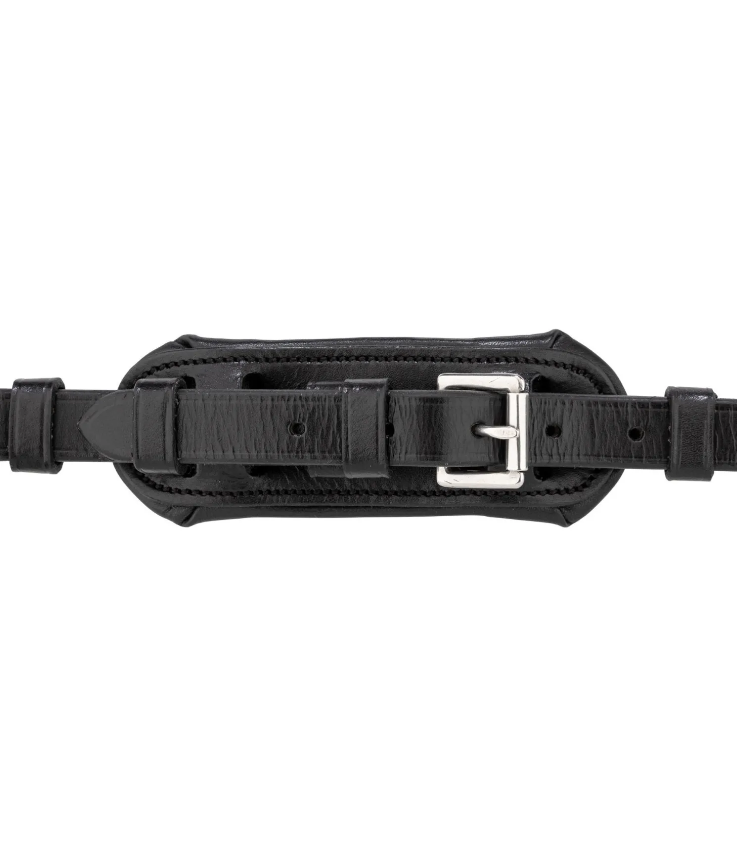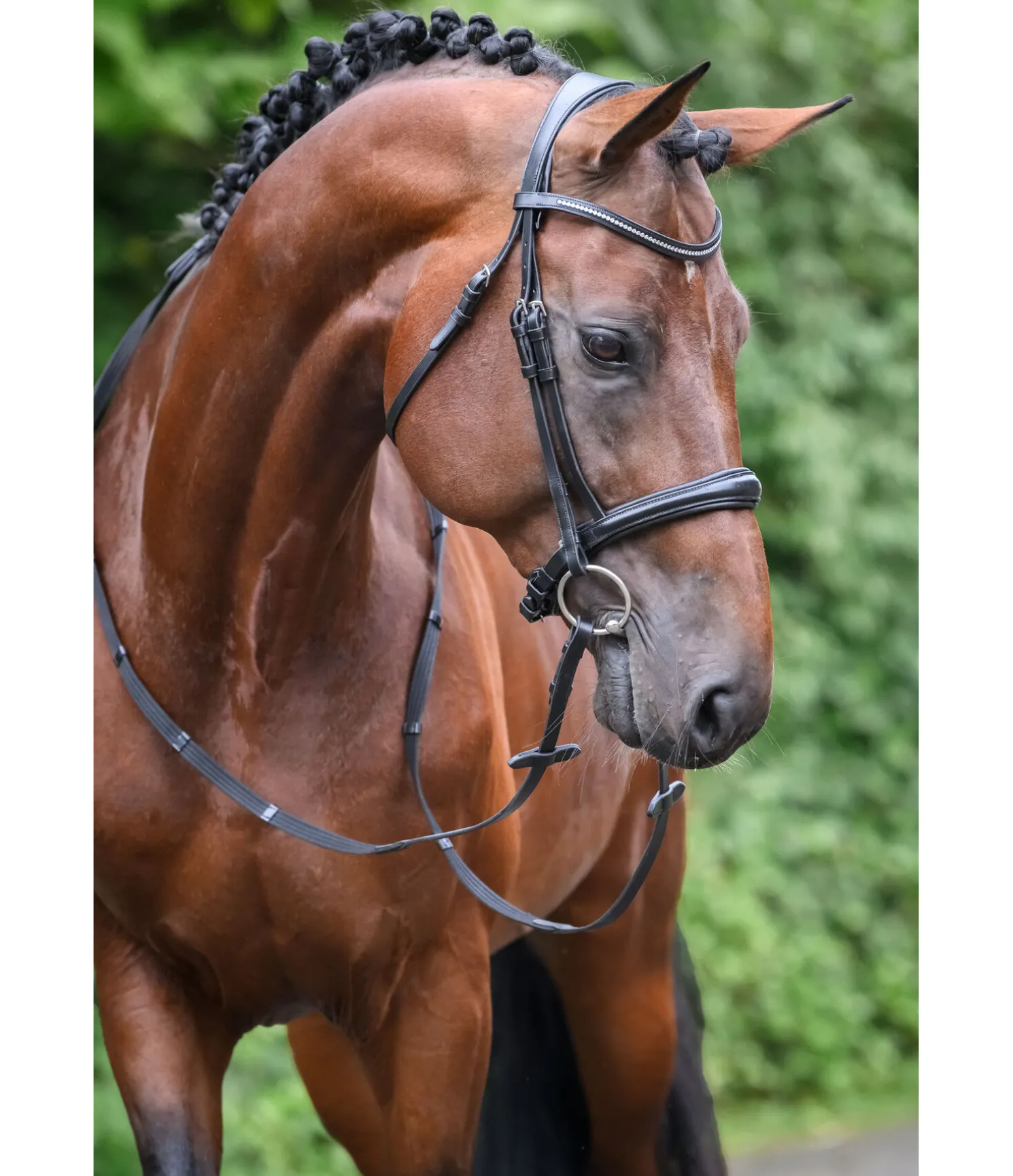 Bridon de grande qualité avec muserolle suédoise et noseband. La lanière en forme de T permettant de fixer le noseband peut être enlevée lorsqu’elle ne sert pas. Cela permet de ne pas laisser une boucle de cuir disgracieuse lorsque le noseband n’est pas fixé à la muserolle. Frontal vague orné de strass blancs discrets. Têtière anatomique avec découpe aux oreilles et frontal avec rembourrage supplémentaire, parfait pour les chevaux sensibles. Fermetures à crochets. Bouclerie argentée. Avec rênes sangle, sans mors.