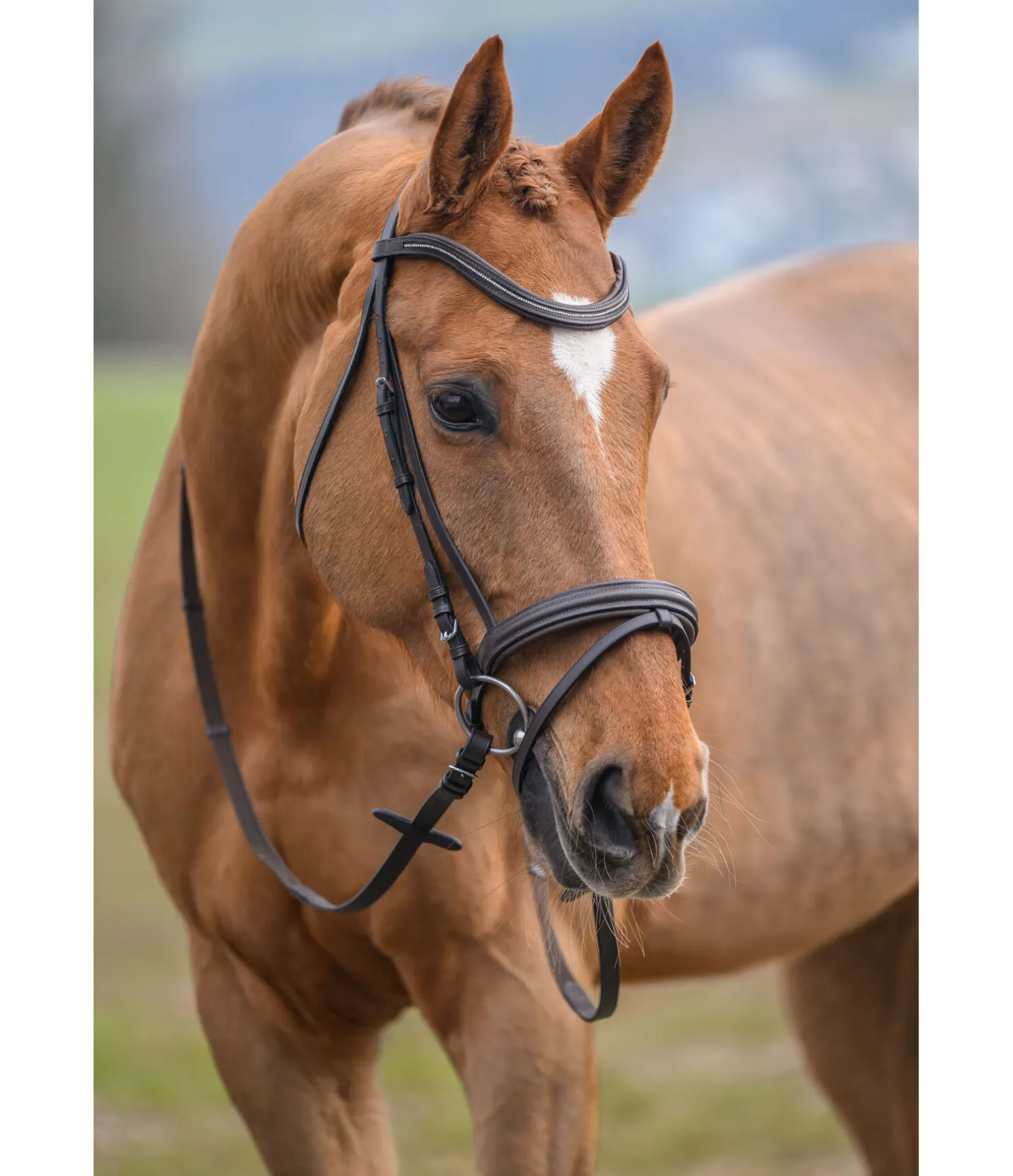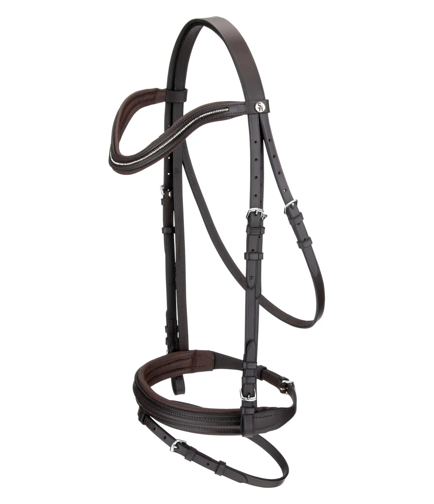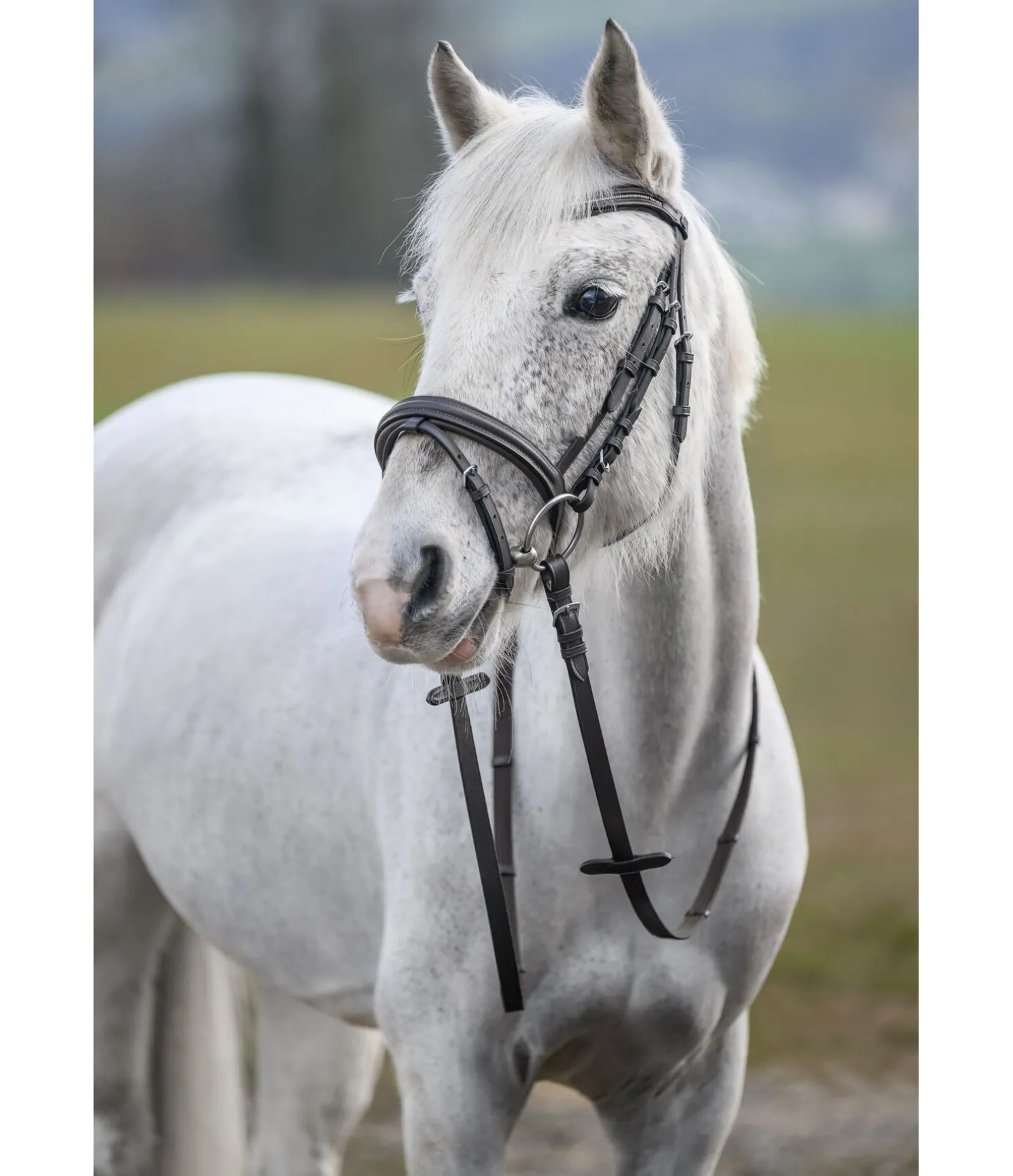 Adorable bridon avec muserolle combinée, conçu spécialement pour les mini-shetlands. Têtière et muserolle avec coupe droite, muserolle avec doublure douce. Frontal vague avec de nombreux strass scintillants. Bouclerie argentée. Avec rênes sangle, sans mors.