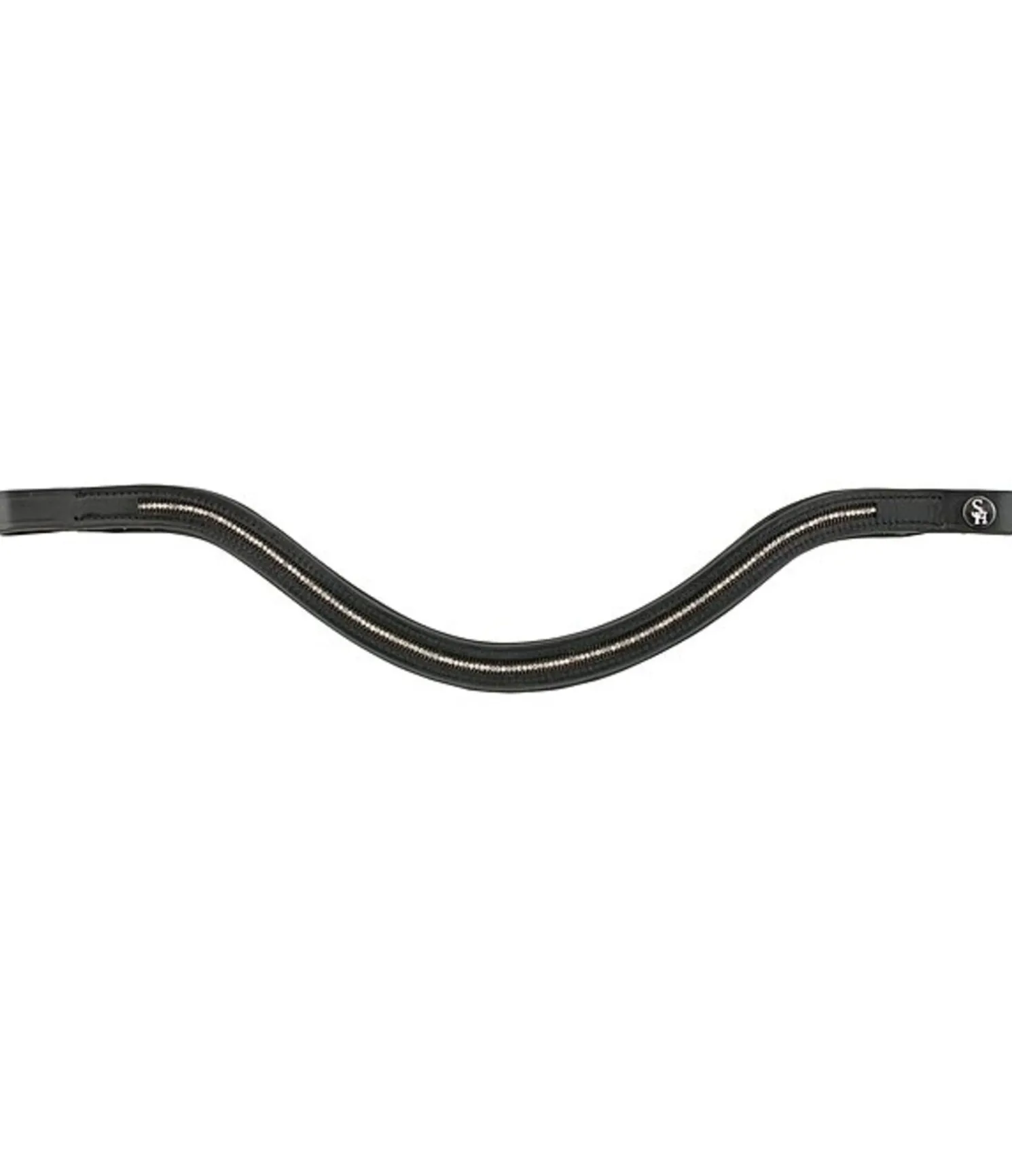 Adorable bridon avec muserolle combinée, conçu spécialement pour les mini-shetlands. Têtière et muserolle avec coupe droite, muserolle avec doublure douce. Frontal vague avec de nombreux strass scintillants. Bouclerie argentée. Avec rênes sangle, sans mors.