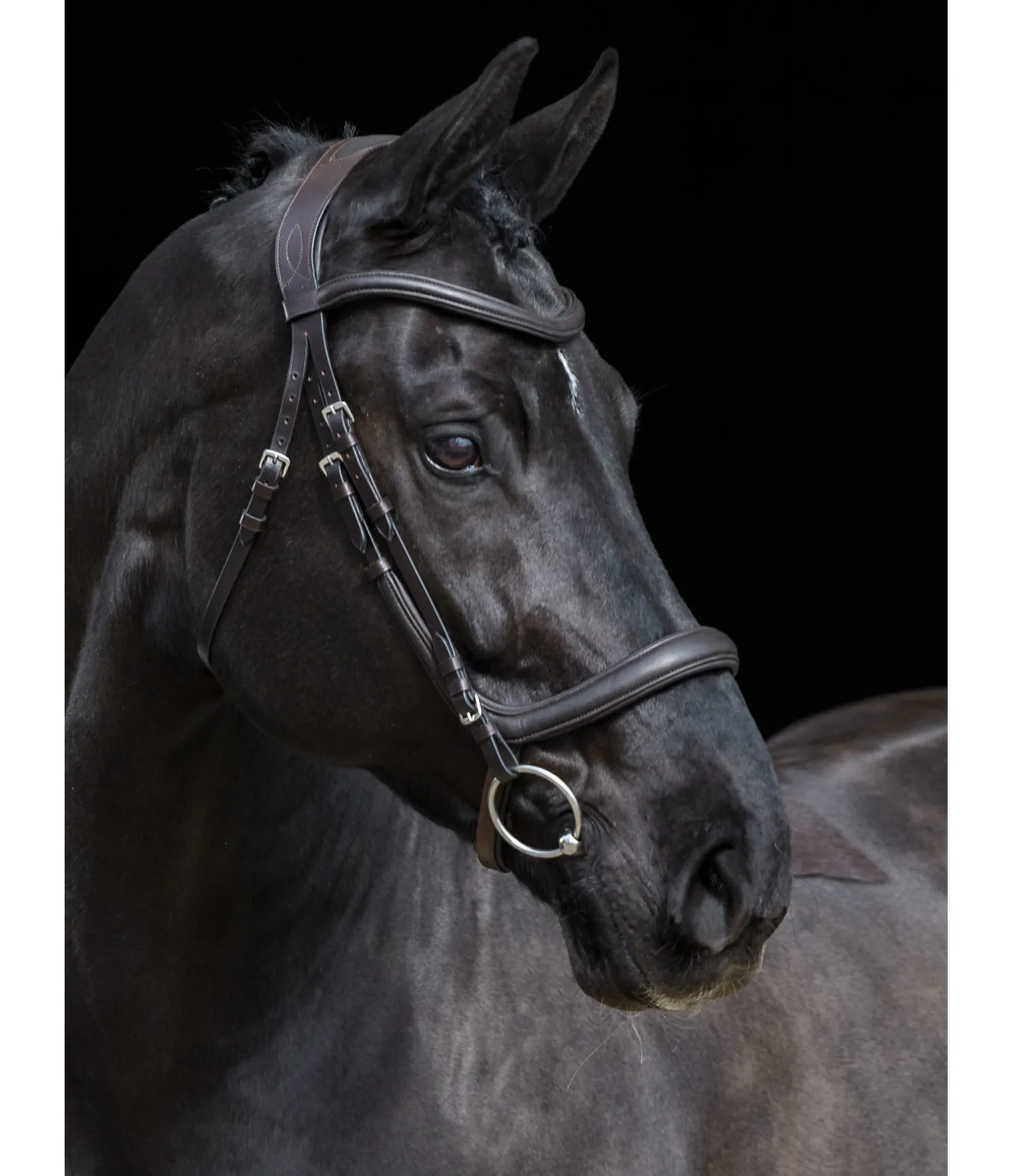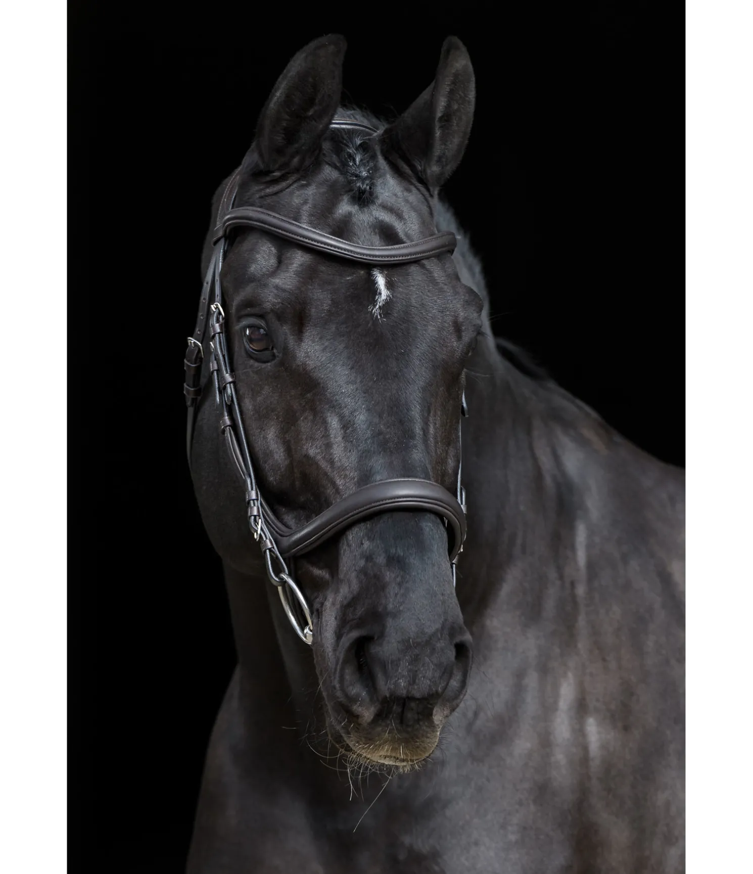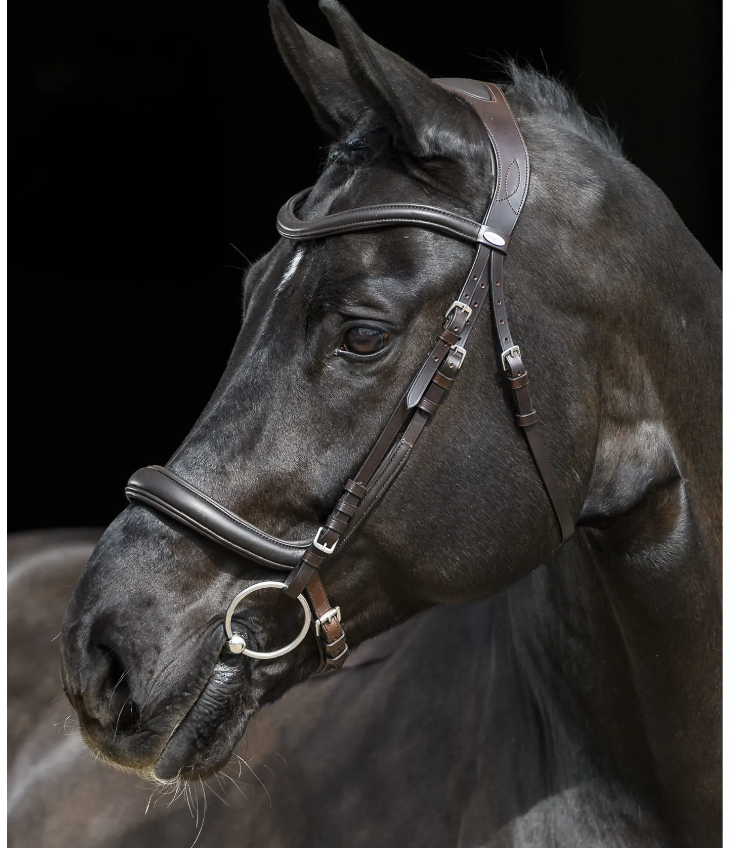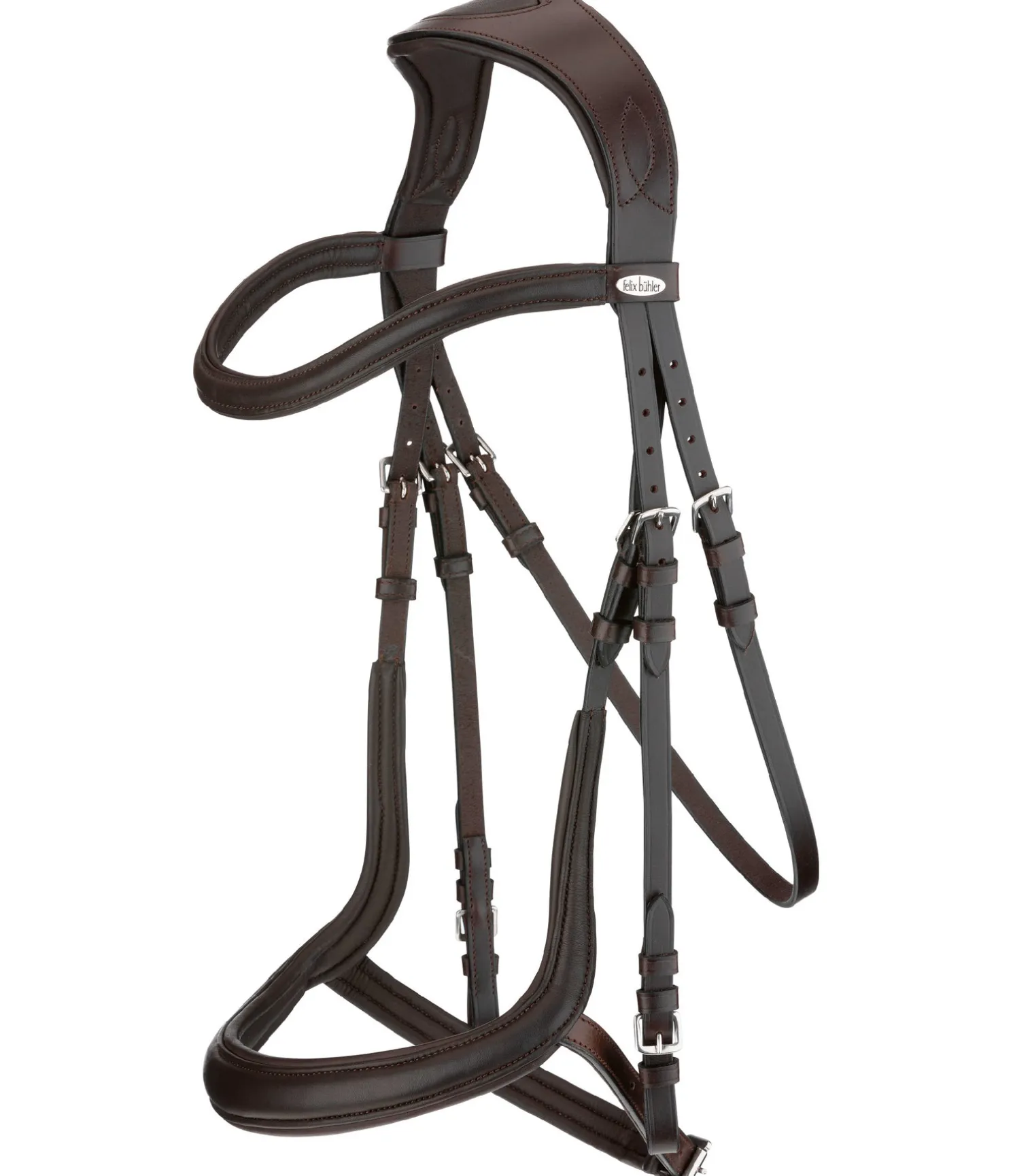 Bridon moderne en cuir souple combinant les effets d’une muserolle française et d’une muserolle allemande, ce qui permet d’éviter les pressions sur les nerfs sensibles de la tête du cheval au niveau de l’apophyse zygomatique, sur les dents et la mâchoire. Sans noseband, afin d’éviter les pressions sur l’os du nez et de favoriser la mastication. Têtière extra large avec découpe aux oreilles et doublure douce en cuir véritable. Muserolle et frontal vague en cuir souple travaillé avec doublure, particulièrement doux et confortables. Cuir gras. Bouclerie argentée. Sans rênes, sans mors.