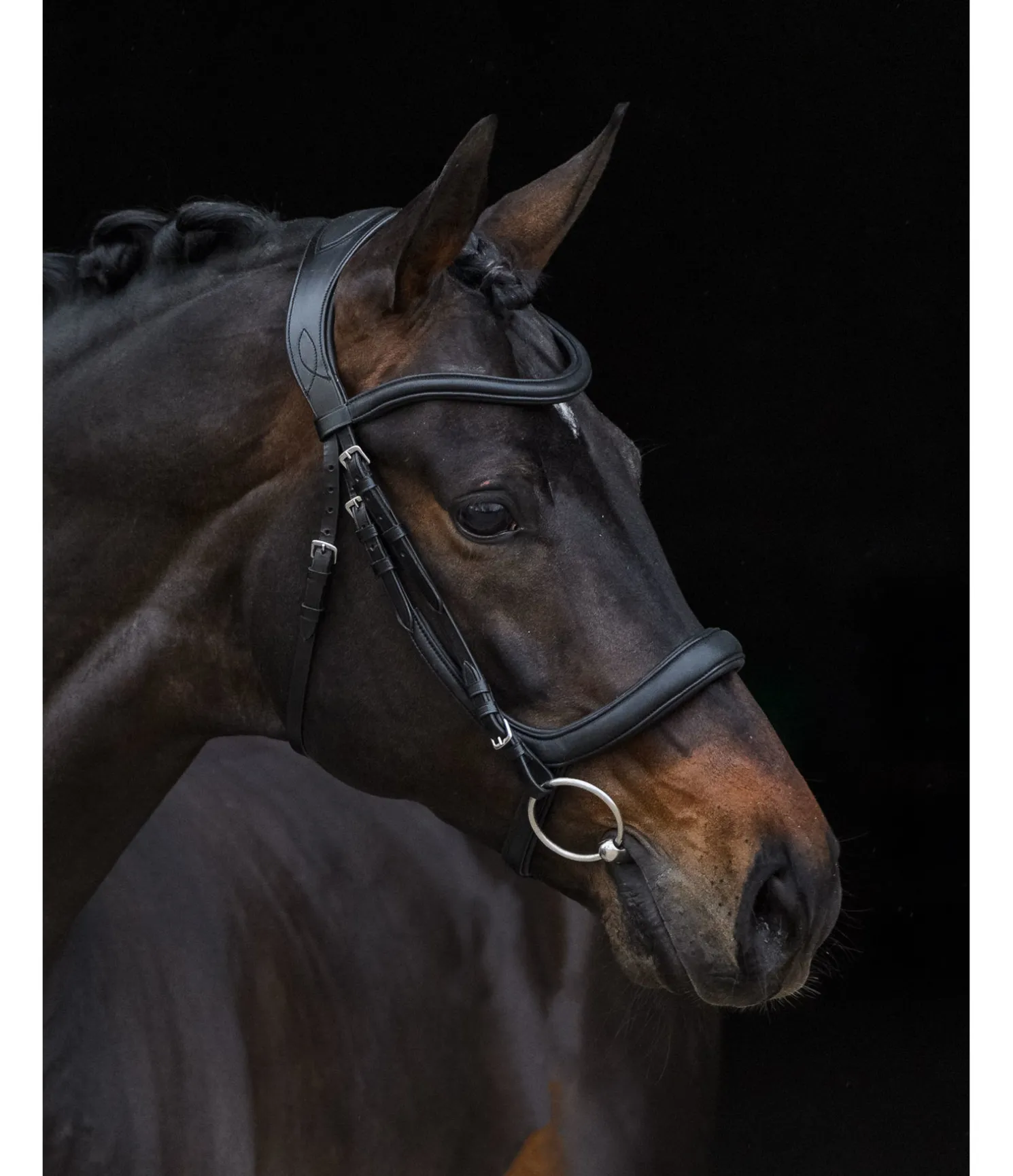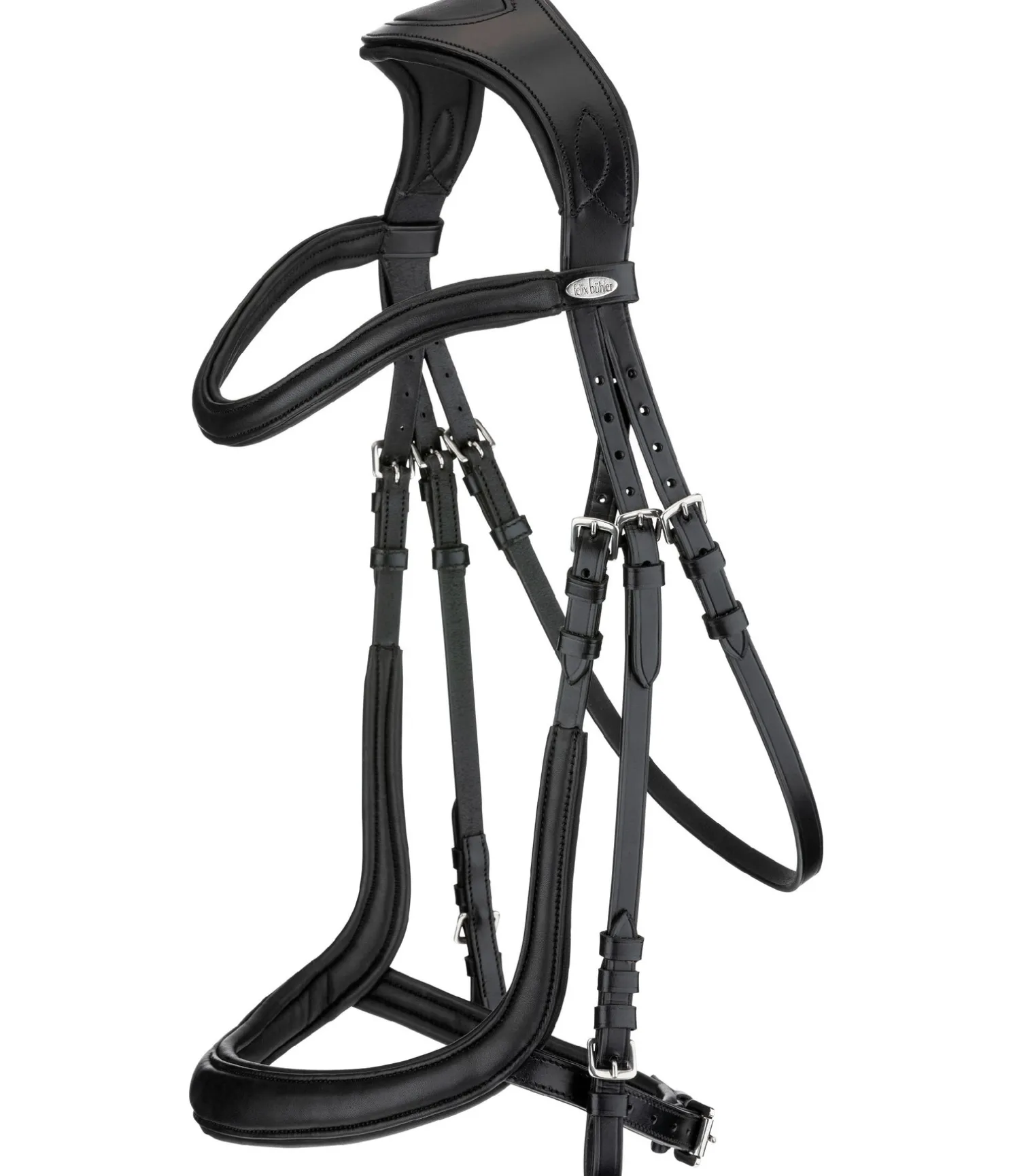 Bridon moderne en cuir souple combinant les effets d’une muserolle française et d’une muserolle allemande, ce qui permet d’éviter les pressions sur les nerfs sensibles de la tête du cheval au niveau de l’apophyse zygomatique, sur les dents et la mâchoire. Sans noseband, afin d’éviter les pressions sur l’os du nez et de favoriser la mastication. Têtière extra large avec découpe aux oreilles et doublure douce en cuir véritable. Muserolle et frontal vague en cuir souple travaillé avec doublure, particulièrement doux et confortables. Cuir gras. Bouclerie argentée. Sans rênes, sans mors.