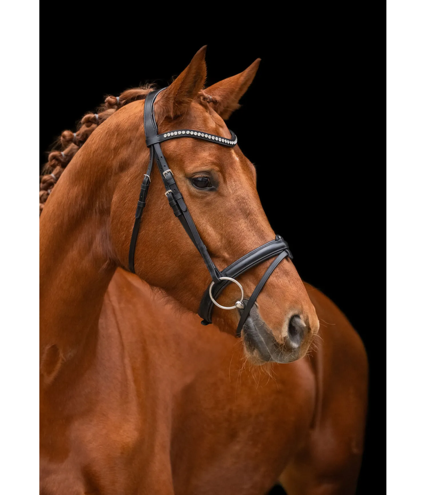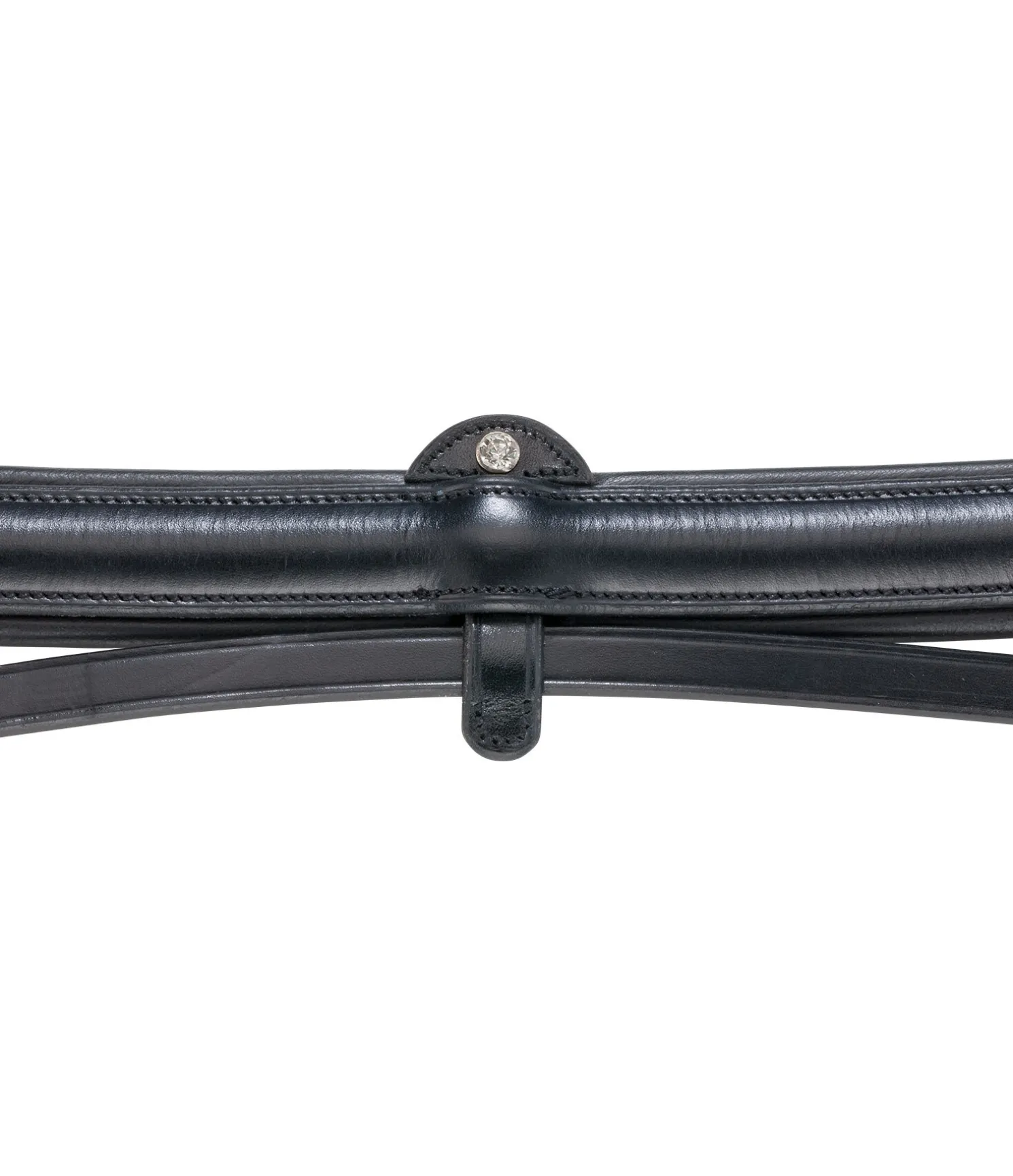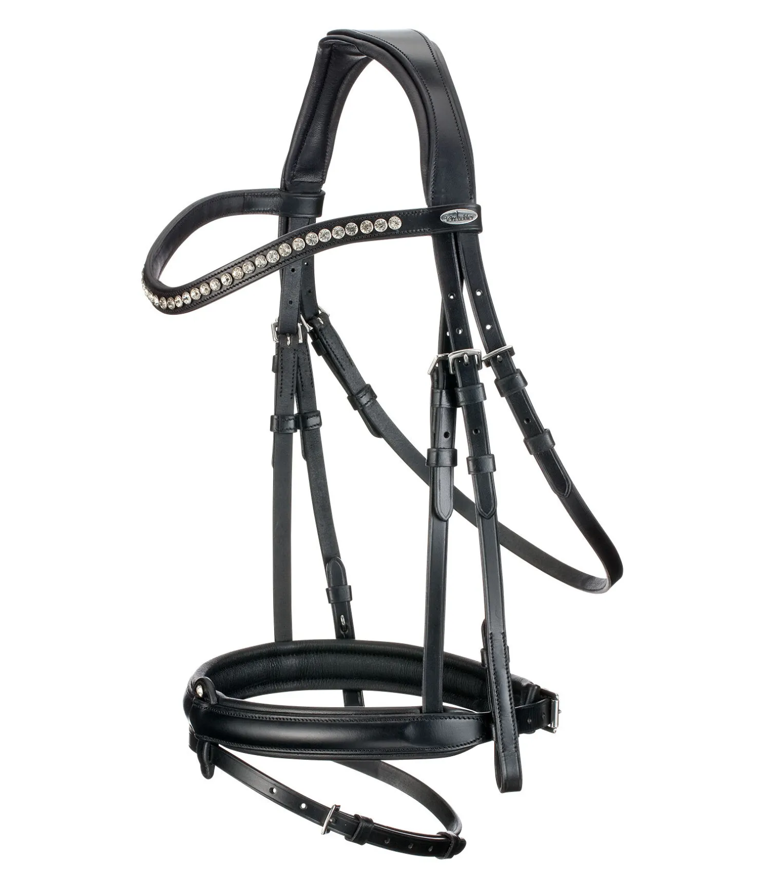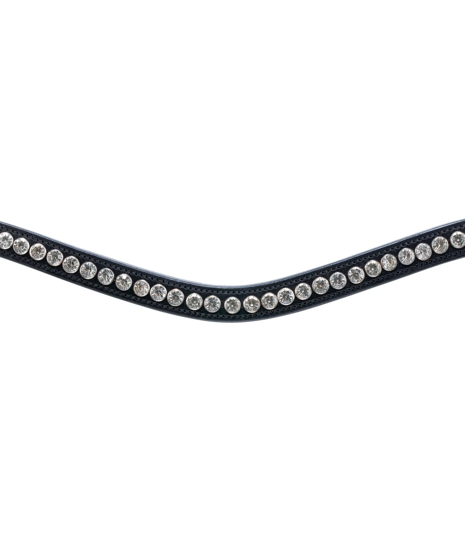 Bridon classique française combiné en cuir véritable souple. Noseband entièrement amovible avec pierre scintillante. Têtière anatomique extra souple et frontal vague avec strass.