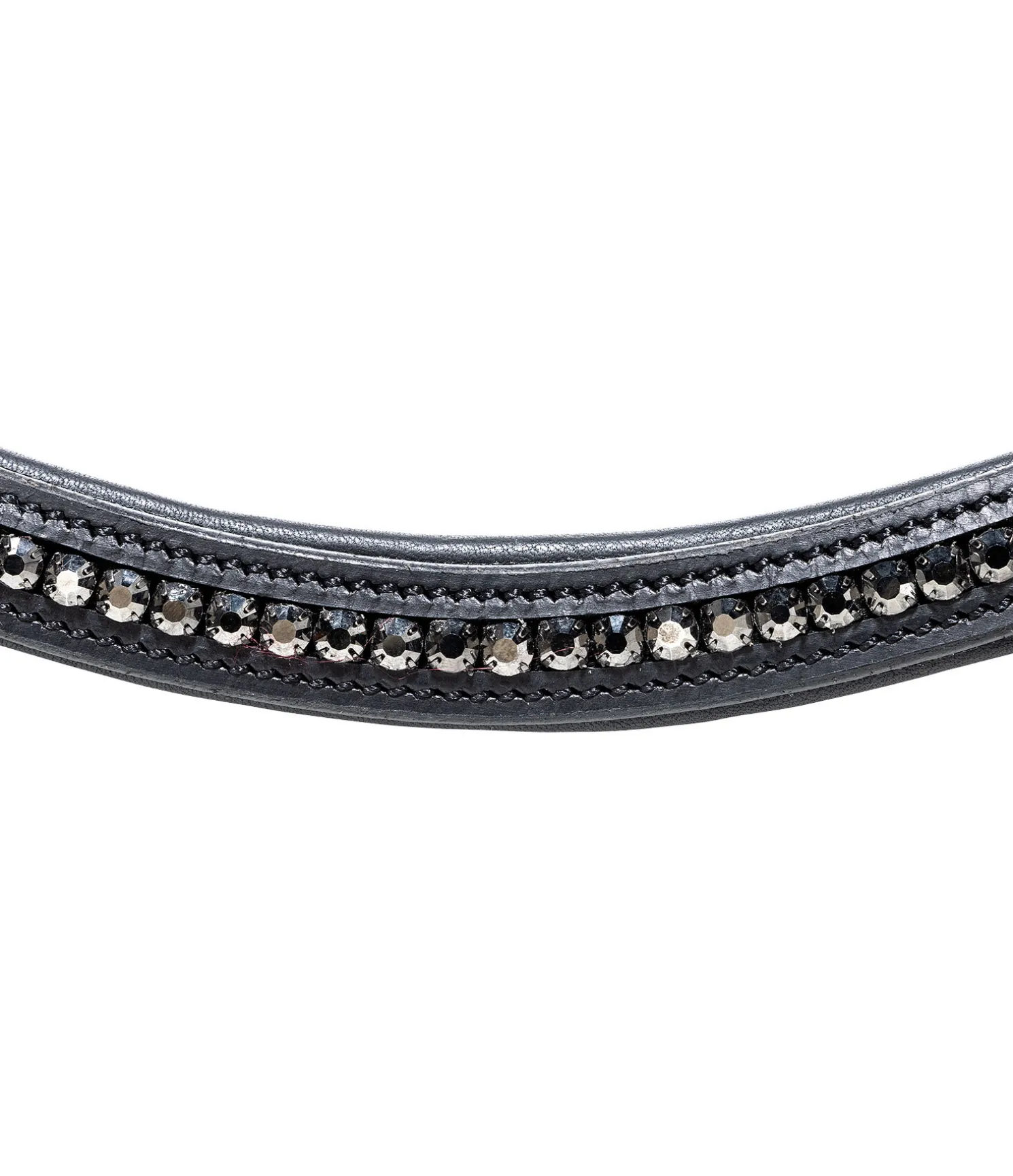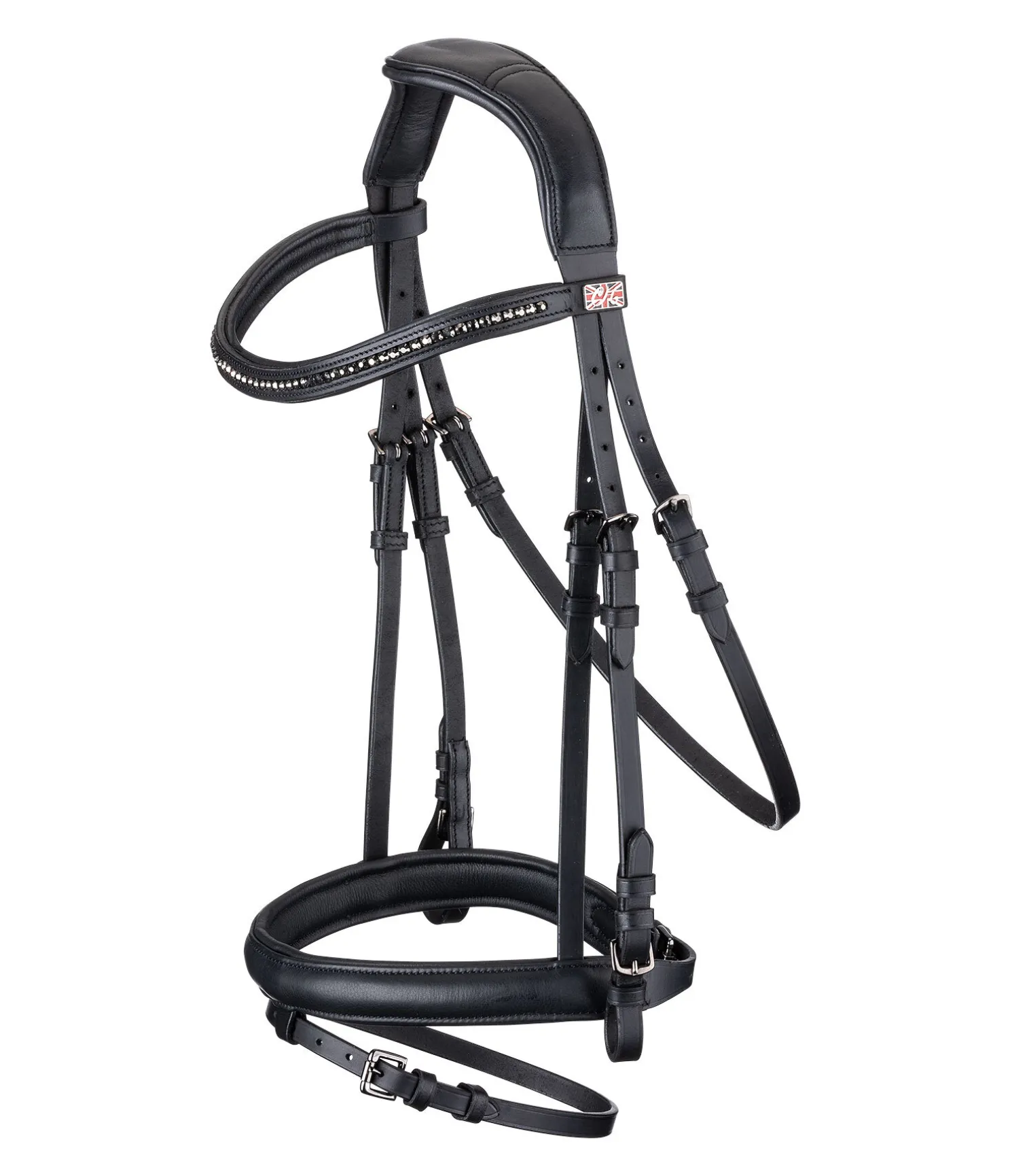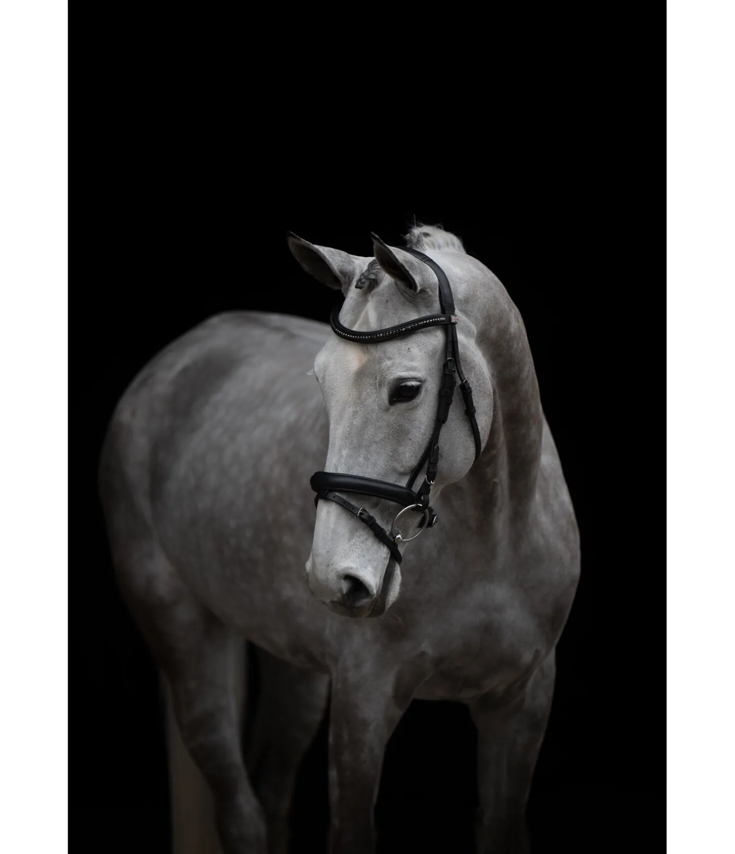 Bridon en cuir travaillé avec soin, ce qui le rend particulièrement souple et doux. Têtière anatomique. Frontal avec strass de couleur assortie. Frontal vague, têtière et muserolle avec doublure douce. Bouclerie gris foncé. Sans rênes sangle, sans mors.