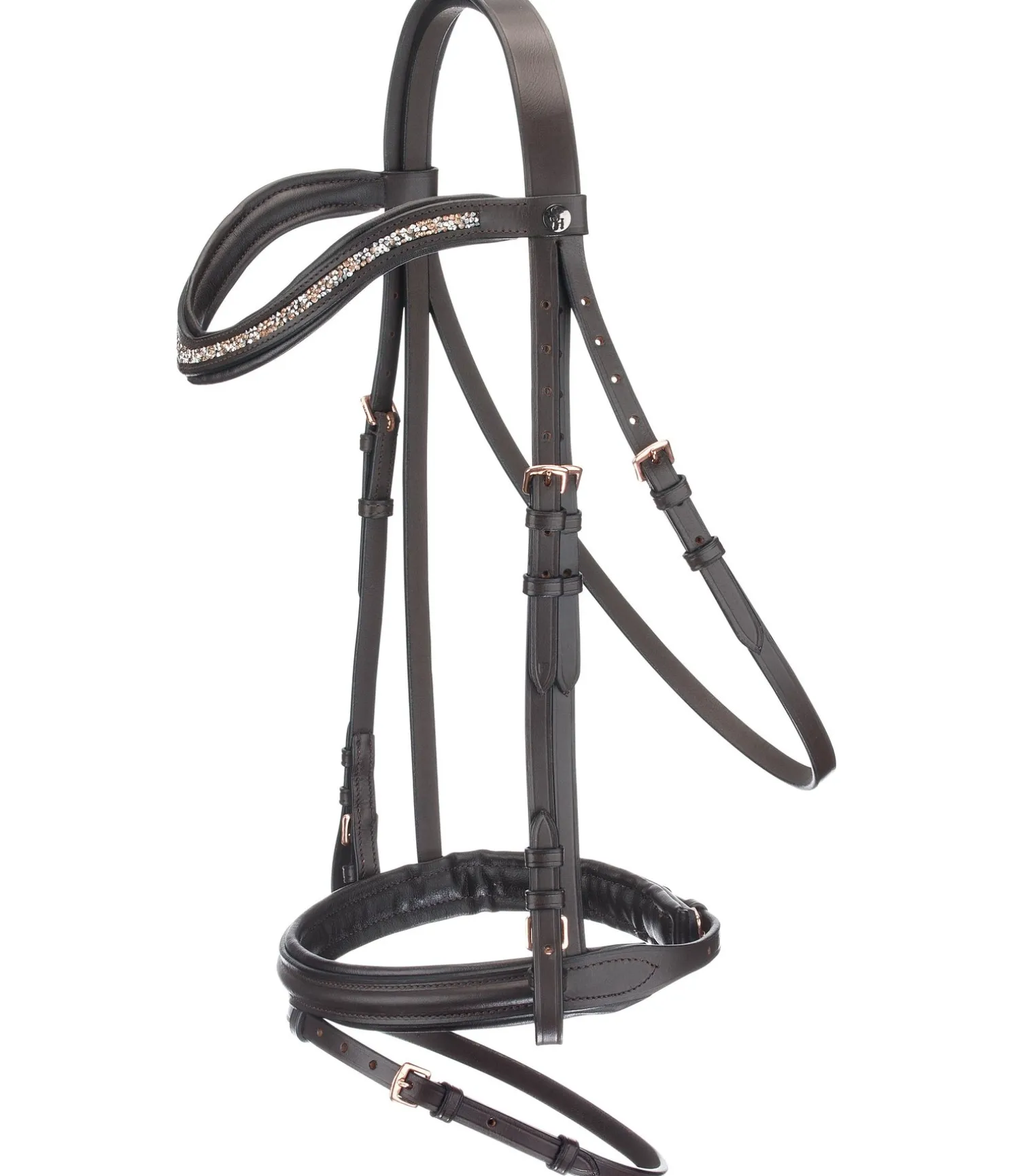 Bridon exceptionnel avec muserolle française combinée et frontal vague scintillant avec pierres scintillantes argentées et rose-doré. Frontal et muserolle avec doublure douce en cuir. Bouclerie rose doré. Avec rênes sangle, sans mors.