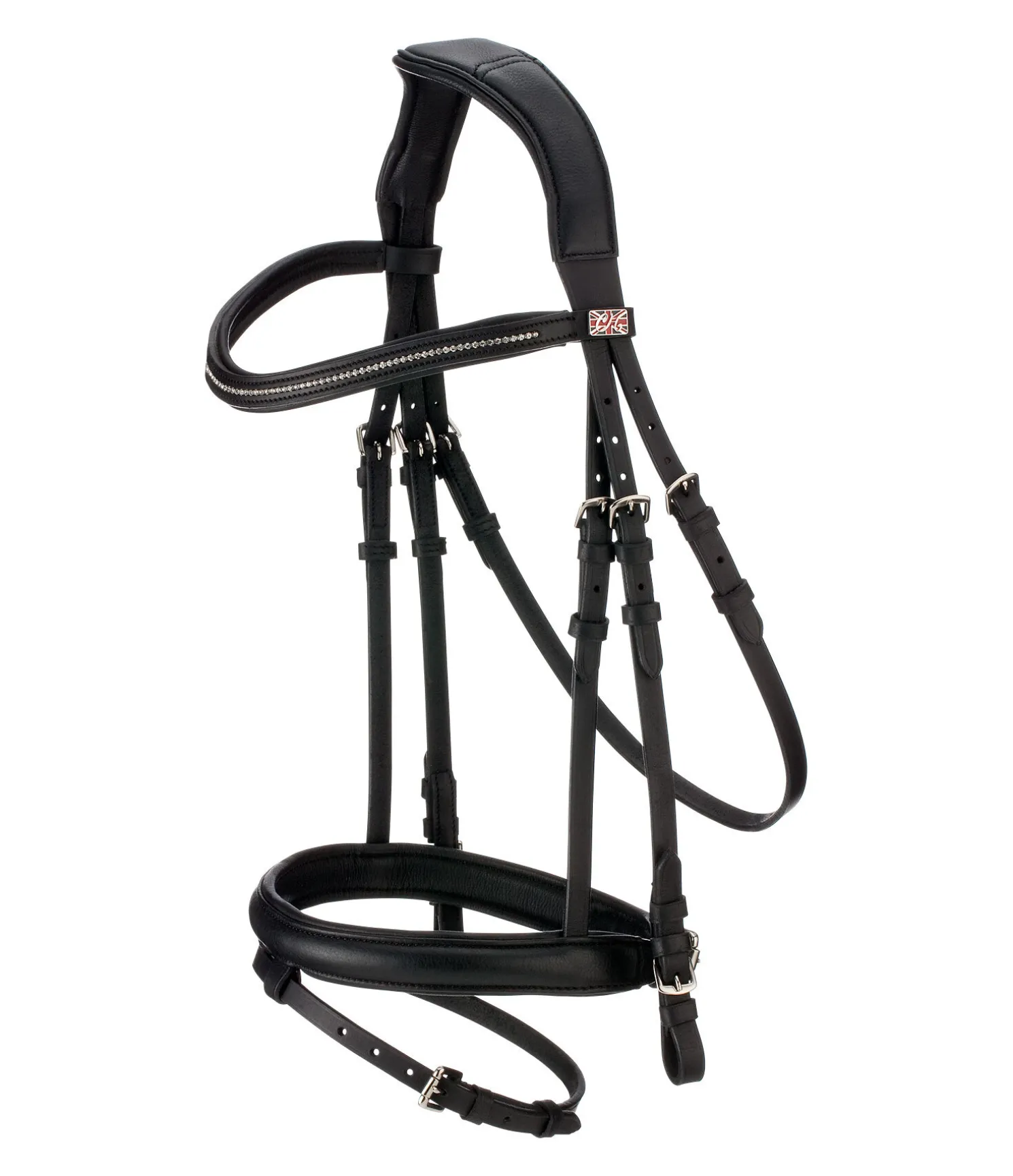 Bridon de qualité supérieure en cuir travaillé particulièrement souple et flexible. Têtière anatomique avec découpe confortable aux oreilles et large appui sur la nuque pour une répartition optimale des pressions. Frontal vague scintillant, muserolle et têtière avec doublure douce. Bridon noir avec bouclerie argentée. Avec rênes sangle, sans mors.