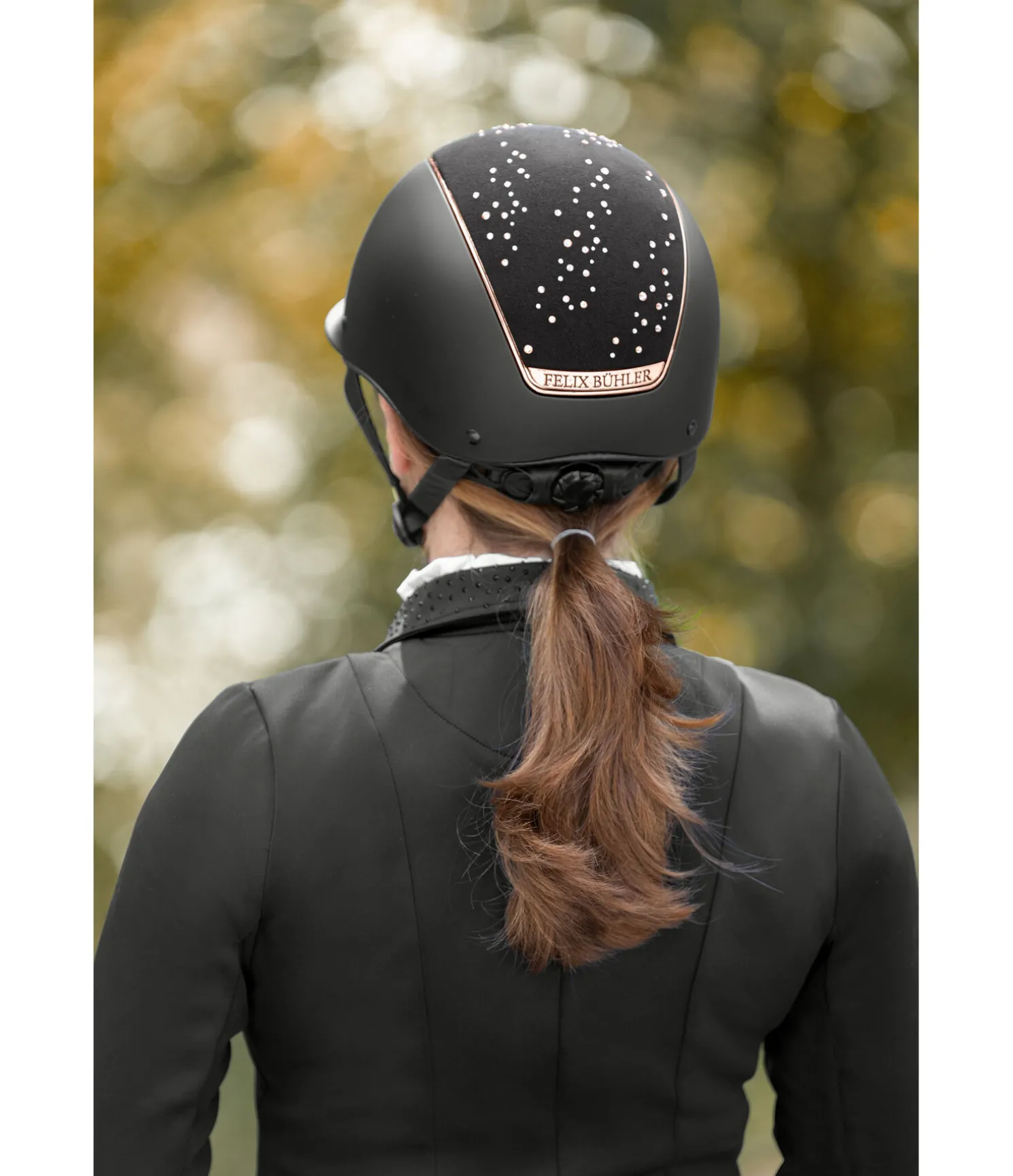 Casque d’équitation Felix Bühler haut de gamme avec décor de strass tel un ciel étoilé. Pour garantir un niveau de sécurité maximal, ce casque est doté de la technologie Hardshell avec une coque extérieure résistante aux chocs. Les ouvertures à l’avant assurent une aération optimale sur l’ensemble de la tête grâce à des canaux de ventilation internes passant de l’avant à l’arrière du casque. La doublure intérieure absorbant l’humidité est amovible et lavable à 30°C. Le casque dispose d’une fermeture magnétique innovante pour une ouverture à une seule main, facile et rapide. Grâce à la fonction Easy-Lock/No-Unlock, l’aimant verrouille l’attache dès que la boucle est approchée du fermoir. L’ouverture accidentelle du fermoir en tirant ou en tournant la boucle est impossible. Celle-ci peut être déverrouillé uniquement en appuyant fermement sur le bouton Unlock situé sur le côté. La molette à l’arrière du casque offre un ajustement précis et individuel, au millimètre près, à la circonférence de la tête. Les sangles recouvertes soulignent le design raffiné du casque et disposent de coussinets au niveau de la nuque et du menton pour garantir un confort de port optimal au cavalier. Ce casque d’équitation est certifié selon la norme EN1384:2023.