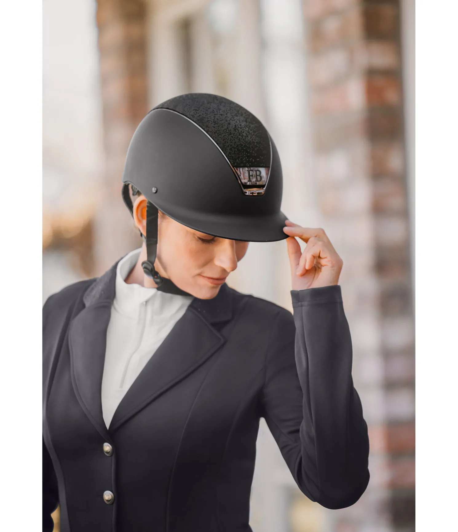 Casque d’équitation premium de Felix Bühler avec un décor au design pixels scintillants. Ce casque est doté de la technologie Hardshell avec une coque extérieure résistante aux chocs pour une sécurité maximale, tout en ne négligeant ni l’élégance, ni la légèreté grâce à sa forme étroite. Les ouvertures à l’avant assurent une aération optimale sur l’ensemble de la tête grâce à des canaux de ventilation internes passant de l’avant à l’arrière du casque. La doublure intérieure absorbant l’humidité est amovible et lavable à 30 °C. Le casque dispose d’une fermeture magnétique innovante pour une ouverture à une seule main, facile et rapide. Grâce à la fonction Easy-Lock/No-Unlock, l’aimant verrouille l’attache dès que la boucle est approchée du fermoir. L’ouverture accidentelle du fermoir en tirant ou en tournant la boucle est impossible. Celle-ci peut être déverrouillée uniquement en appuyant fermement sur le bouton Unlock situé sur le côté. La molette à l’arrière du casque offre un ajustement précis au millimètre près au tour de tête. Les sangles recouvertes soulignent le design raffiné du casque et disposent de coussinets au niveau de la nuque et du menton pour garantir un confort de port optimal. Ce casque d’équitation est certifié selon la norme EN1384:2023.