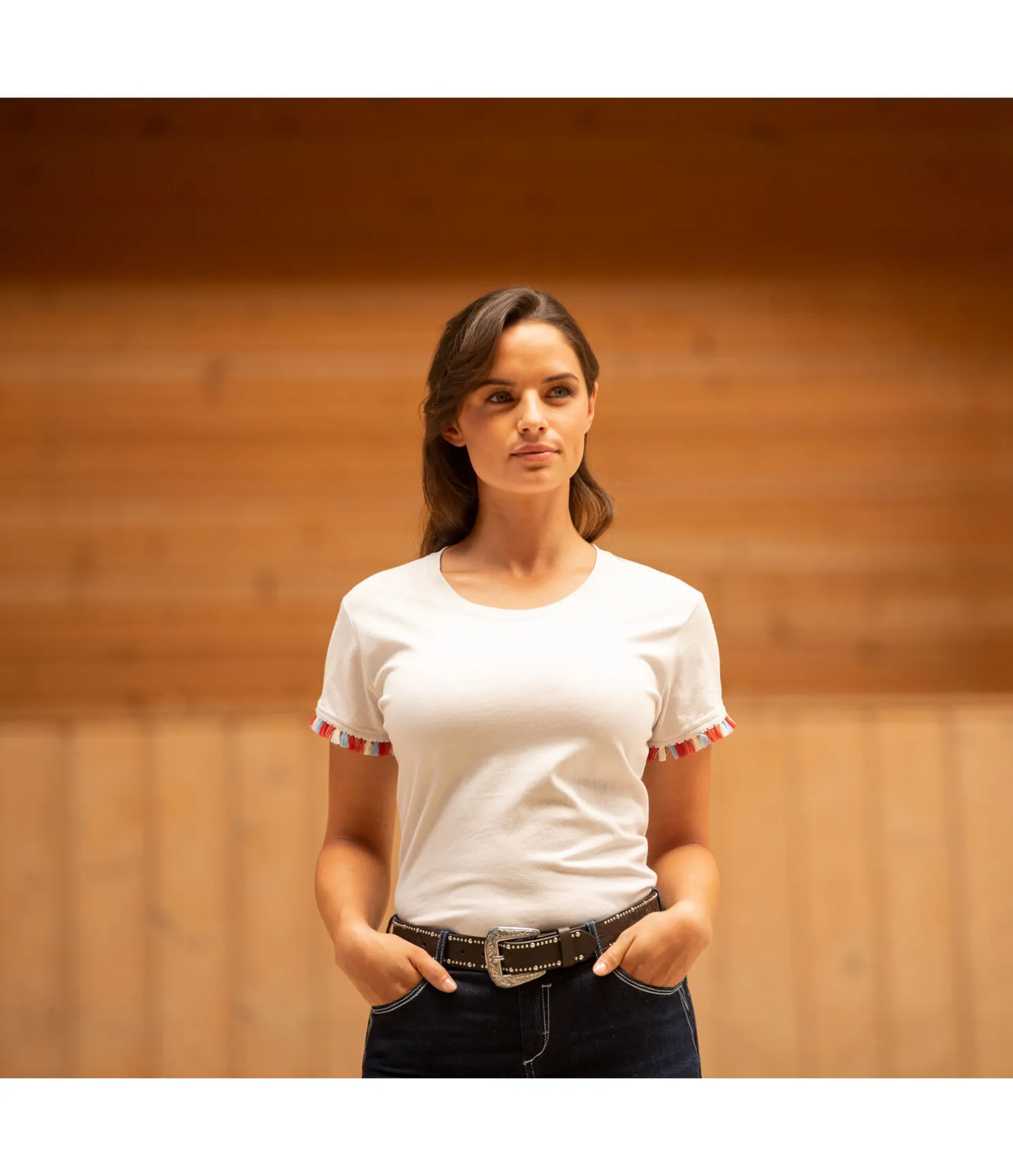 Ceinture ornée de rivets couleur argent et de pochoirs floraux. Boucle aspect antique interchangeable. Synthétique. Largeur 3,4 cm.
