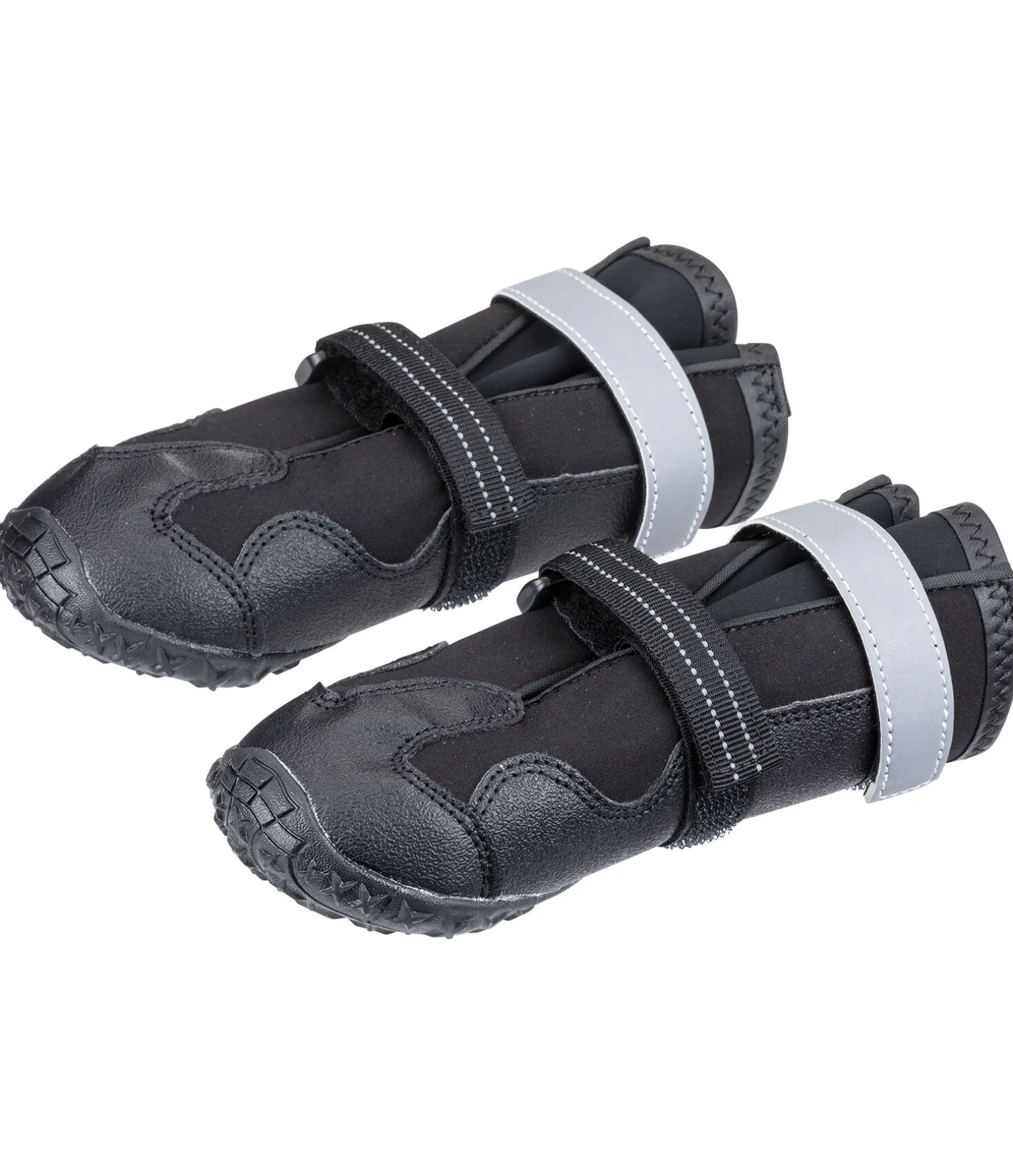 Chaussons extra hauts, déperlants et résistants à la neige. Pour protéger les pattes du chien de la neige, du froid et du sel. Semelle adhérente et antidérapante. Deux pattes auto-agrippantes avec éléments réfléchissants pour adapter le chausson à la patte du chien. Doublure intérieure douce pour protéger des irritations dues aux frottements en cas de port prolongé. Chaussons 100 % polyester, semelle 100 % caoutchouc thermoplastique.