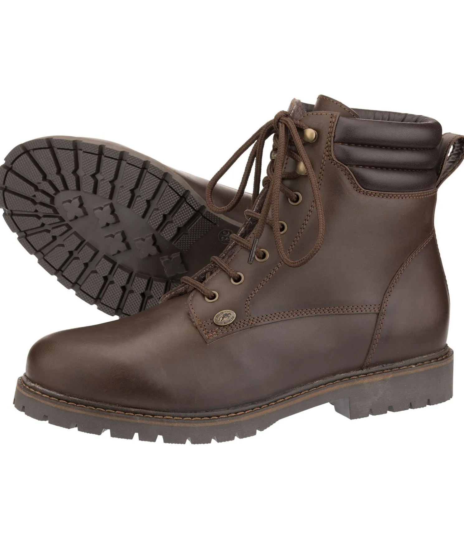Chaussures d’écurie d’hiver avec laçage rapide à l’avant en cuir de vachette huilé, résistant à l’usure et de qualité supérieure. Doublure chaude en 100 % laine de mouton. Rembourrage doux à la malléole et assise plantaire moelleuse pour un confort optimal. Semelle crantée en caoutchouc avec talon cavalier pour un maintien parfait sur les sols glissants et dans les étriers. La meilleure finition, fabriquées au Portugal.