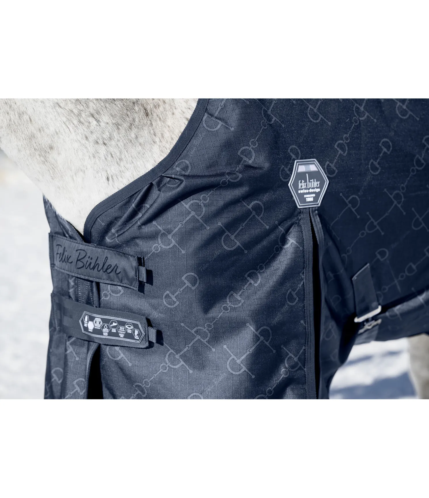 Chemise d’extérieur résistante aux déchirures, imperméable (5 000 mm) et respirante. Élégant motif all-over mors dans le design de la collection Signature II. Matière Ripstop robuste (1.200 deniers). Doublure intérieure généreuse pour éviter les points de pression au niveau du garrot. Doublure intérieure lisse protégeant la robe. Double fermeture de poitrail en crochet en T dissimulée pour plus de sécurité. Les grands plis d’aisance au niveau des épaules permettent une liberté de mouvement optimale. Sursangles croisées réglables, courroie de queue, rabat de queue et dispositif permettant la fixation de courroies de cuisses (non incluses). 100 % polyester.