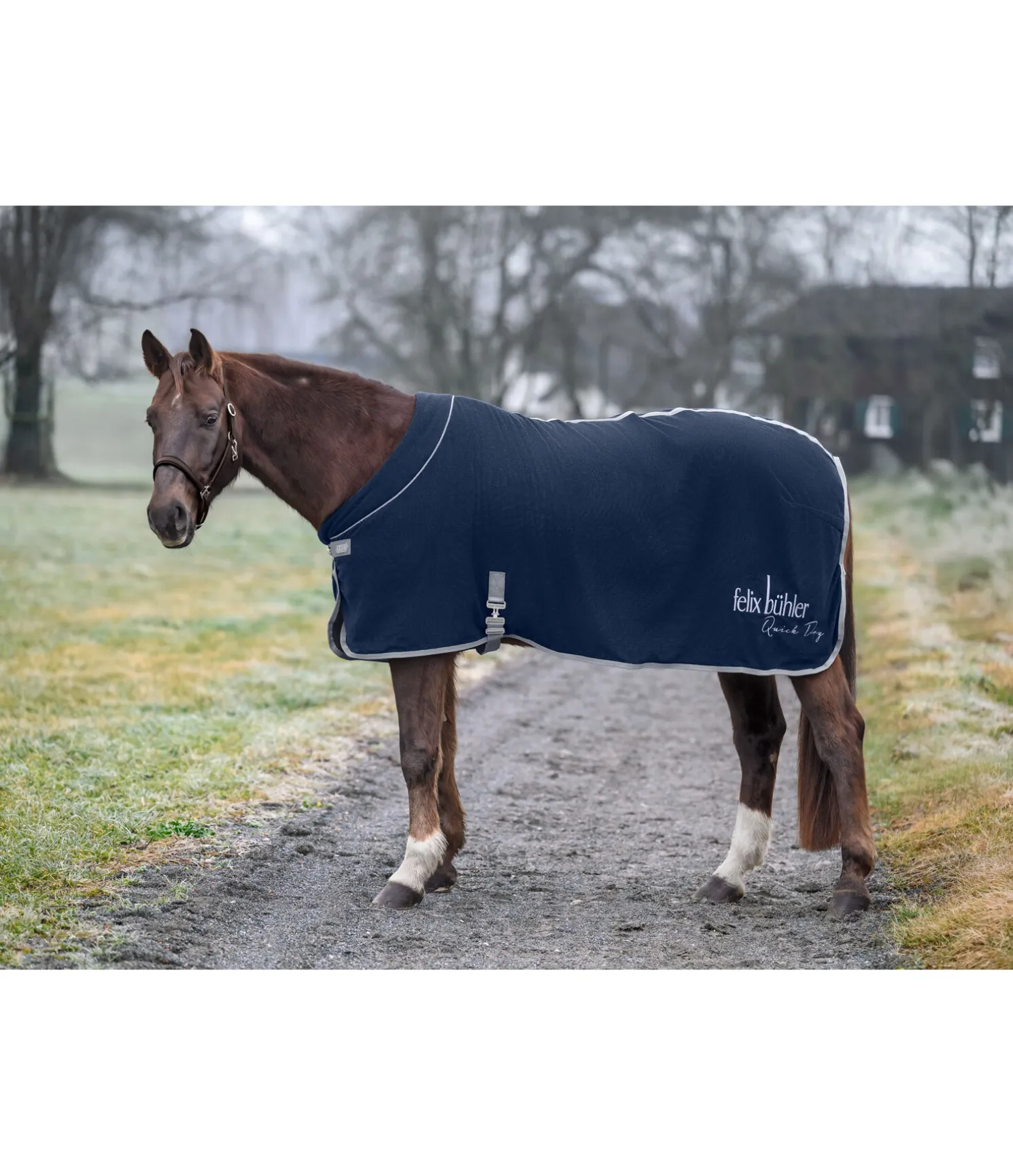 Chemise séchante idéale pour la mi-saison, lorsqu’il fait déjà un peu trop chaud ou pas encore assez froid pour les couvertures en polaire traditionnelles. Cette chemise légère en tissu éponge en microfibre est un peu plus fine que les couvertures en polaire, mais aussi moins chaude, ce qui permet au cheval de moins transpirer. En même temps, la matière absorbe extrêmement bien l’humidité, ce qui permet au cheval de sécher rapidement et efficacement. Le cordon décoratif à l’encolure et la broderie sophistiquée lui confèrent un look attrayant. Avec une doublure lisse et douce pour la robe au poitrail et aux épaules afin d’éviter la casse des poils et les frottements. Fermeture simple au poitrail avec crochet en T. Rabat ventral amovible et réglable des deux côtés permettant à la chemise d’être également utilisée comme simple plaid. Courroie de queue réglable. 100 % polyester.