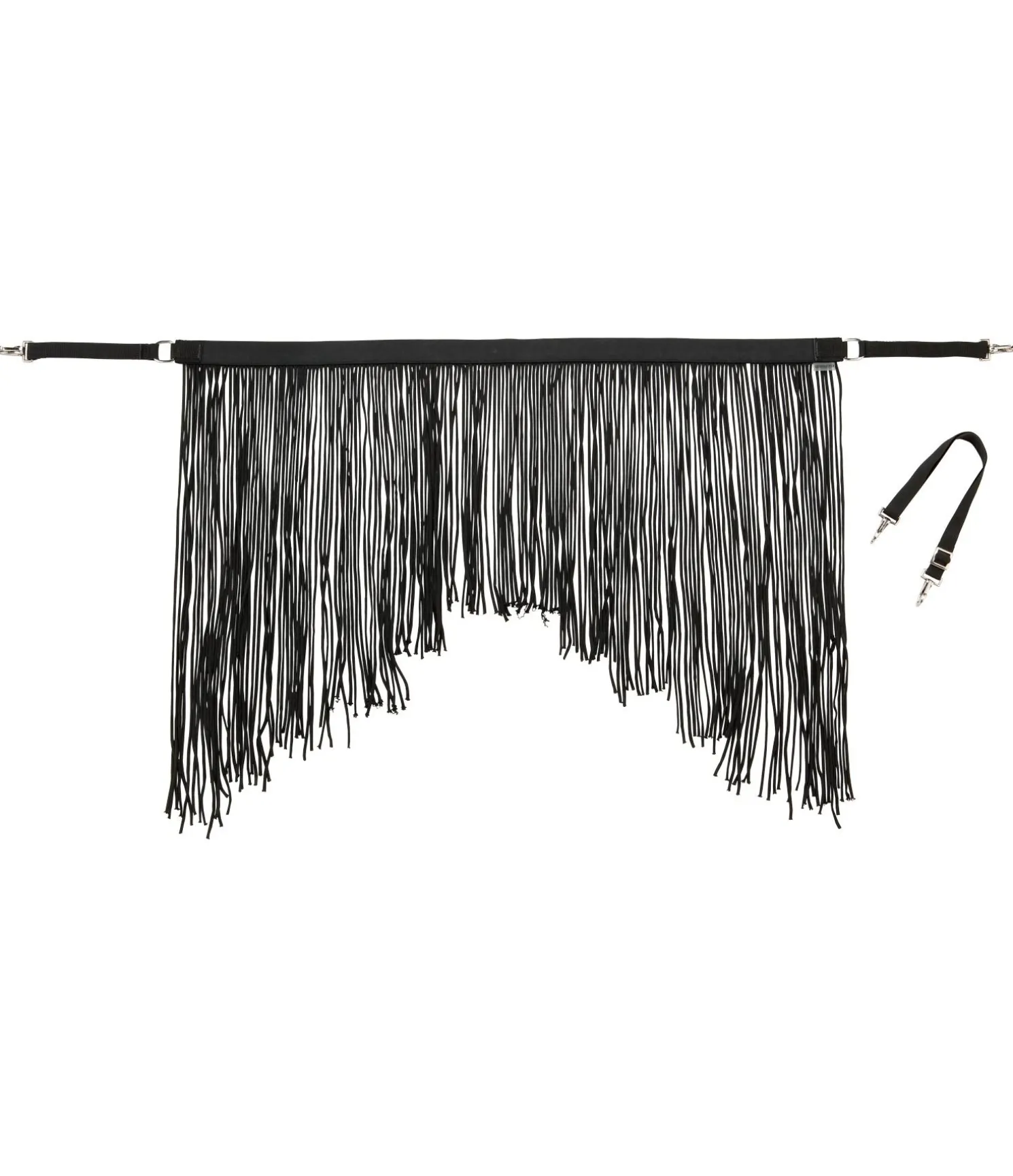 Collier de chasse innovant qui protège des mouches grâce à sa généreuse frange anti-mouches au niveau du poitrail et des épaules, pour des balades ou le travail au sol ou à la longe en toute tranquillité. Une bande élastique réglable passe au garrot pour un meilleur maintien et des clips simples en métal avec pattes auto-agrippantes permettent la fixation aux oeillets de la selle ou du surfaix. La bande est élastique sur tout le long. Alternative légère et parfaite à la couverture anti-mouches. 100% polyester.