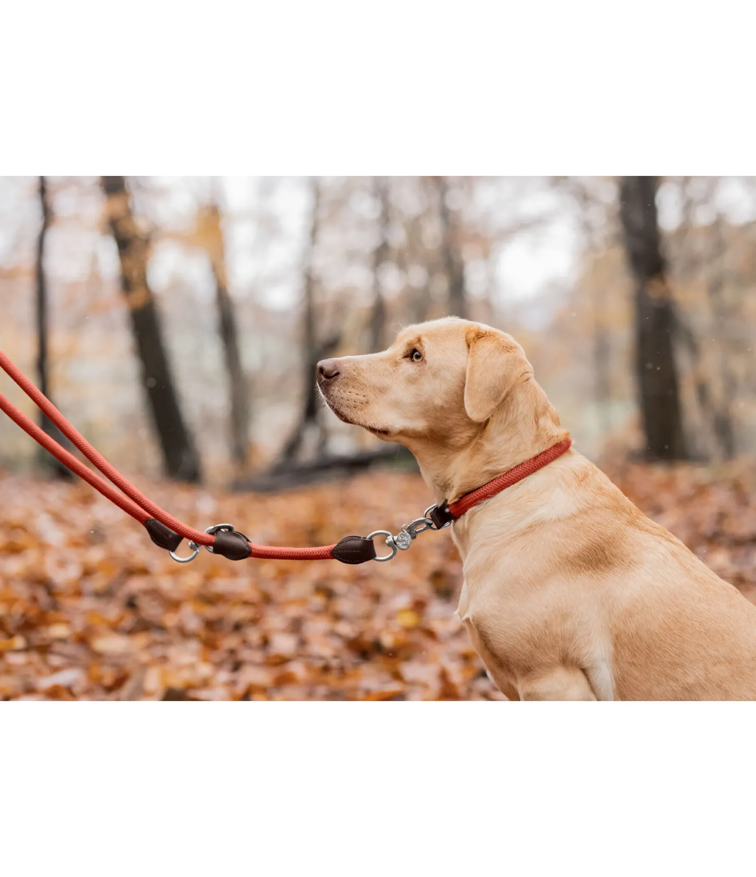 Collier élégant en polypropylène doux avec des extrémités en cuir fin huilé. Facile à ajuster grâce à la boucle à ardillon. Avec logo subtil et gaufrage en relief.