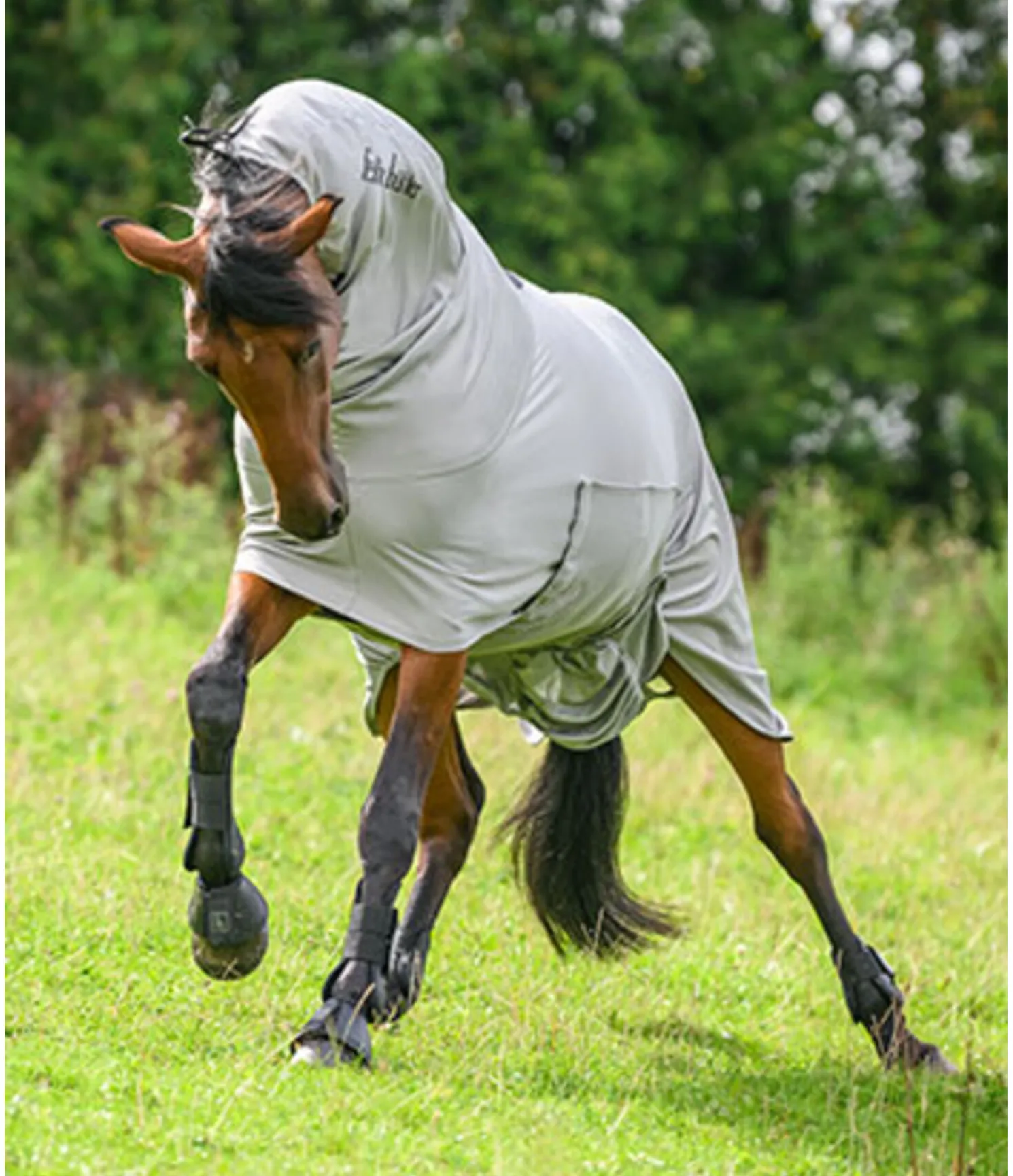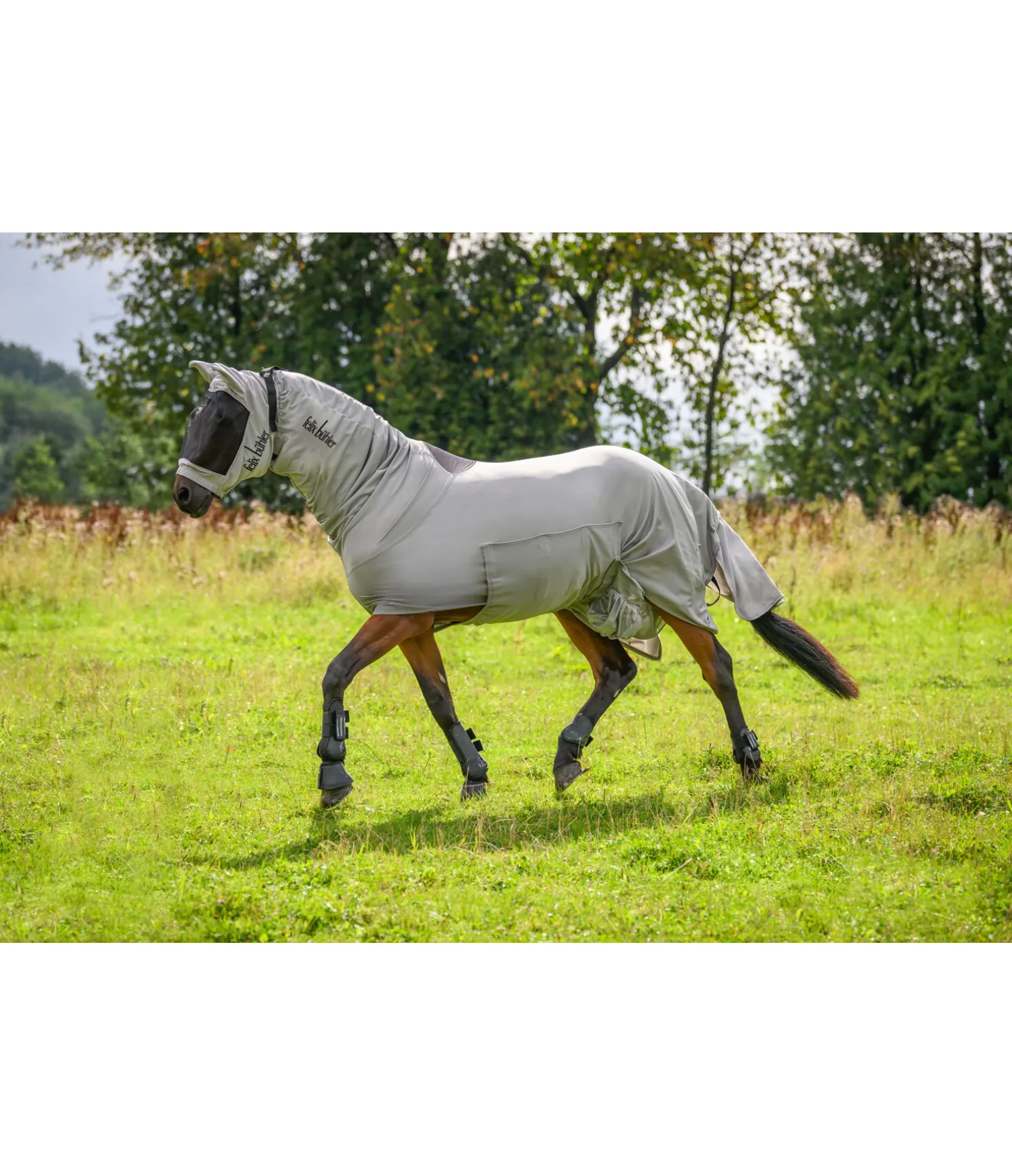 Couverture anti-eczéma innovante et bien ajustée. Tissu technique extensible et respirant bloquant au moins 97 % des rayons UV pour une protection efficace contre le soleil (UPF 50+). Idéale pour les chevaux particulièrement sensibles aux mouches et moustiques. Le couvre-cou et la couverture forment une seule et même pièce afin de ne laisser aucune chance aux insectes. Passant avec patte auto-agrippante sur la partie supérieure de l’encolure pour la fixation au licol. Empiècement léger et particulièrement élastique au garrot pour minimiser les pressions. Offre une protection intégrale grâce au large rabat ventral extensible et au généreux rabat de queue doublé. Pour une bonne protection contre les mouches noires, la couverture dispose d’une protection amovible des parties génitales et des mamelles en tissu en filet respirant qui laisse passer l’urine. 100 % polyester. Notre conseil : pour une protection intégrale, pensez aux masque anti-eczéma Felix Bühler Gibson II (référence 414 242).