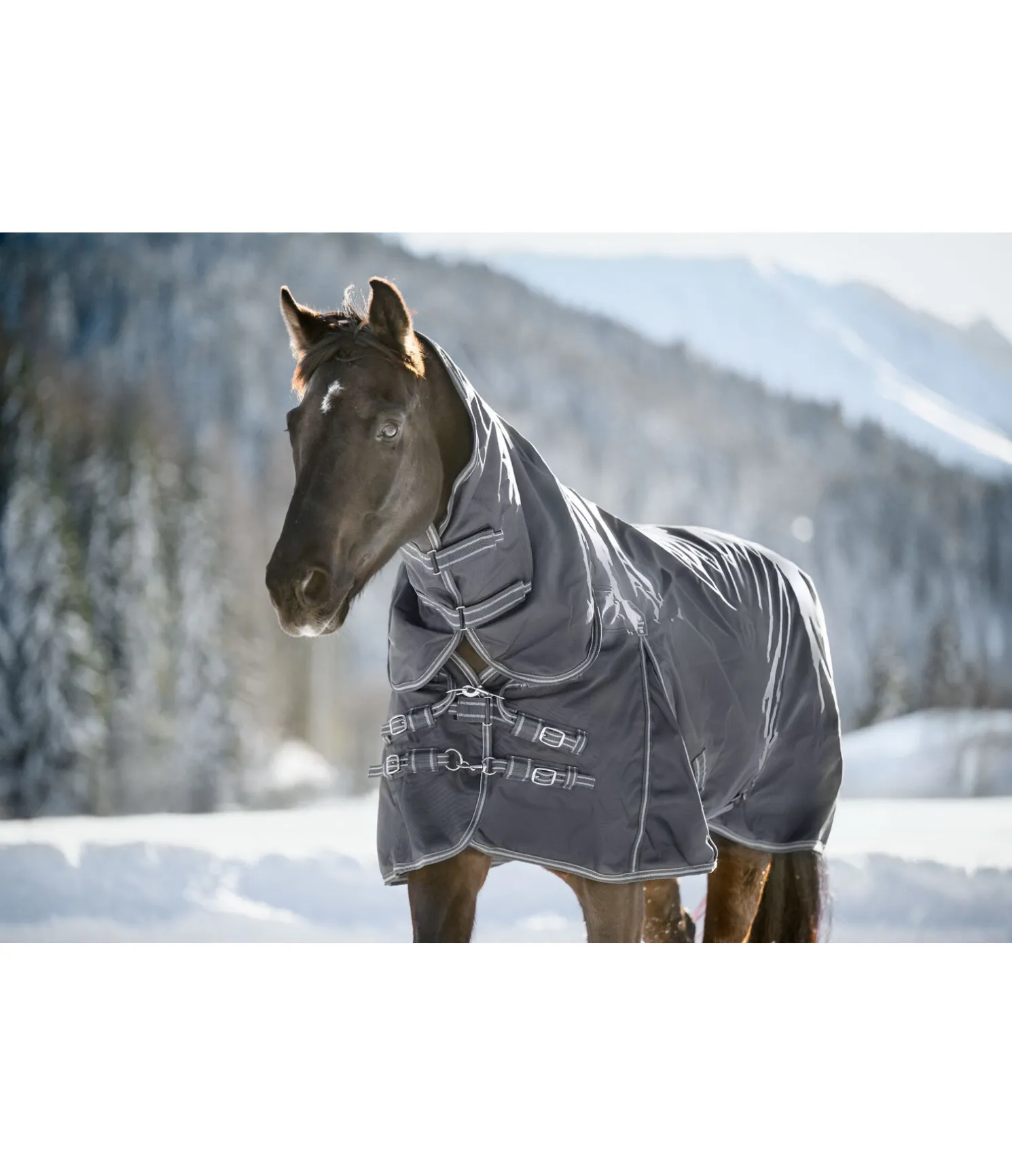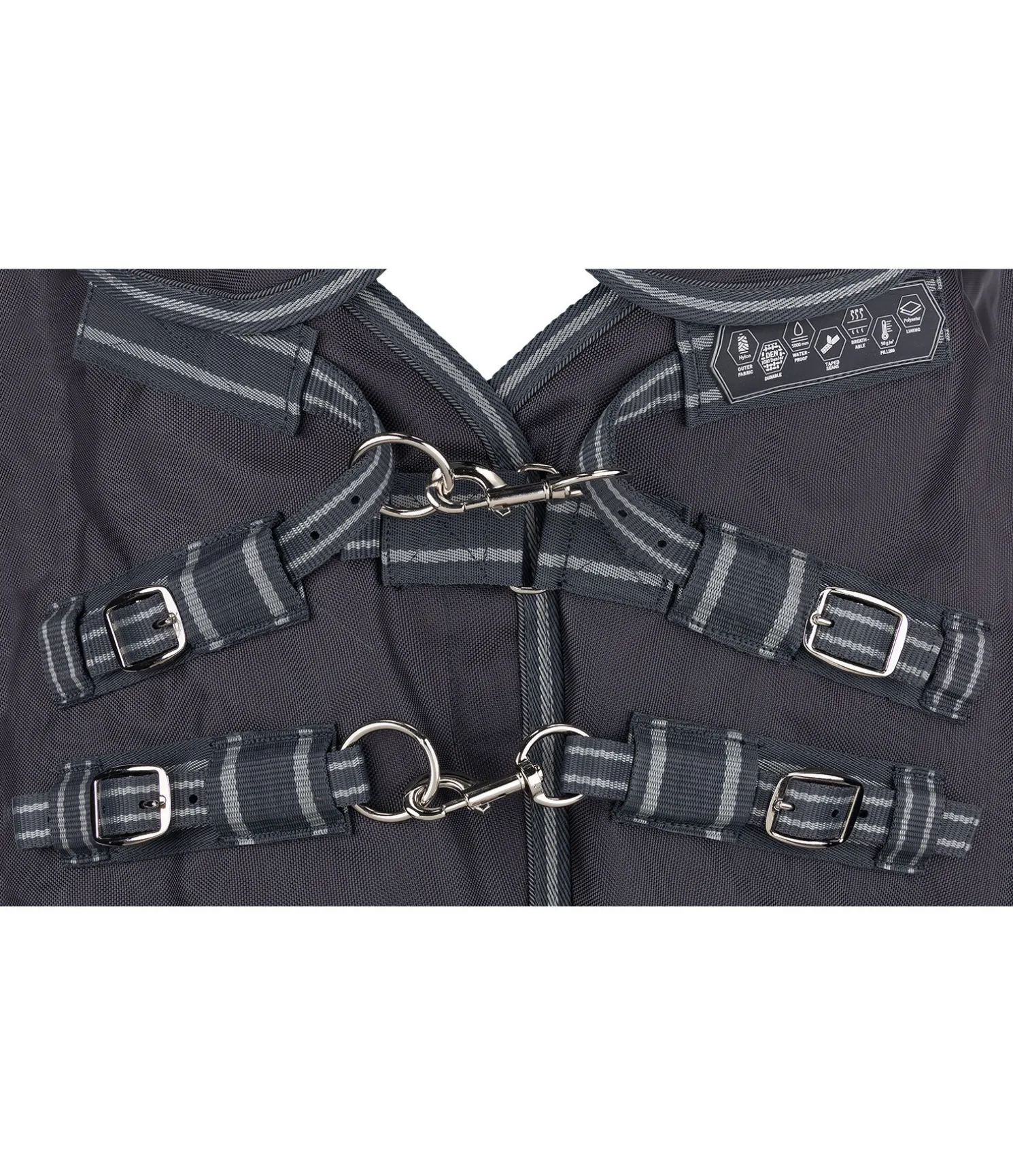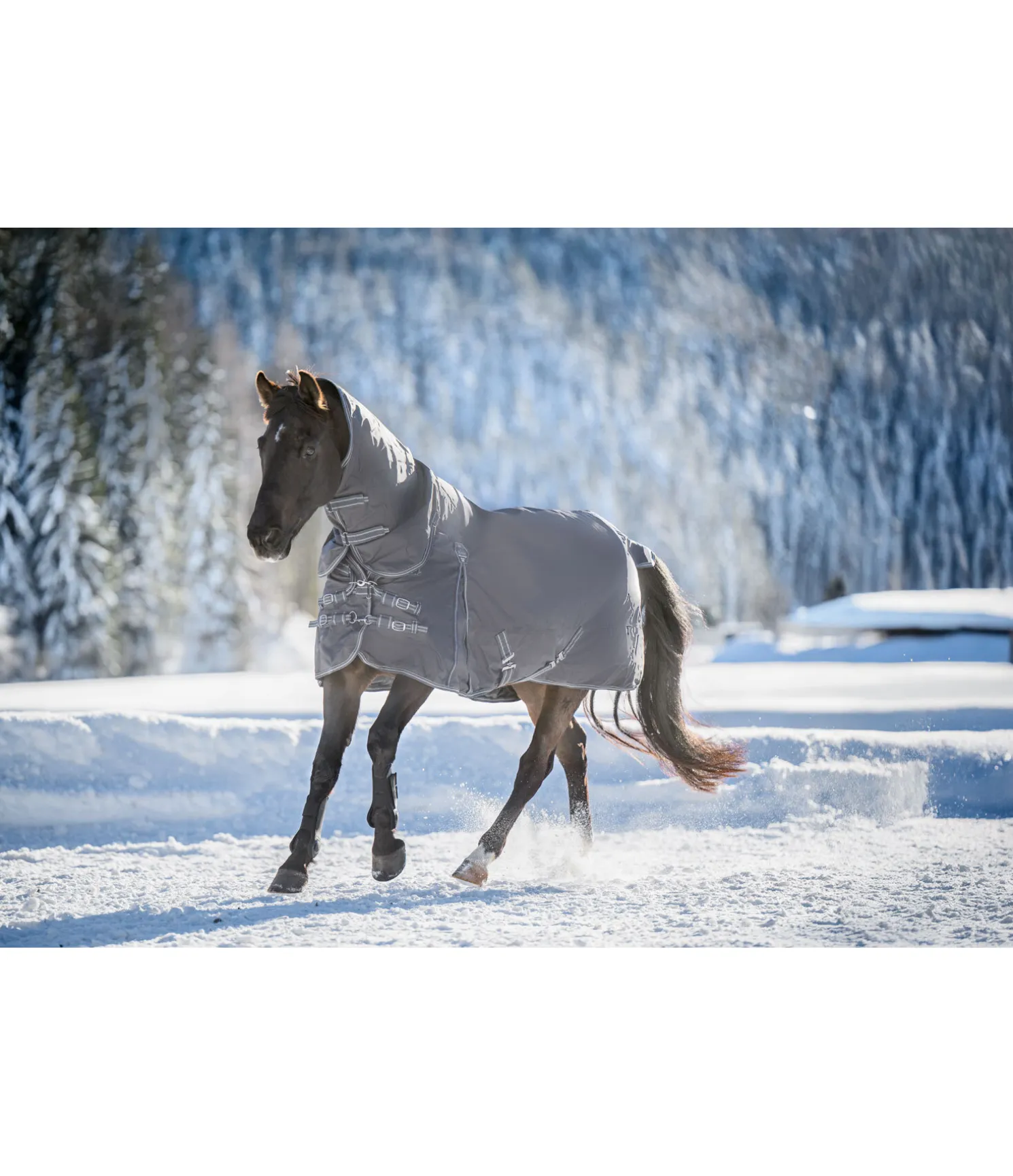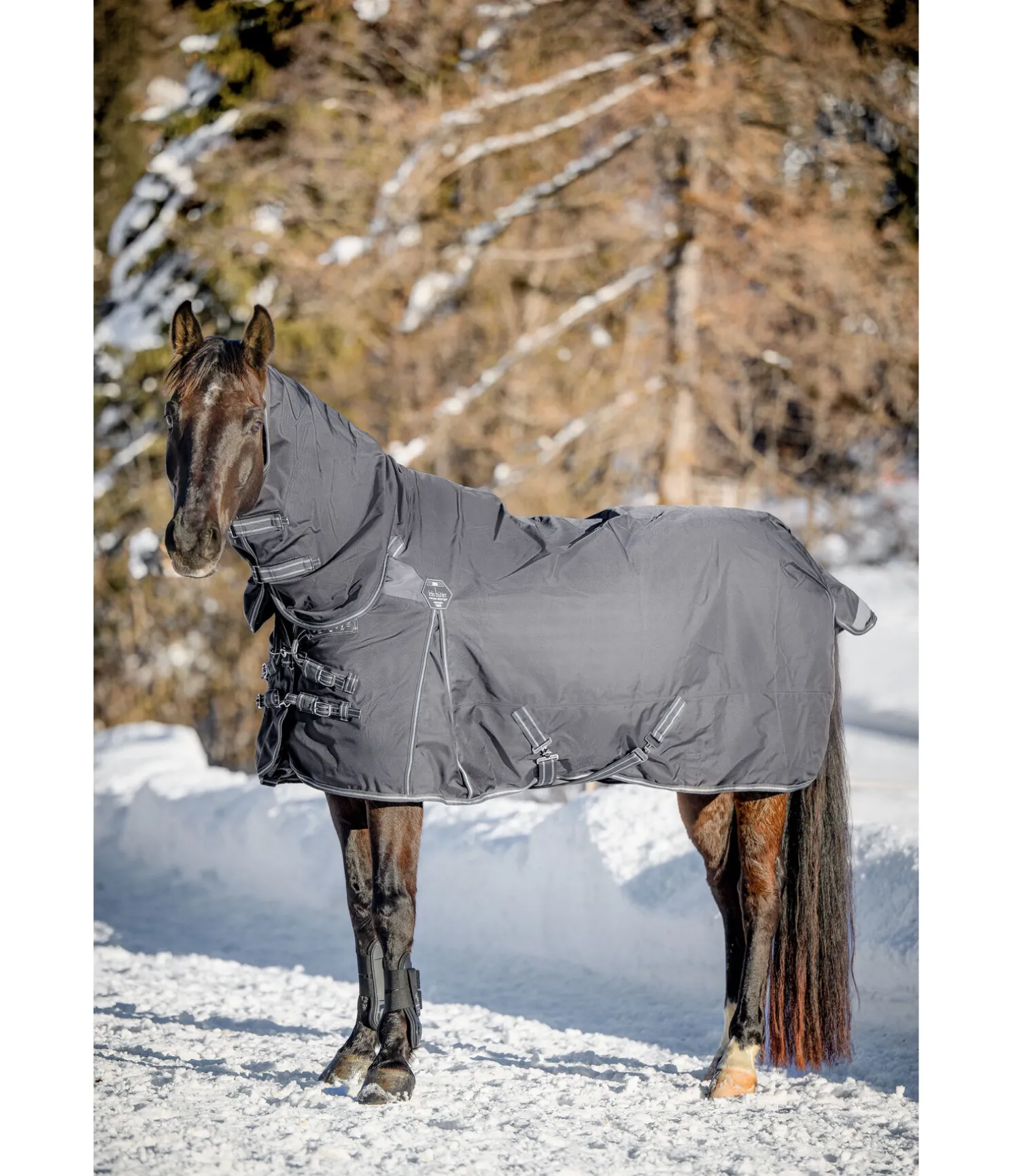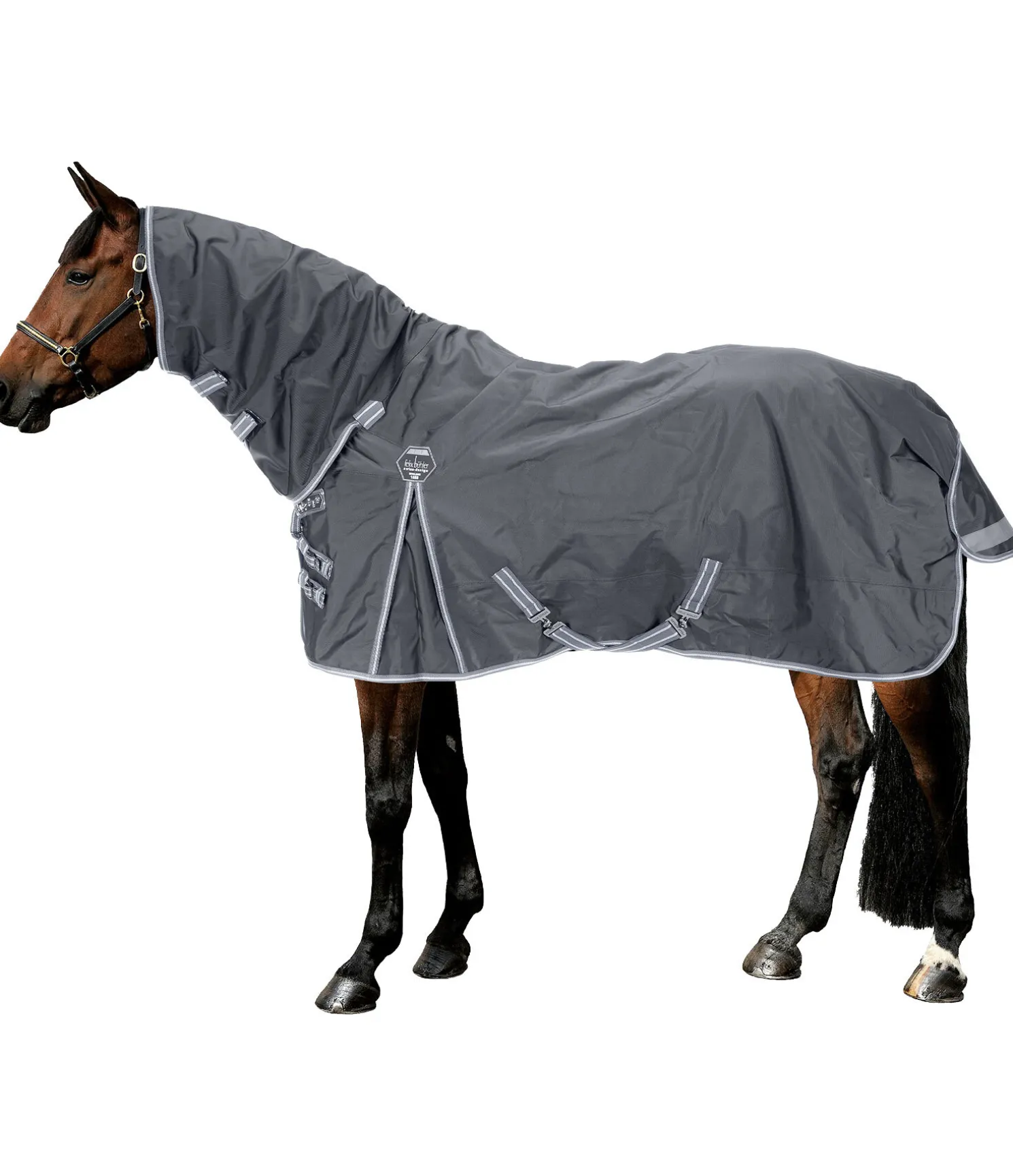 Couverture d’extérieur technique avec couvre-cou, particulièrement polyvalente et résistante à la déchirure. Matière nylon 1 680 deniers, très imperméable (5 000 mm), avec garnissage léger de 50 g et une très bonne respirabilité qui protège efficacement votre cheval contre les intempéries. Le couvre-cou est cousu à la couverture. Comparé au polyester, le nylon est nettement plus doux et soyeux et présente des reflets satinés. De plus, il est beaucoup plus extensible que le polyester ce qui lui donne une meilleure résistance à la déchirure. Les empiècements extensibles et très déperlants en softshell au niveau des épaules et de l’encolure et les grands plis d’aisance permettent une liberté de mouvement optimale et garantissent un ajustement parfait tout en permettant d’éviter les habituels points de pression. Rembourrage généreux pour minimiser davantage les points de pression au niveau du garrot. Fermeture de poitrail réglable équilibrée en 3 points, constituée de 2 mousquetons et de 2 anneaux ainsi que d’une patte auto-agrippante supplémentaire améliorée. Les mousquetons peuvent être facilement remplacés si nécessaire. Doublure lisse protégeant la robe. Sursangles croisées réglables et anneaux permettant la fixation de courroies de cuisses (non incluses). Courroie de queue réglable et rabat de queue avec bandes et passepoil réfléchissants sur le pourtour. Matière extérieure 100 % nylon, doublure 100 % polyester.