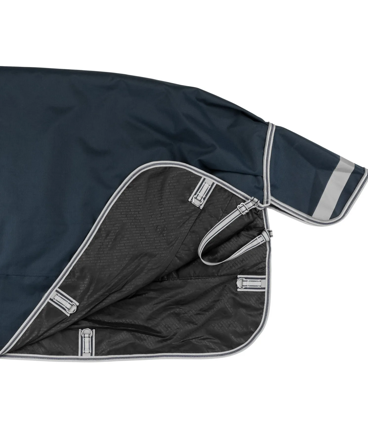 Chemise d’extérieur de grande qualité dans une coupe Highneck protectrice, en matière Ripstop 1.200 deniers particulièrement imperméable (5.000 mm), qui protège efficacement en cas d’averse. Garnissage 200g chaud. Les nombreux éléments réfléchissants tels que le passepoil en bordure et les bandes sur le poitrail, l’arrière-main et le rabat de queue assurent une bonne visibilité et une sécurité optimale. Double fermeture de poitrail équilibrée en plusieurs points avec patte auto-agrippante supplémentaire, sursangles croisées réglables. Doublure lisse protégeant la robe. Anneaux permettant la fixation de courroies de cuisses (non incluses). Rabat de queue et courroie de queue réglable. 100 % polyester.