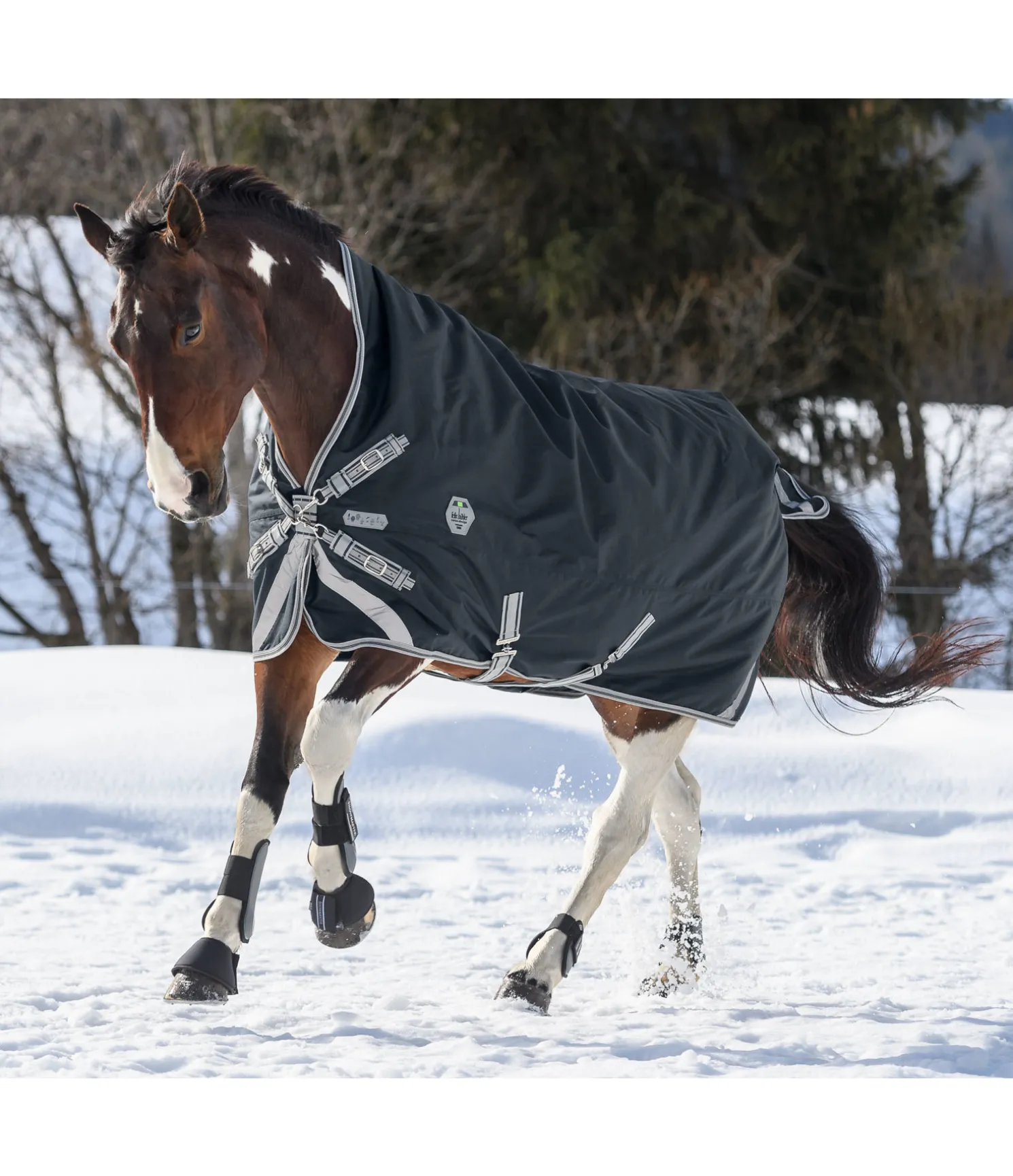 Chemise d’extérieur de grande qualité dans une coupe Highneck protectrice, en matière Ripstop 1.200 deniers particulièrement imperméable (5.000 mm), qui protège efficacement en cas d’averse. Garnissage 350 g chaud. Les nombreux éléments réfléchissants tels que le passepoil en bordure et les bandes sur le poitrail, l’arrière-main et le rabat de queue assurent une bonne visibilité et une sécurité optimale. Double fermeture de poitrail équilibrée en plusieurs points avec patte auto-agrippante supplémentaire, sursangles croisées réglables. Doublure lisse protégeant la robe. Anneaux permettant la fixation de courroies de cuisses (non incluses). Rabat de queue et courroie de queue réglable. 100 % polyester.