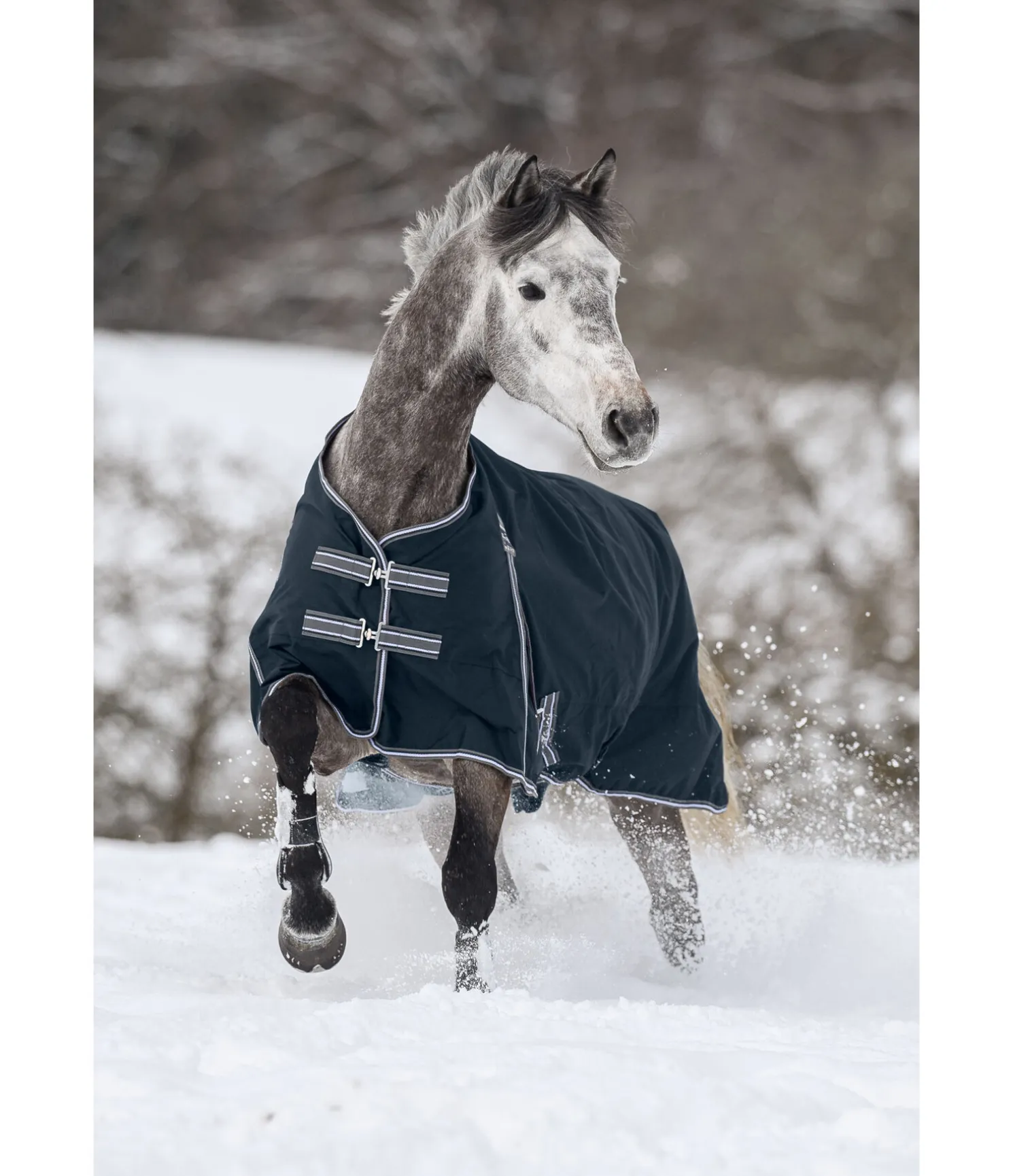 Couverture d’extérieur classique. Imperméable (3.000 mm). En matière Ripstop résistante 600 deniers avec garnissage 100g. Avec plis d’aisance pour une liberté de mouvement optimale, double fermeture de poitrail avec crochets en T et patte auto-agrippante supplémentaire, sursangles croisées réglables et rabat de queue. Anneaux permettant la fixation de courroies de cuisses (non incluses), courroie de queue réglable incluse. Pad de garrot permettant d’éviter les pressions et irritations dues aux frottements. Doublure lisse protégeant la robe. 100 % polyester.