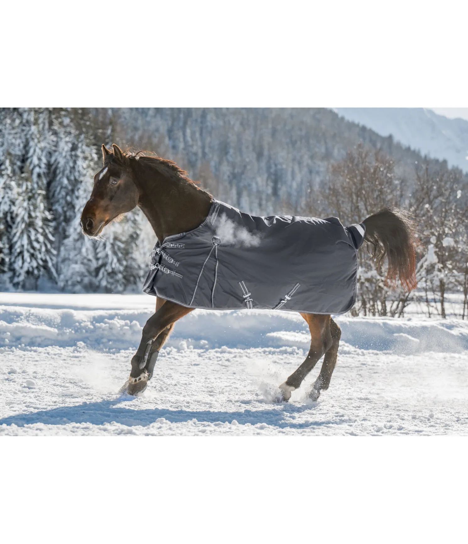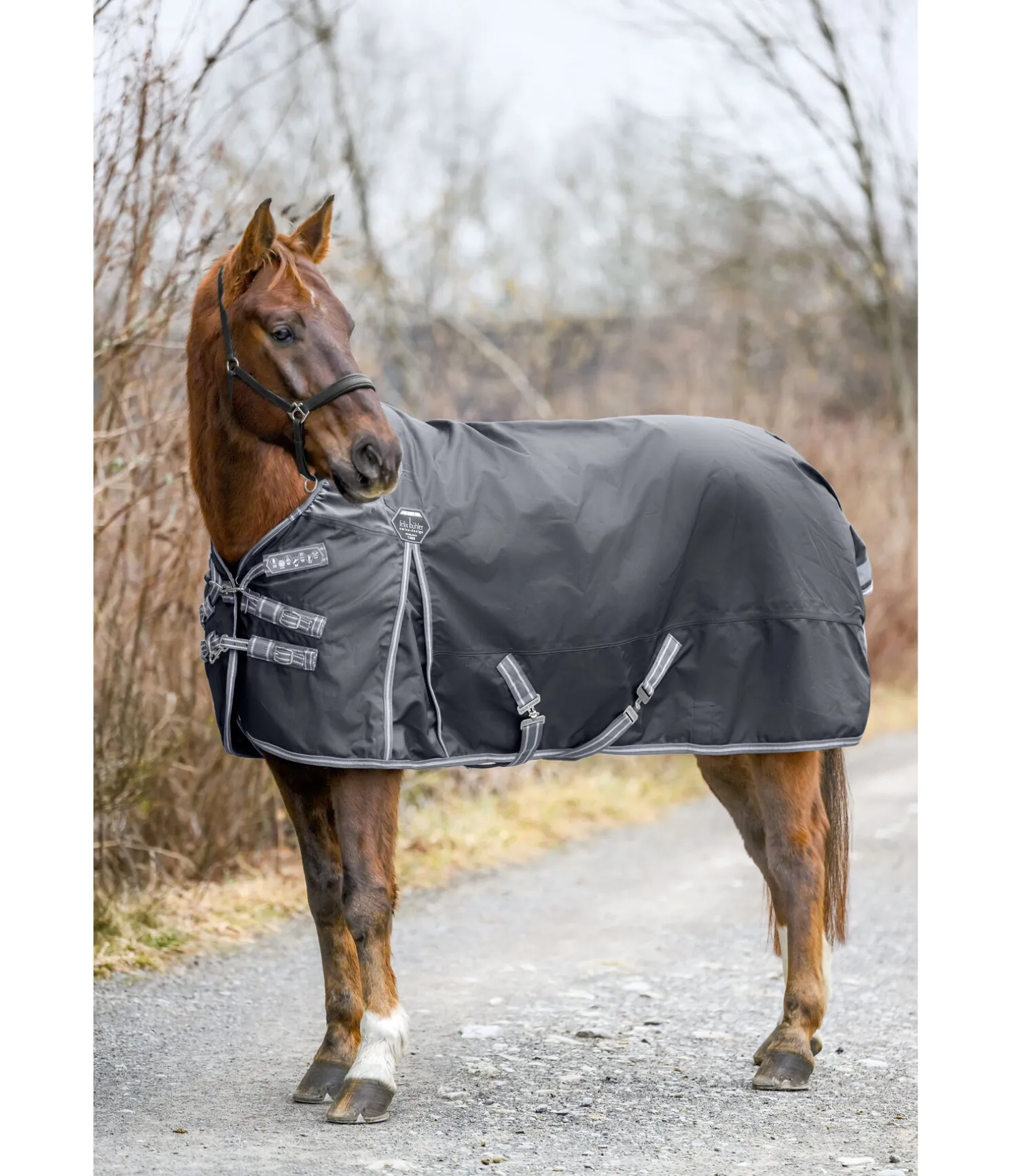 Couverture d’extérieur fonctionnelle et polyvalente dans une coupe classique (Regularneck). Matériau 1 680 deniers particulièrement résistant. Grande imperméabilité (colonne d’eau 5.000 mm). Comparé au polyester, le nylon est nettement plus doux et présente des reflets satinés. Matière beaucoup plus extensible que le polyester pour une meilleure résistance à la déchirure. Garnissage de 100 g. Inserts extensibles et déperlants en softshell au niveau des épaules et de l’encolure. Grands plis d’aisance pour une liberté de mouvement optimale afin d’éviter les pressions. Rembourrage intérieur généreux pour minimiser davantage les pressions au niveau du garrot. Fermeture de poitrail réglable équilibrée en 3 points, constituée de 2 anneaux et mousquetons et d’une patte auto-agrippante supplémentaire. Les mousquetons peuvent être facilement remplacés si besoin. Doublure lisse protégeant la robe. Sursangles croisées réglables et anneaux permettant la fixation de courroies de cuisses (non incluses). Courroie de queue et rabat de queue réglables en longueur avec bandes et passepoil réfléchissants sur le pourtour. Inclus des fixations supplémentaires pour un couvre-cou optionnel (article 422 669).