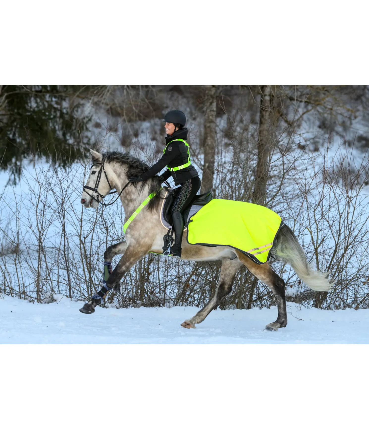 Couvre-reins d’extérieur particulièrement léger (300 deniers),en matière imperméable (3.000 mm) et respirante (3.000 g/m2/24h). Assure une excellente protection contre le vent et l’humidité sans pour autant restreindre les mouvements. Offre une visibilité accrue grâce à sa couleur et aux nombreux éléments réfléchissants. Certifié EN ISO 20471 (2013). Facile et rapide à mettre en place sur tous les types de selles dotées de contre-sanglons accessibles. Boucles pour fixation rapide aux contre-sanglons et courroie de queue réglable. Doublure intérieure lisse pour protéger la robe. Coupe-vent. 100 % polyester.