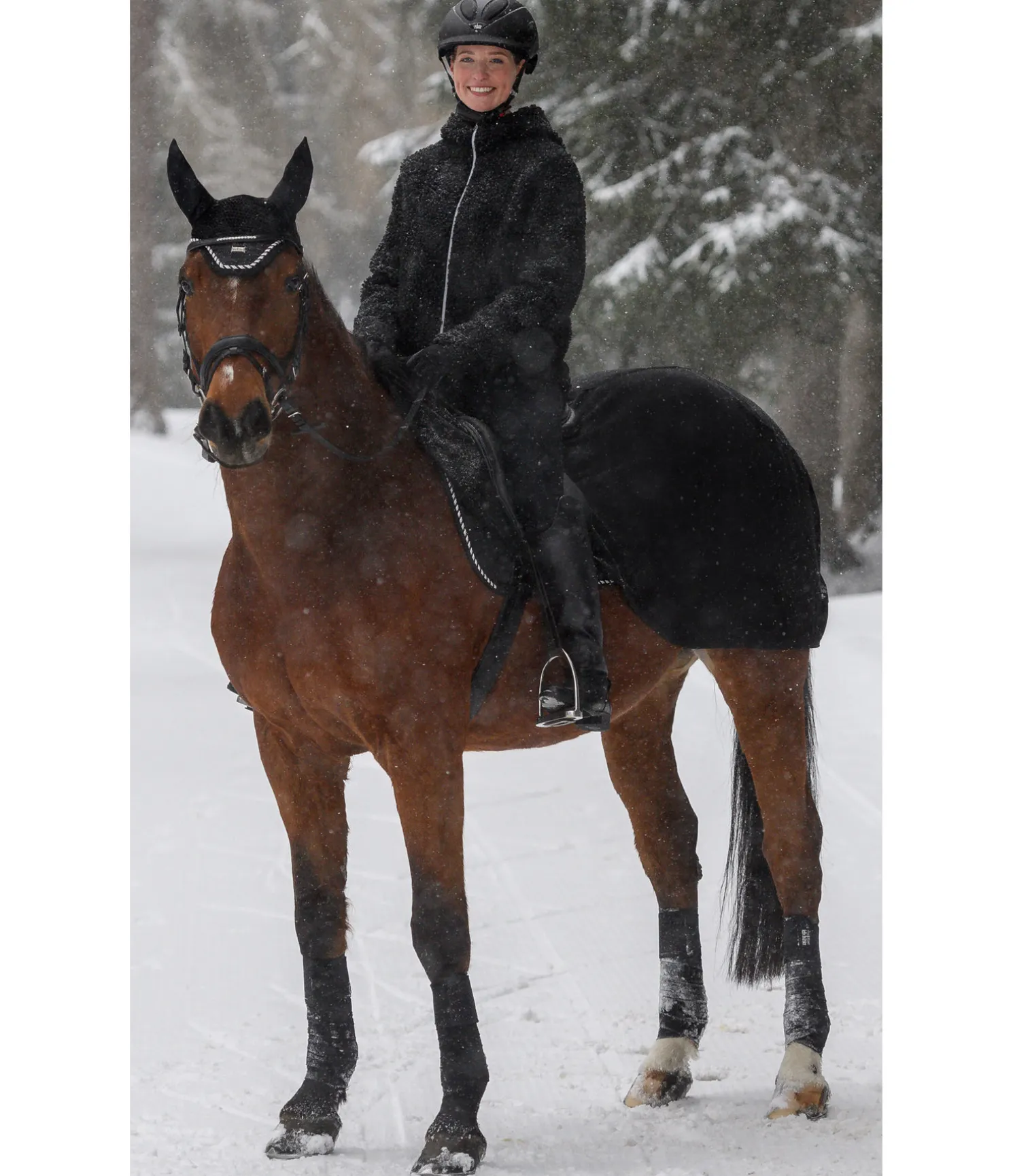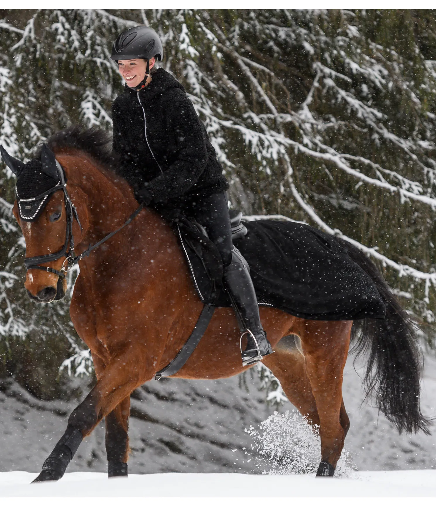 Élégant couvre-reins pour protéger les zones sensibles du froid lors des balades et échauffements en hiver avec découpe pour selle anglaise. Large patte auto-agrippante doublée de polaire Teddy devant la selle, pour une mise en place rapide et un maintien sûr. Arrière-main gauche ornée de jolis strass scintillants. Courroie de queue réglable incluse. 100 % polyester.