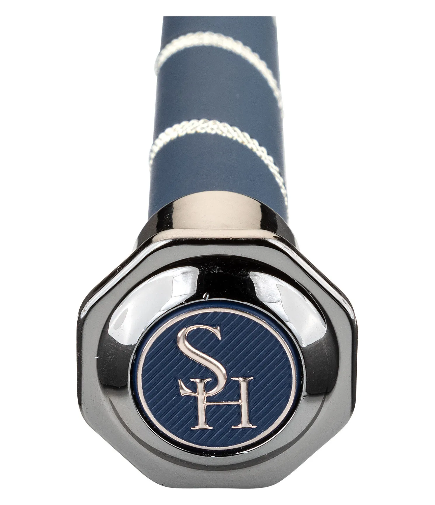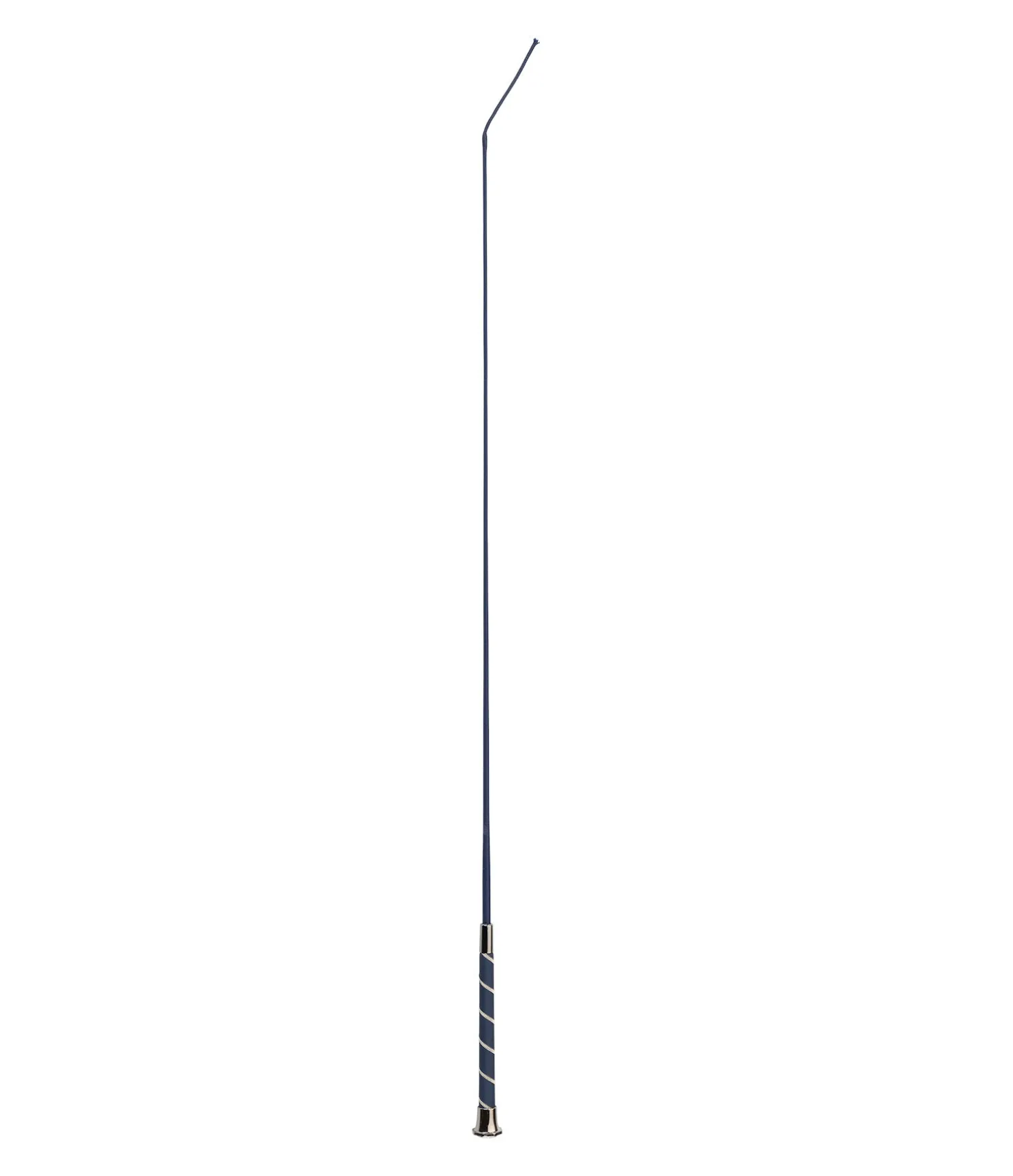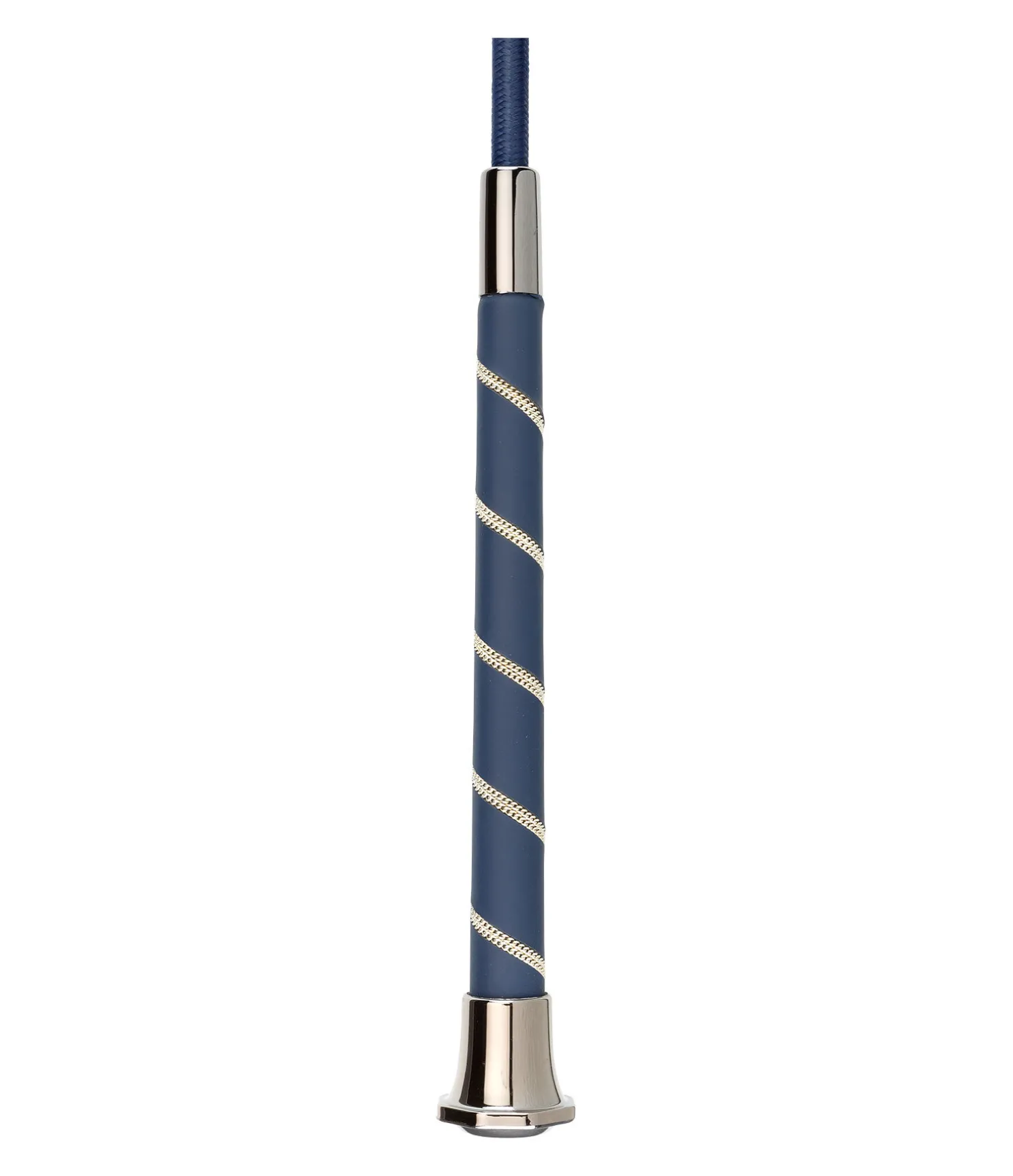Cravache de dressage élégante avec poignée décorée d’un cordon torsadé argenté. Pommeau hexagonal avec badge logo. Tige en fibre de verre avec revêtement en nylon.