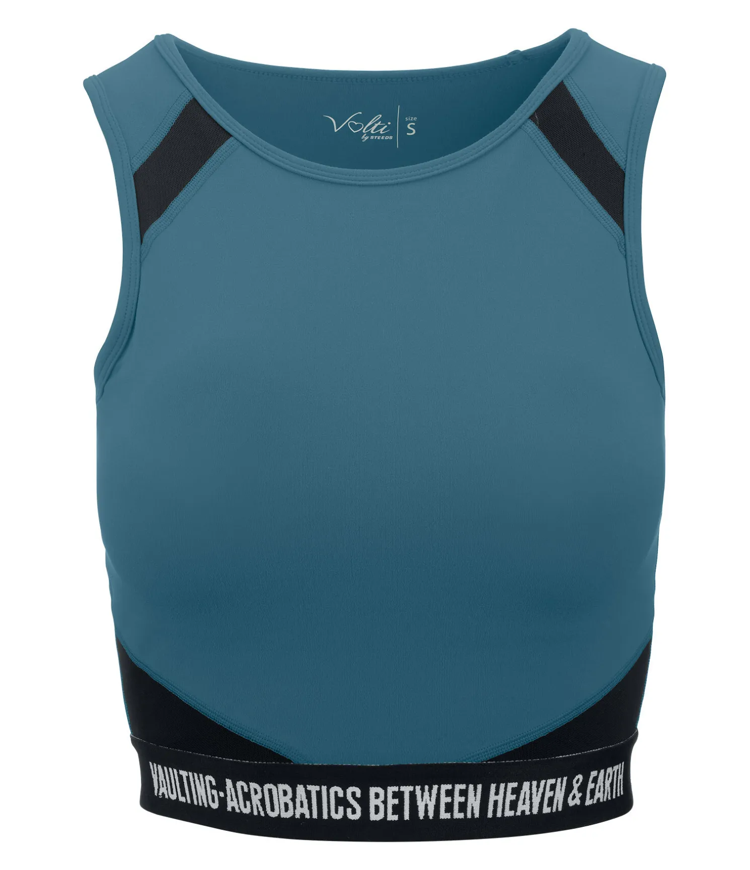 Crop top près du corps avec larges bretelles. Inserts en mesh, au niveau des côtes et des épaules, favorisant la circulation de l’air. Matière respirante et à séchage rapide. Brassière de sport intégrée avec coques amovibles pour un maintien optimal. Il est conseillé de retirer les coques avant le lavage. Bande élastiquée à la taille avec inscription brodée « Vaulting – Acrobatics between heaven & earth ». Découpe croisée travaillée dans le dos. 88 % polyester, 12 % élasthanne (carbone chiné) et 78 % polyester, 22 % élasthanne (aquamarine).