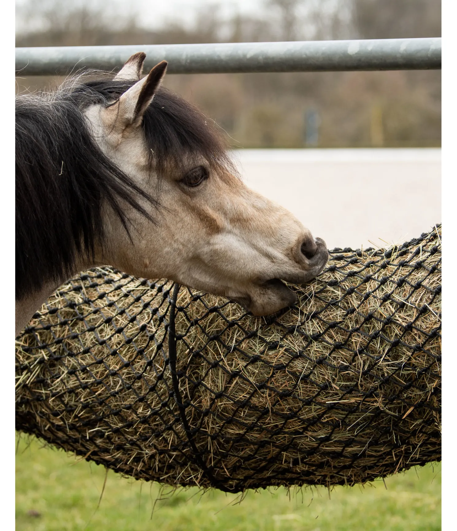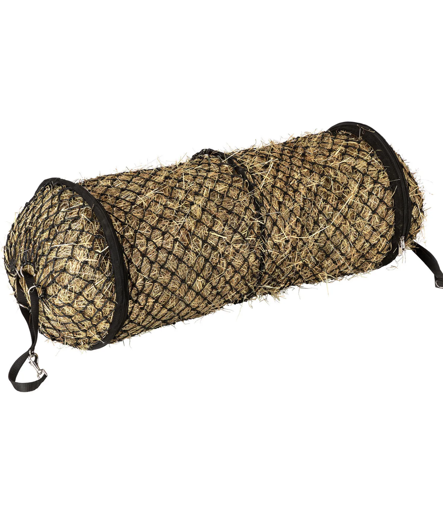 Le cylindre à foin peut être suspendu horizontalement ou verticalement pour utiliser moins d’espace, par exemple dans un coin du box. Un anneau métallique à chaque extrémité et au milieu assure sa solidité et permettent un remplissage facile. S’ouvre via une fermeture à glissière de chaque côté, ce qui permet d’y charger jusqu’à 9 kg de foin. Longueur 1,5m, diamètre 0,5m, mailles 5×5 cm.