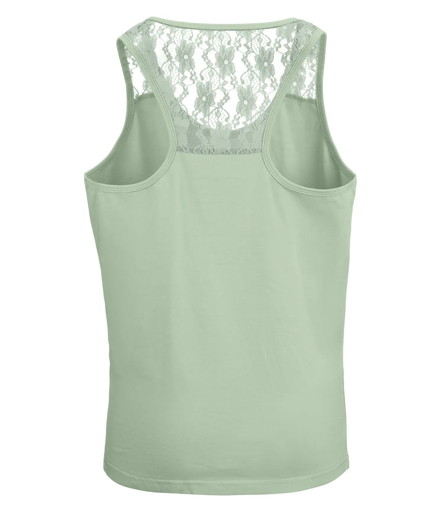 Adorable débardeur pour enfant avec joli insert en dentelle aux épaules et dans le dos. Broderie logo discrète. Matière respirante. 95 % coton, 5 % jersey extensible.
