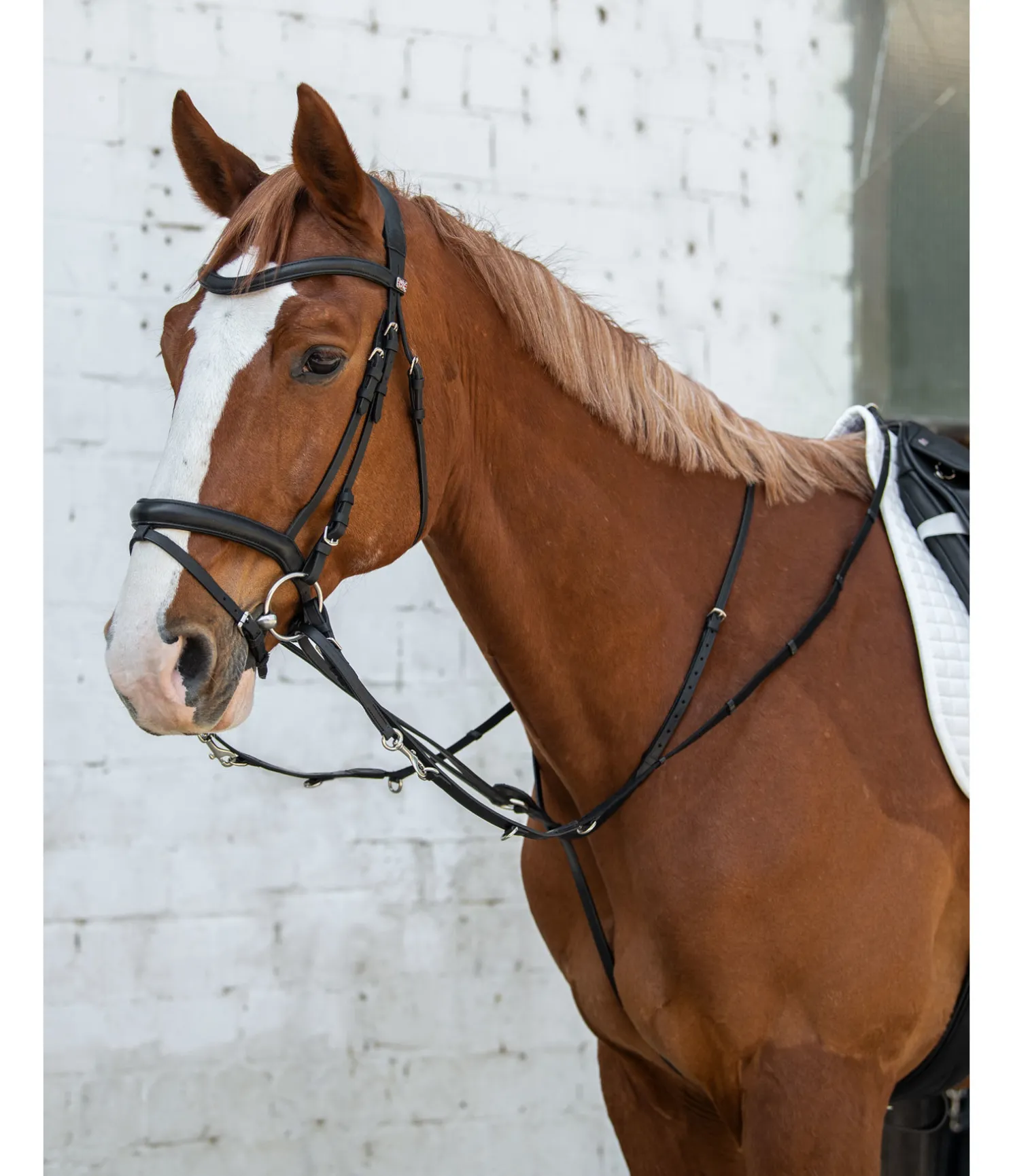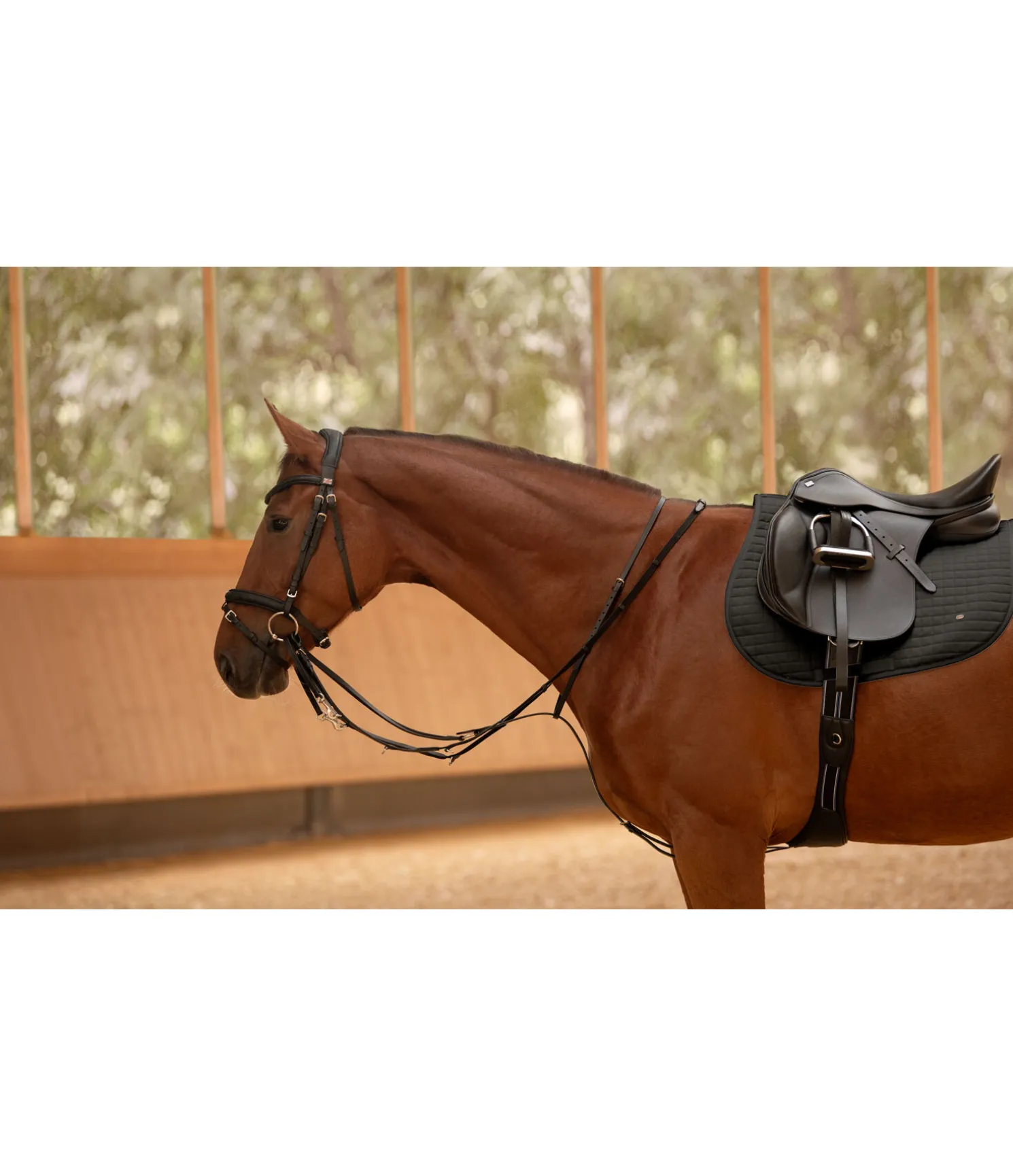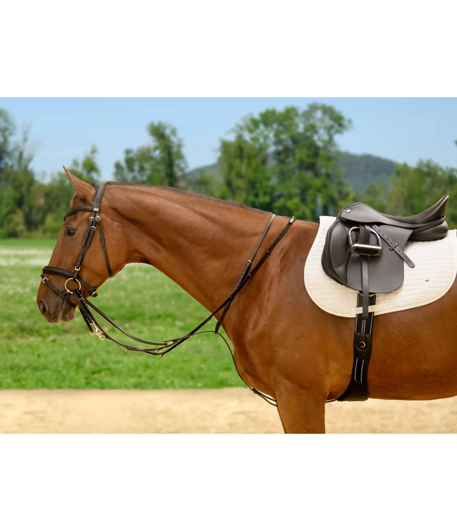 Combinaison de martingale en cuir avec fourche allongée et mousquetons aux extrémités avec rênes dotés de 3 anneaux semi-circulaires fixes permettant différents réglages. Empêche le cheval de lever trop la tête, sans toutefois limiter sa liberté de mouvement, car le cavalier peut lâcher les rênes à sa guise et n’est pas limité par des rênes fixes. En cuir véritable.