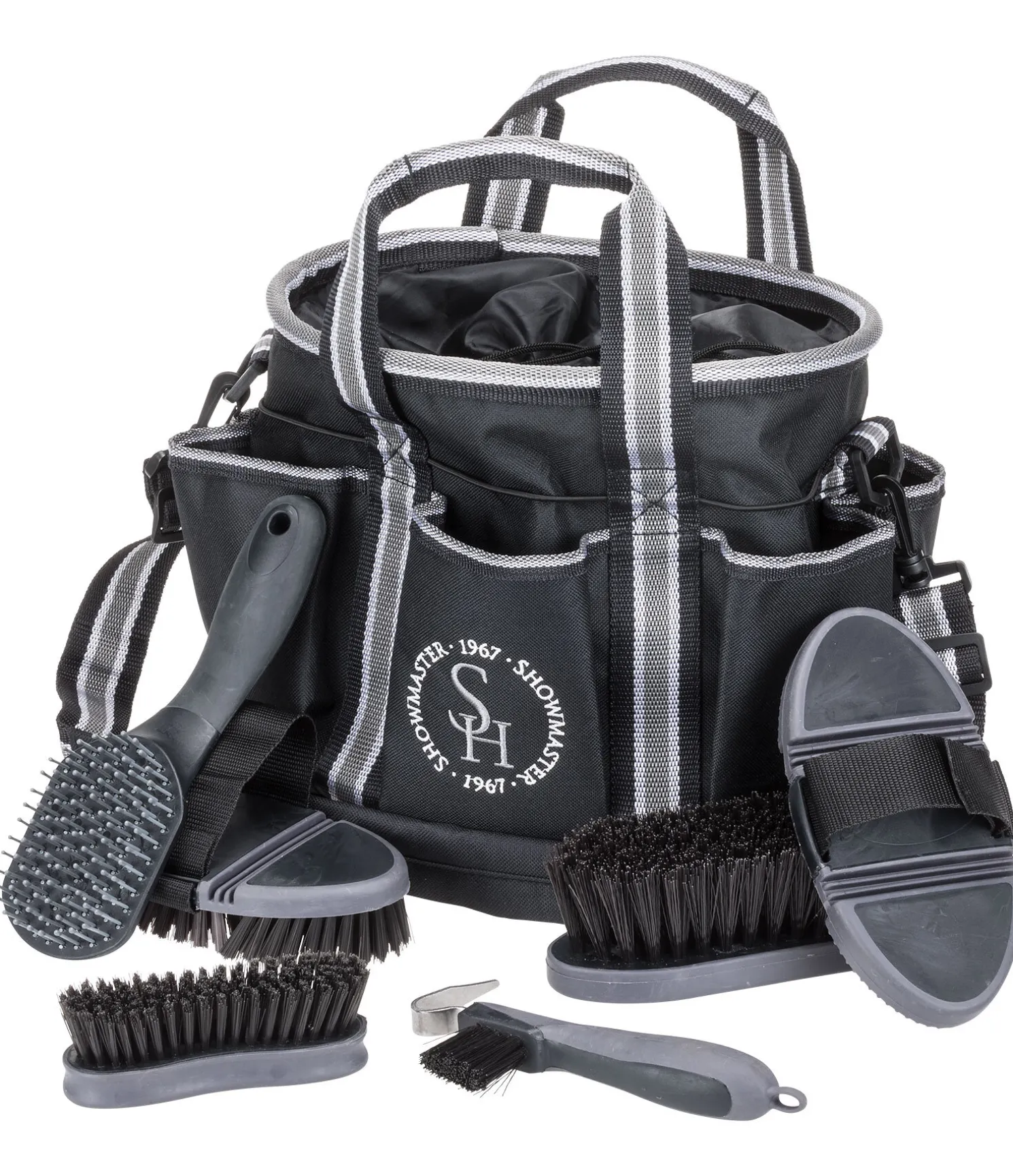Ensemble composé d’un sac de pansage en tissu anti-taches contenant : brosse de pansage, bouchon, brosse pour sabots, brosse douce, brosse pour crinière et queue, cure-pieds. Sac de pansage avec 6 poches extérieures, 2 anses et une bandoulière amovible. Refermable par le haut au moyen d’un cordon de serrage. 28 x 18 x 25 cm.