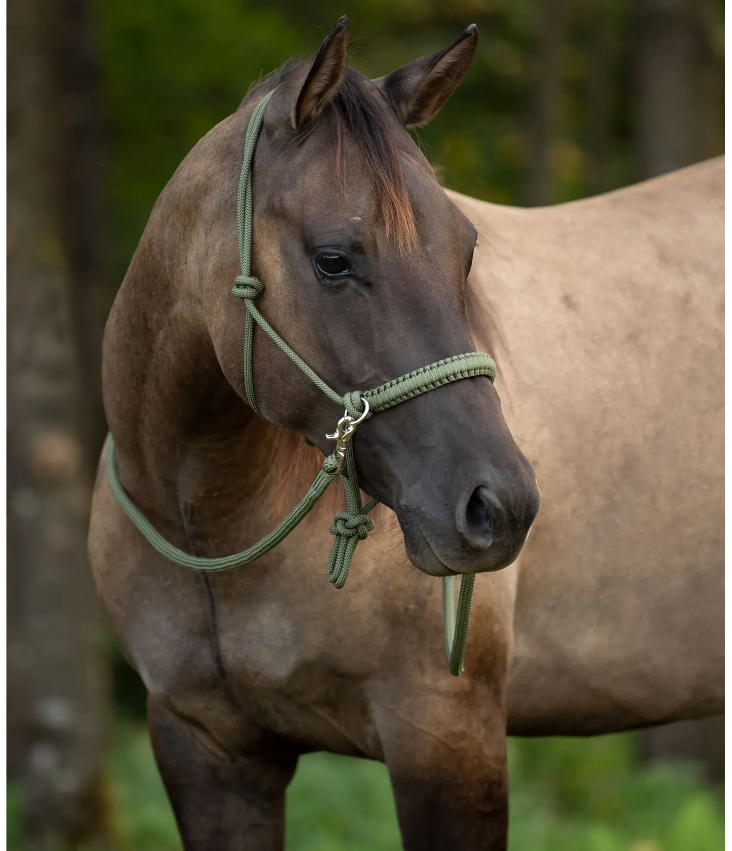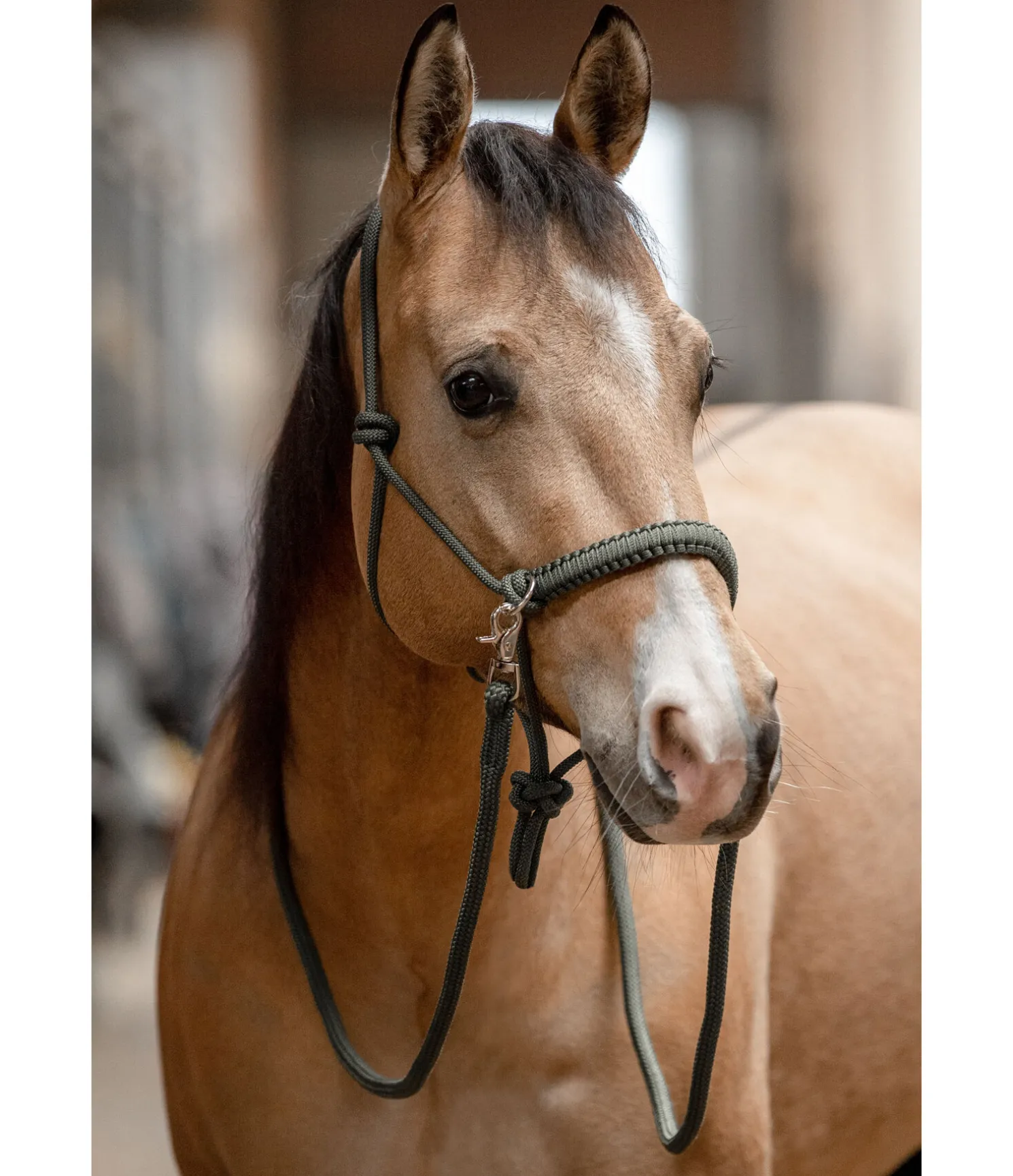 Licol à noeuds haut de gamme. Pour le travail au sol ou monté. En matière souple et résistante. Avec anneaux pour les rênes et muserolle tressée. Épaisseur de la corde 8 mm. Livré avec rênes à mousquetons et longe assorties. Longueur des rênes, mousquetons compris 2,6 m, épaisseur des rênes et de la longe 16 mm. Longueur de la longe 2,4 m.