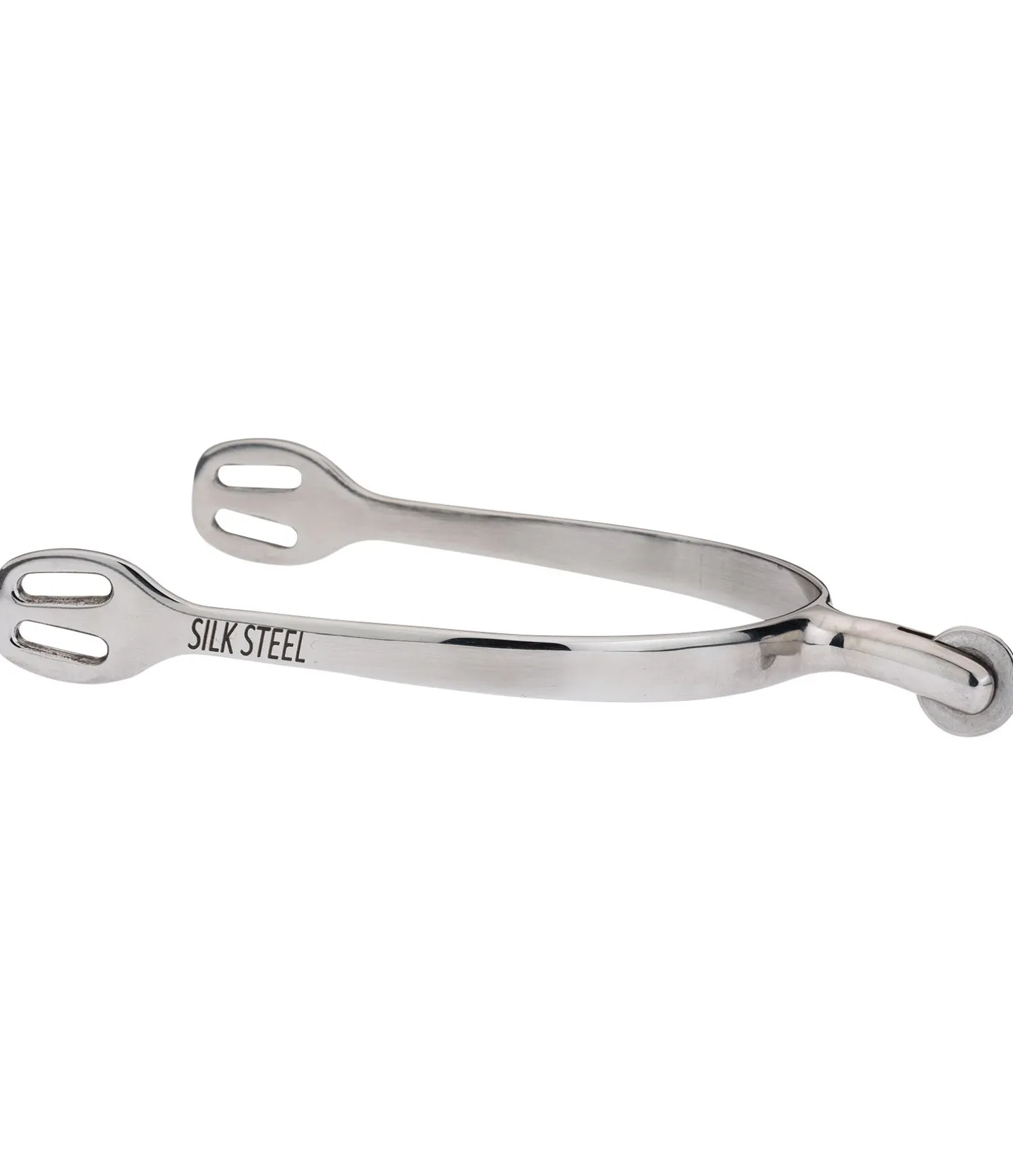 Éperons à molette en acier inoxydable avec gravure du logo SILK STEEL. Forme améliorée des oeillets facilitant le passage des lanières. Tige 25 mm.