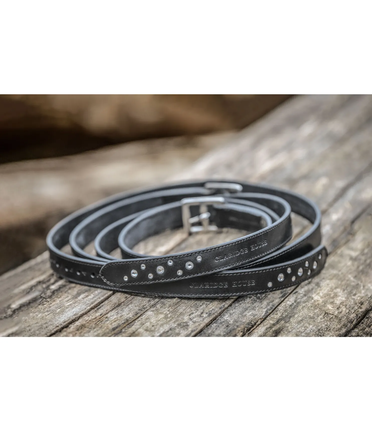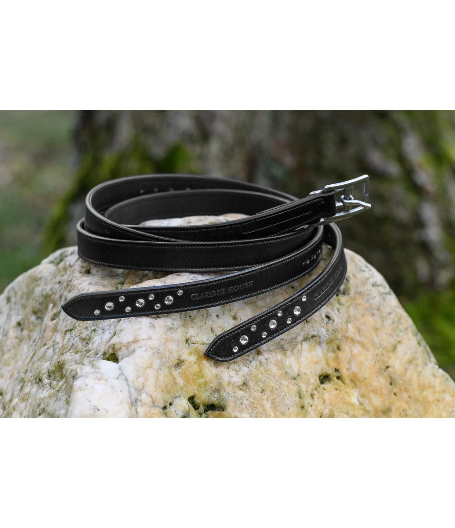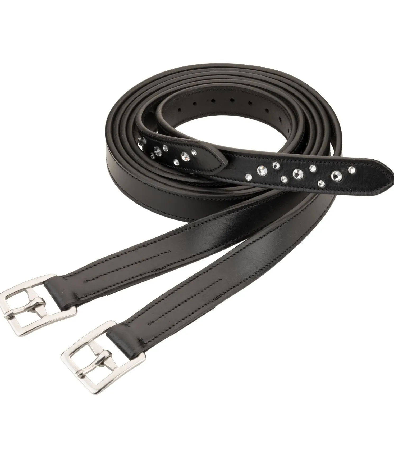 Étrivières en cuir décorées de nombreux strass scintillants. Boucles argentées en acier inoxydable. Largeur 2,55 cm. Vendues par paire.