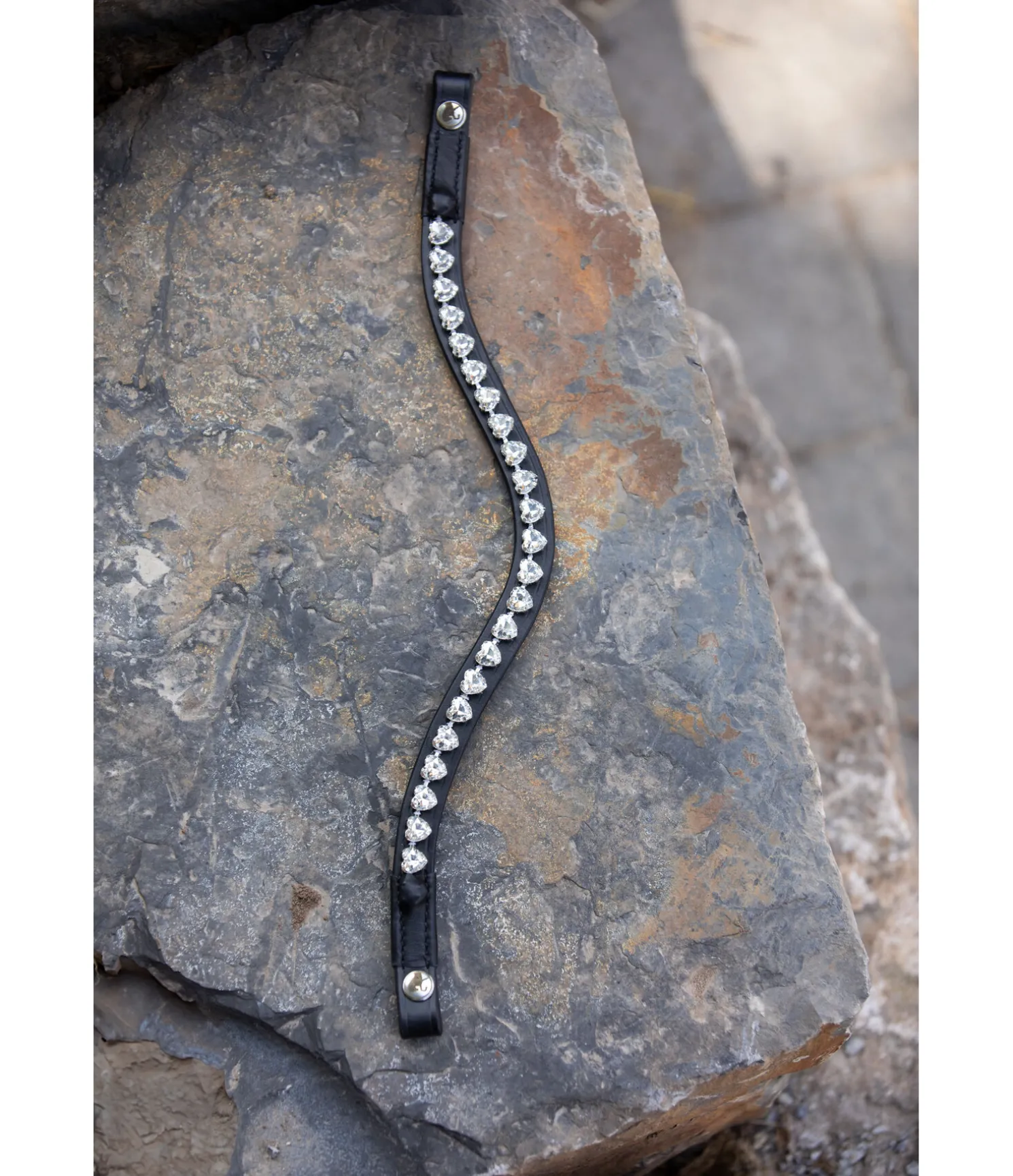 Frontal vague avec strass en forme de coeur. Boutons-pression latéraux pour une fixation rapide et facile. Cuir véritable.