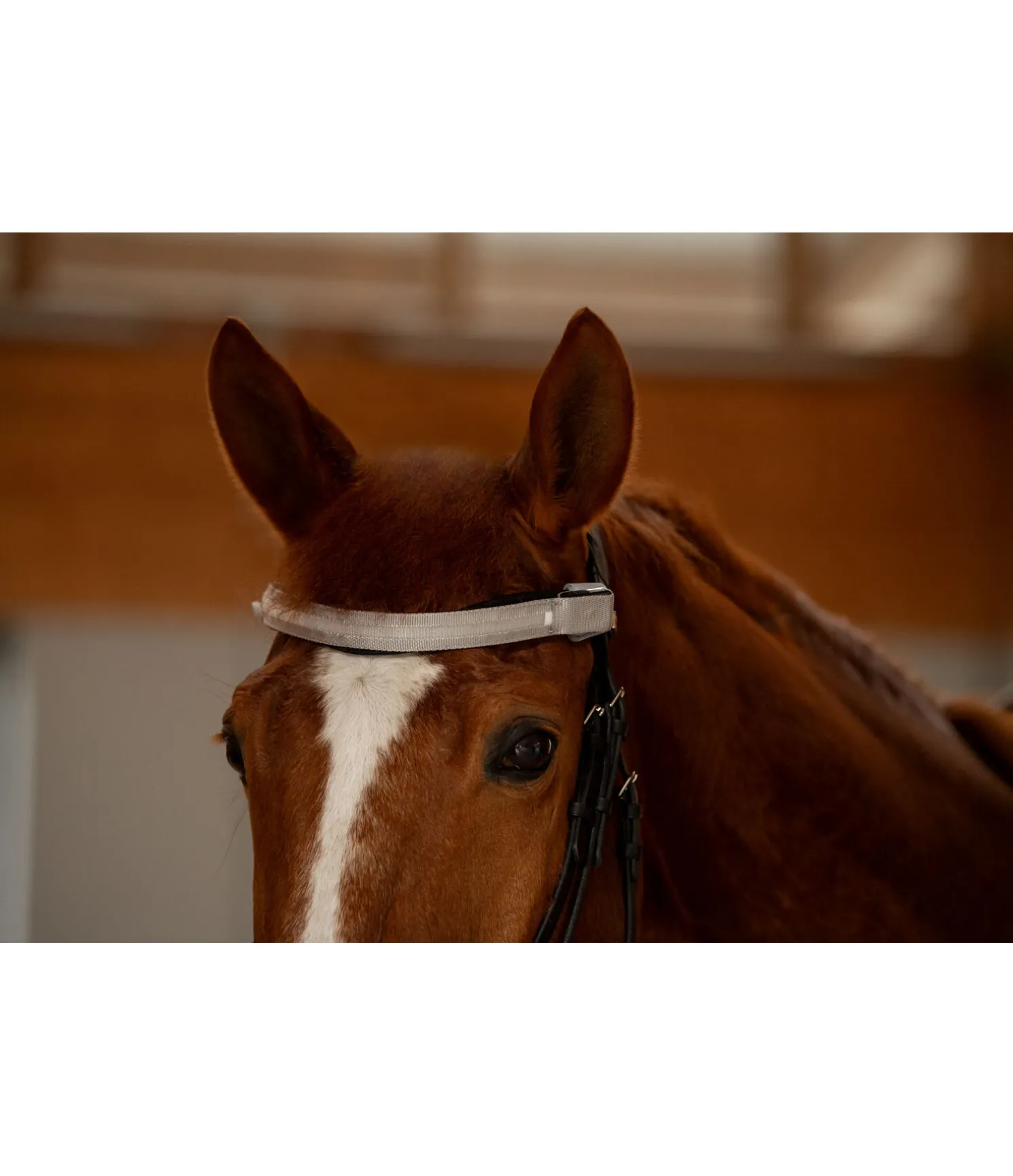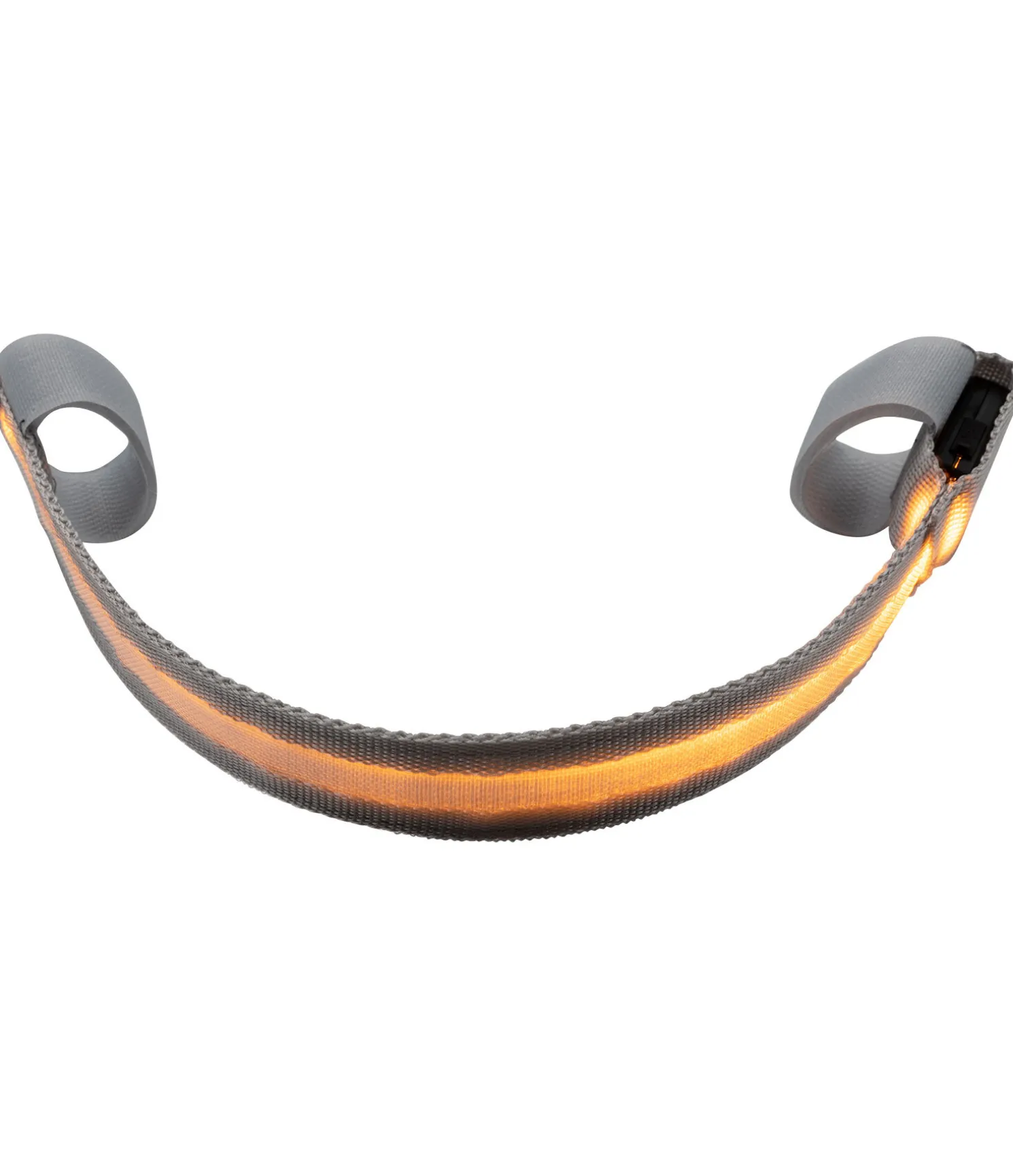 Frontal lumineux à intégrer au licol ou au bridon avec trois fonctions lumineuses différentes. Rechargeable par USB. 33 x 2,5 cm.