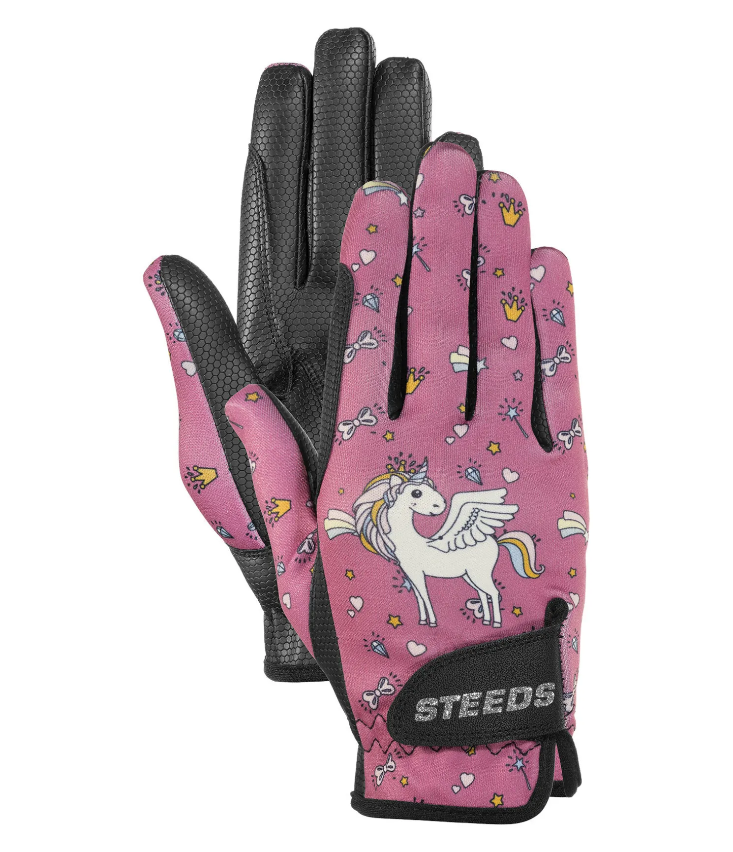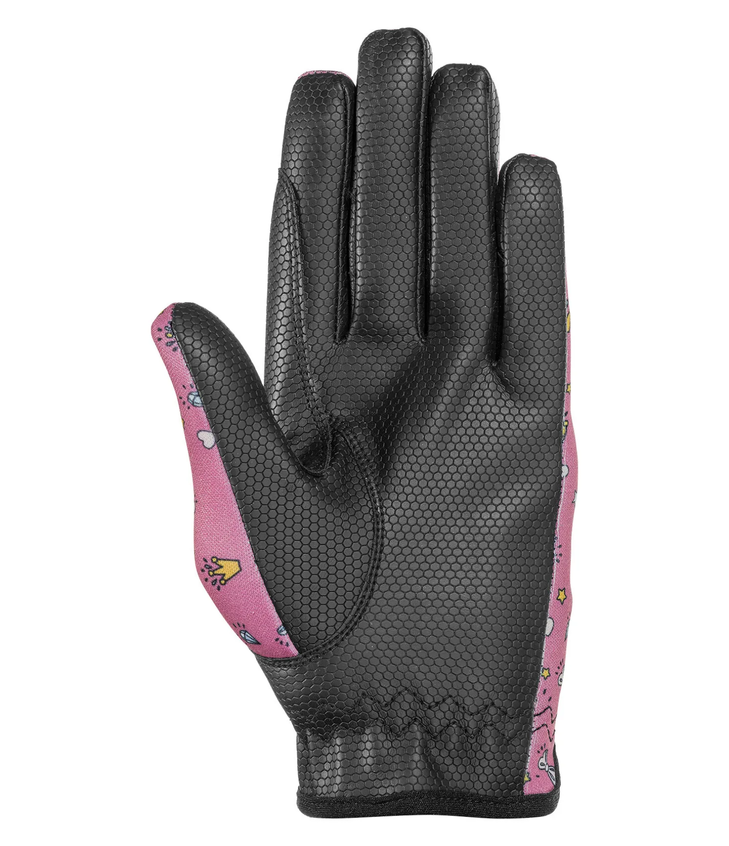 Gants d’équitation d’été extensibles. Matière respirante. Motif licorne coloré. Logo scintillant sur la patte auto-agrippante. Renfort de rêne sur l’index pour éviter les irritations dues aux frottements. Dessus de main 90 % polyester, 10 % élasthanne. Paume 80 % polyuréthane, 20 % polyester.