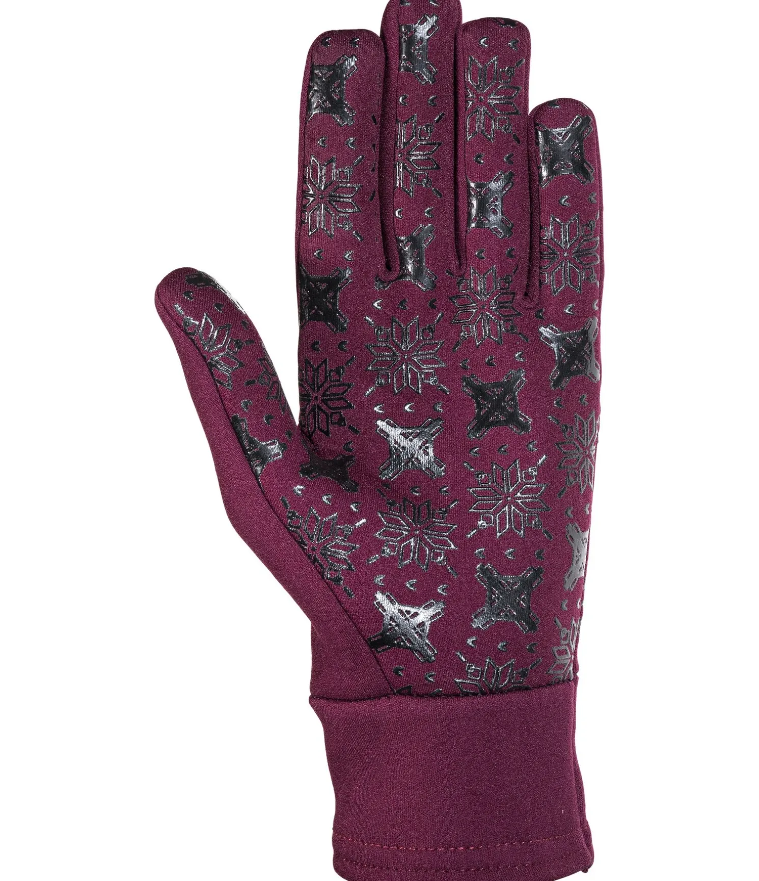 Gants d’équitation sportifs en polaire douce, également adaptés aux journées très froides. Paume avec imprimé flocon de neige. Dessus 100% nylon, intérieur 100% polyester.