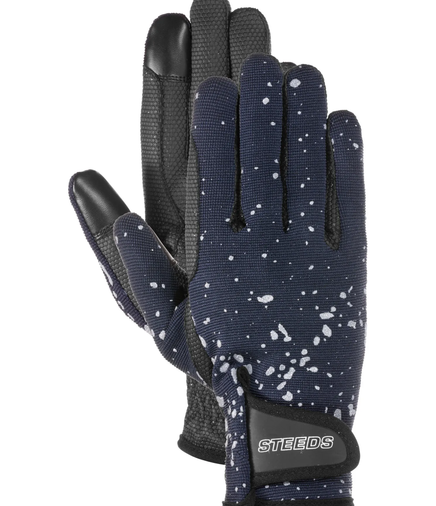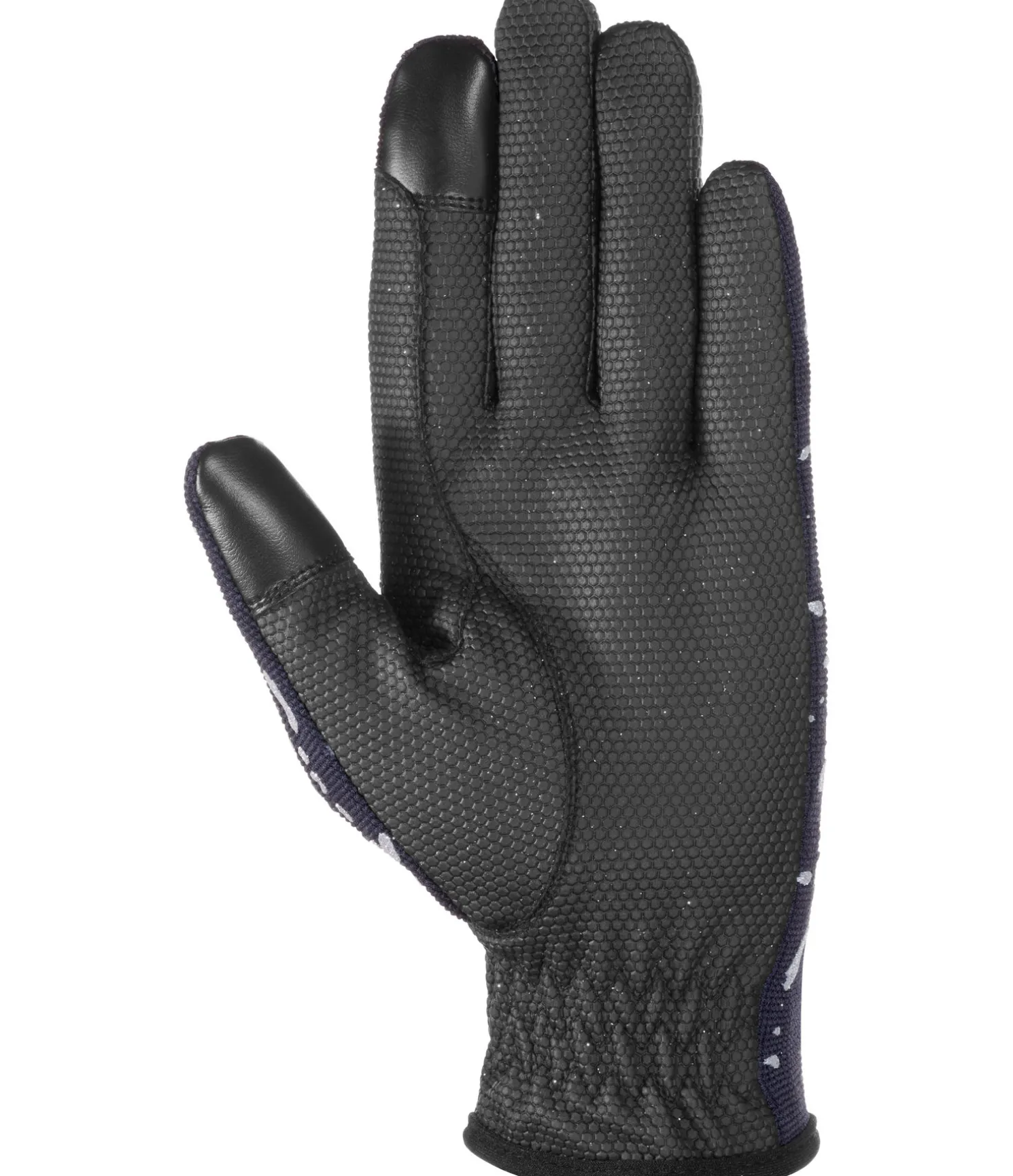 Gants d’équitation d’hiver chics avec imprimé pailleté argenté et dos de la main extensible. Doublure polaire chaude et poignets élastiqués avec patte auto-agrippante. Dessus 80 % nylon, 20 % élasthanne. Paume 80 % polyuréthane, 20 % polyester. Doublure 100 % polyester.