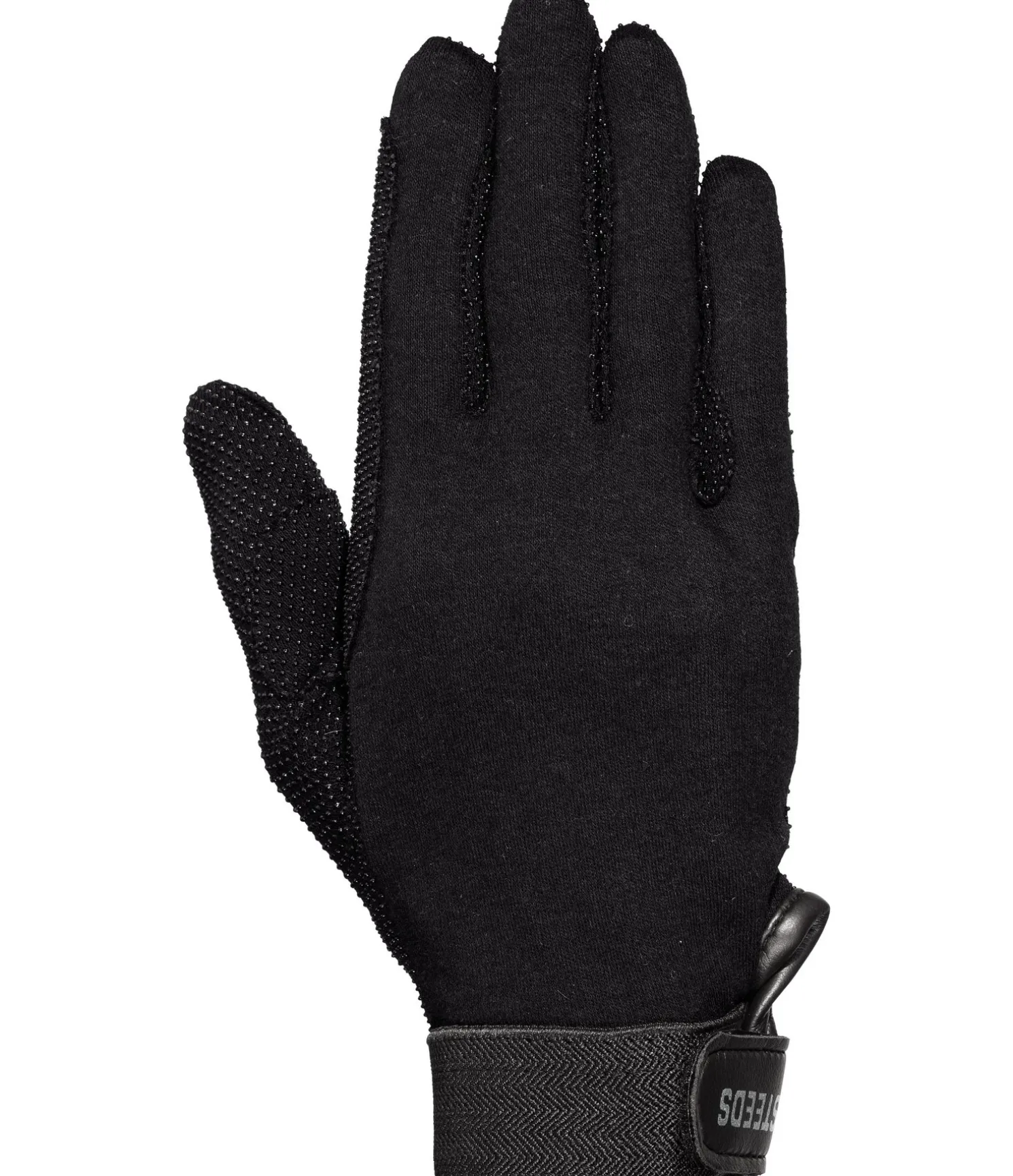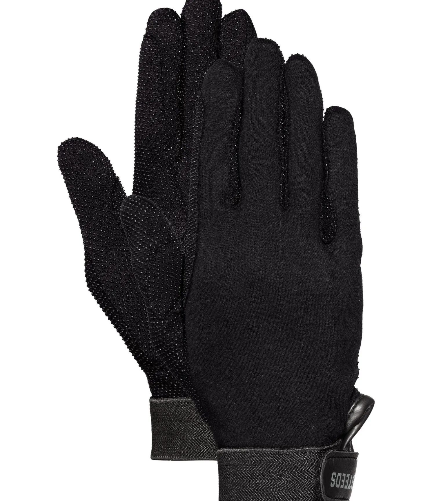 Parfaits gants d’équitation en coton 100 % respirant. Paumes et doigts avec picots PVC. Renforts de rênes. Poignets élastiqués avec patte auto-agrippante. 100 % coton.